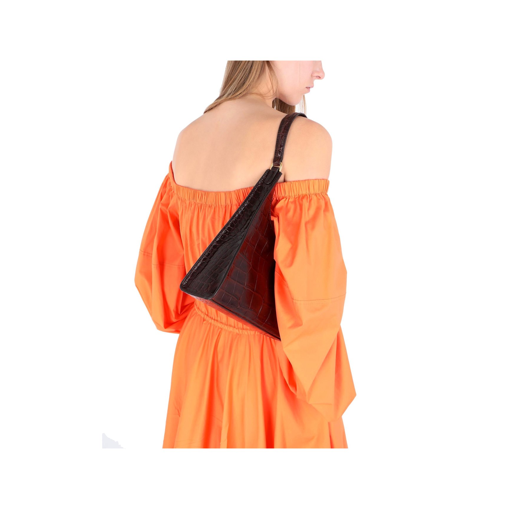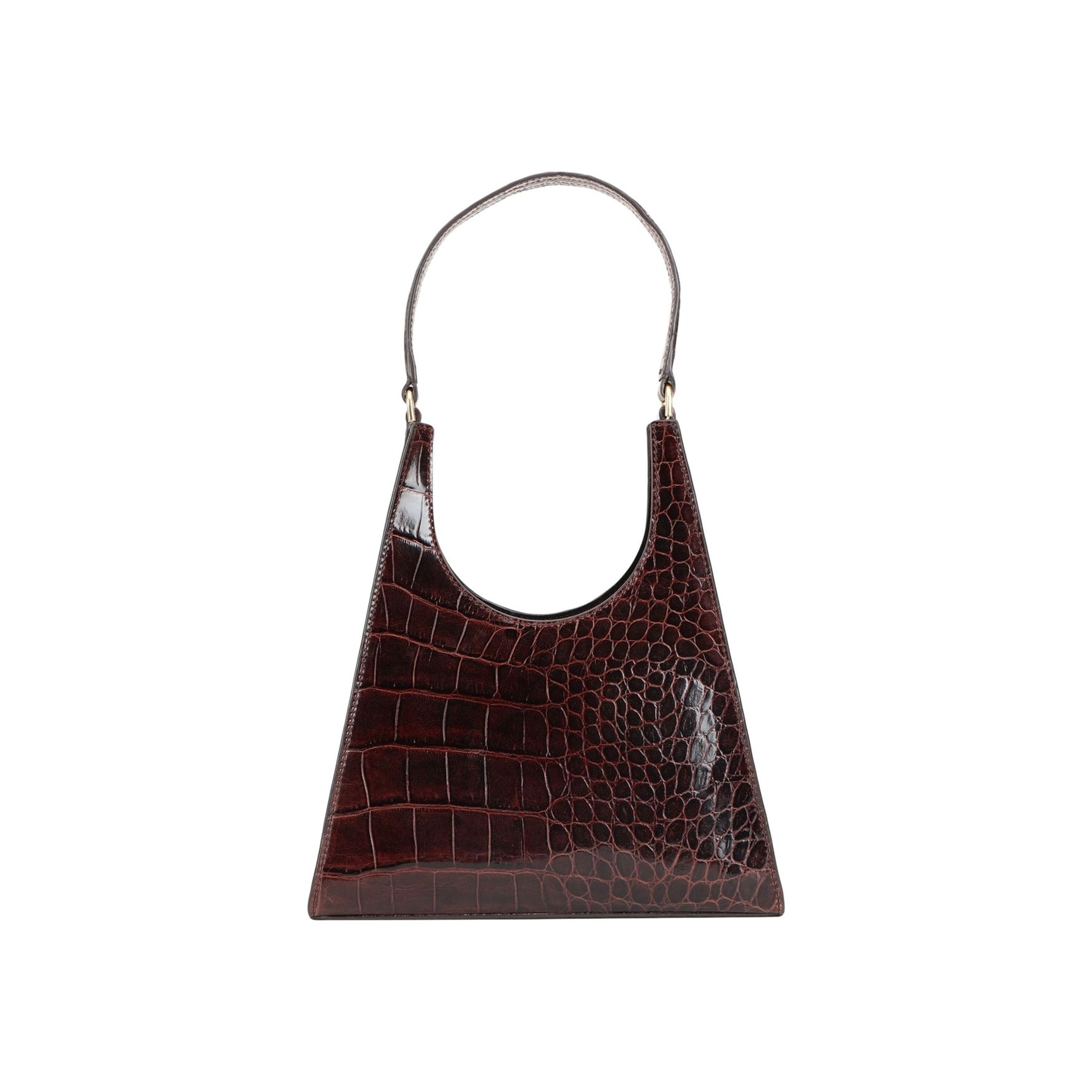 最後はヴィンテージショップにありそうなレトロだけどモダンな「スタウド(STAUD)」のハンドバッグを紹介。やや台形のようなシェイプですが腕にかかる部分はラウンドにカットされているので持ちやすいのも特徴です。濃いブラウンとクロコダイルプリントがクラシックな雰囲気でロングコートやブーツとの相性もぴったり。