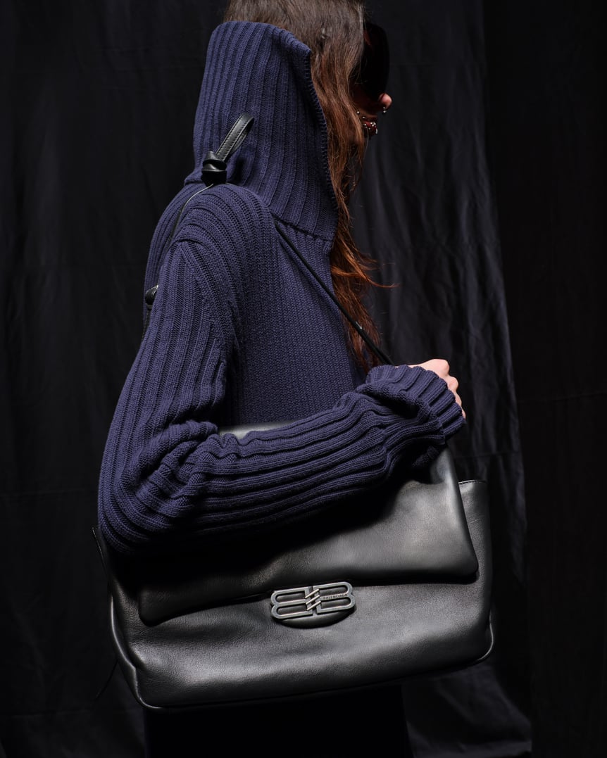 続くデイリーウェアも、デムナが得意とするツイストが効いている。デニムジャケットはシュリンクして縮み、シャツはコルセットの構造を取り入れて極端にタイト。厚手のニットは前後が逆に作られ、ダブルフェイスのカシミアコートは襟がマフラーと一体化。ネイビーのカーディガンはマキシ丈まで伸ばされ、襟は16世紀の貴婦人の装いに見られるメディチカラーに変形していた。