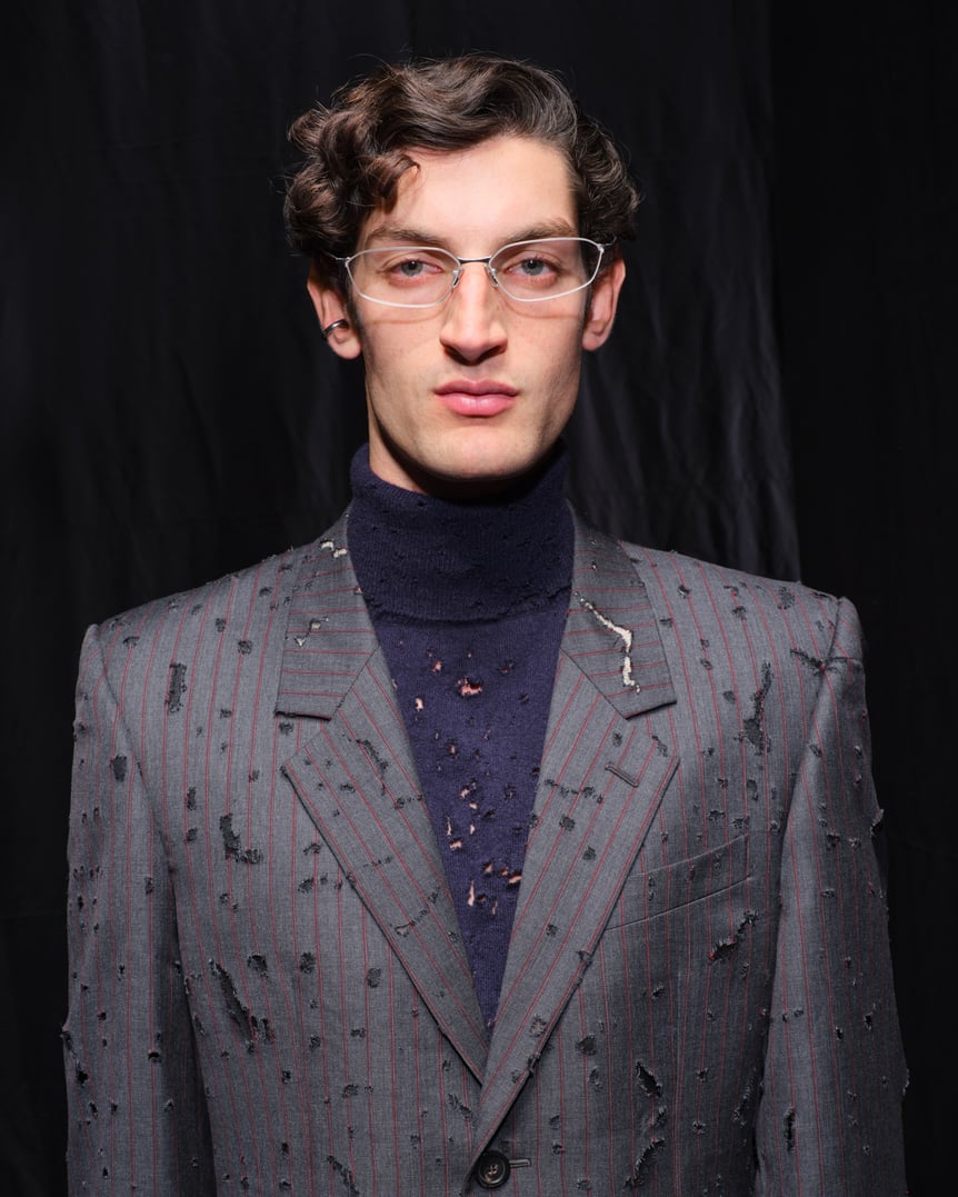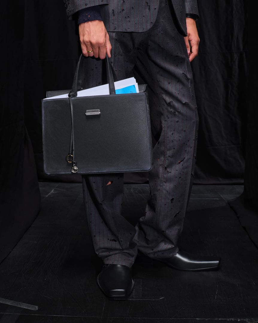 意表をついたのが、ショーの序盤が典型的なビジネスウェアでスタートしたこと。ブラックのジャケット、スラックス、白シャツにネクタイ。オーバーサイズでもなく、極端にタイトなわけでもない。ただ、よく見るとラペルのゴージラインが通常よりも下がっており、ショルダーは前肩で、独特のバランスとなっている。そして徐々に、"普通"ではなくなっていく。シワだらけだったり、ボタンが割れていたり、ブリーフケースは口が開きっぱなし。穴だらけのスーツは、まるで虫に食われたかのよう。