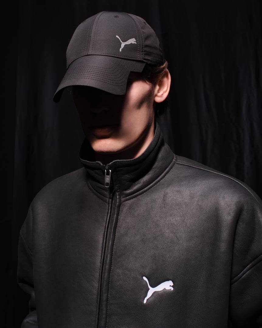 既存のイメージを壊す手法は、豊富なウェアにも見てとれた。サッカーのウォームアップスーツを彷彿とさせるエクストラドライモルトンの機能的なスウェットスーツをはじめ、1990年代のアーカイヴを参照したという色あせたナイロンや、高級感を漂わせるシアリングといった、さまざまな素材のトラックスーツ、そしてバレンシアガならではのバスローブコートはスエード製。キャップやグローブといったアクセサリーにいたるまで、プーマにおける"スタンダード"を引っくり返すように再文脈化する。プーマのロゴマークも左右が逆転し、そのデザインアプローチを示していた。