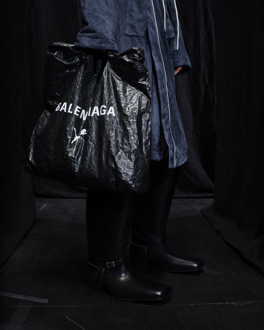人気のスニーカー「スピードキャット」をベースとしたコラボモデル「Balenciaga | PUMA Speedcat Ultrasoft」は、しなやかなスエードを用いてアッパーの構造的要素を取り除き、激しいウォーンアウト加工が施された。プーマを象徴する流線型ライン「フォームストライプ」さえも破壊されている。