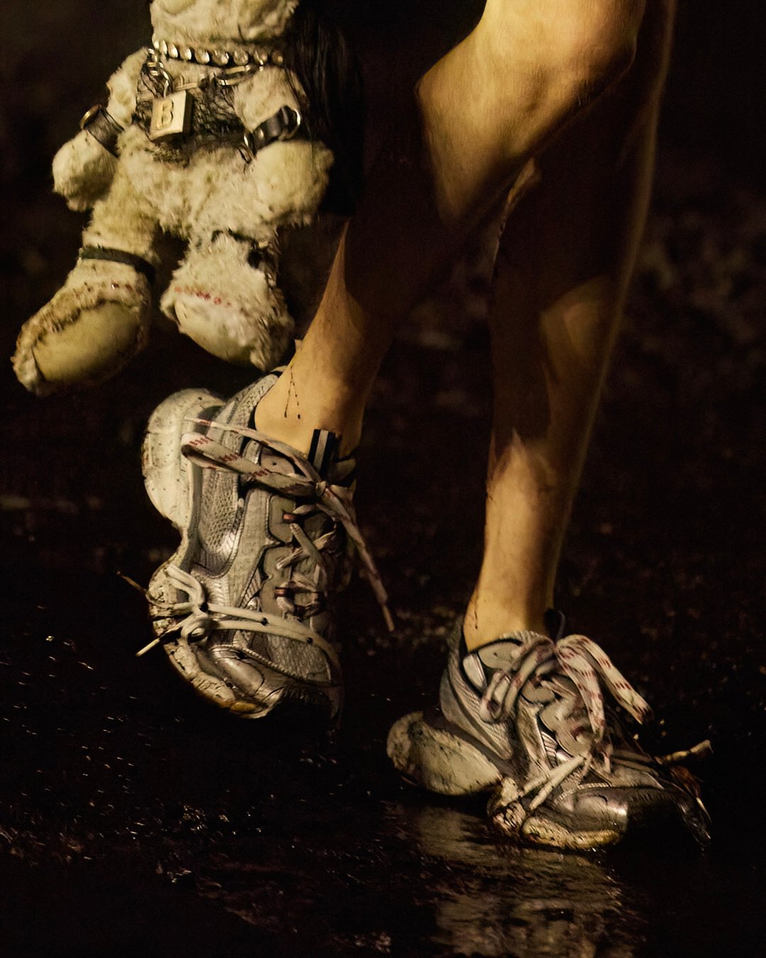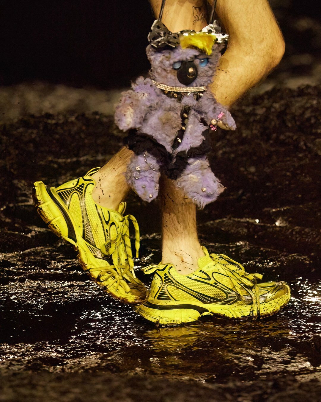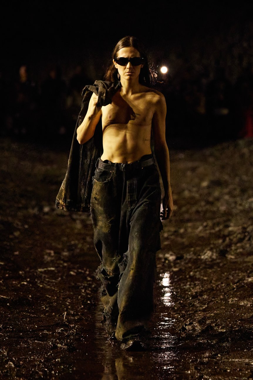 コロナが本格化する直前の2020年ウィンターコレクションでは水没したランウェイで地球の環境変動を彷彿とさせ、そして前回の2022年ウィンターコレクションでは、猛吹雪の中をモデルが歩くショーを通じて反戦を示唆したデムナ。今シーズンも引き続き苦難を思わせるランウェイが用意され、デムナはこれを「真実を掘り下げ、現実的であることのメタファー」と表現した。