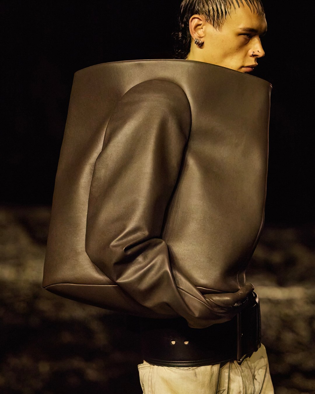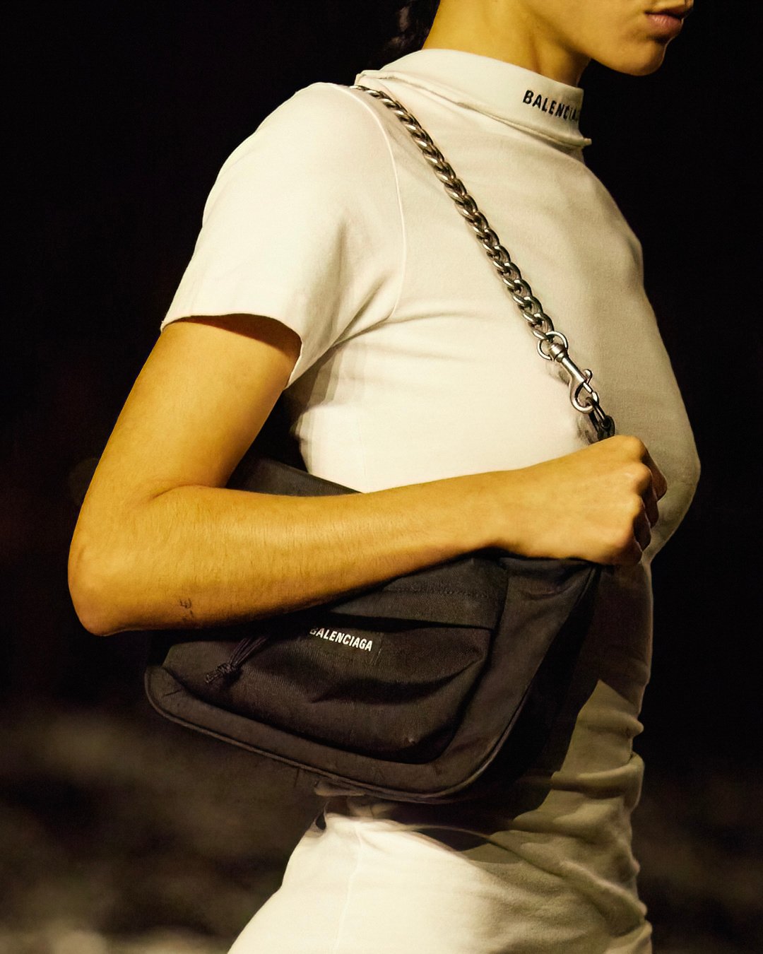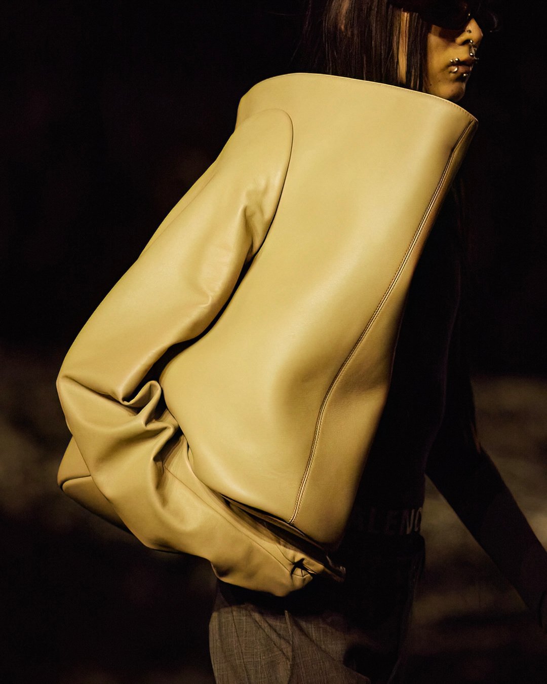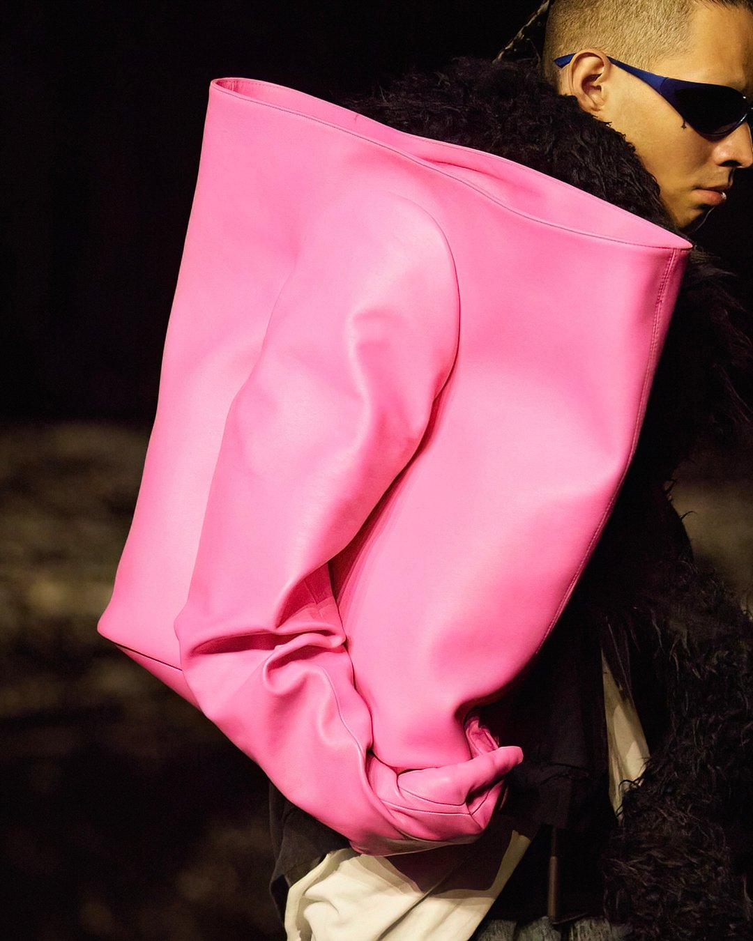 バッグは新型が豊富で、ランウェイで目を引いたのはトートバッグから腕が突き出たような形状の「グローブトート」。グローブ部分に右腕をすっぽりと入れて肩に掛ける仕様で、ピンクやブラックなどのカラーで登場した。アームウォーマーを巨大化した「パファーバッグ」も存在感大。そしてチェーンショルダーの「レイバーバッグ」は、実用的なナイロン素材で新たなアイコンバッグとなりそうだ。