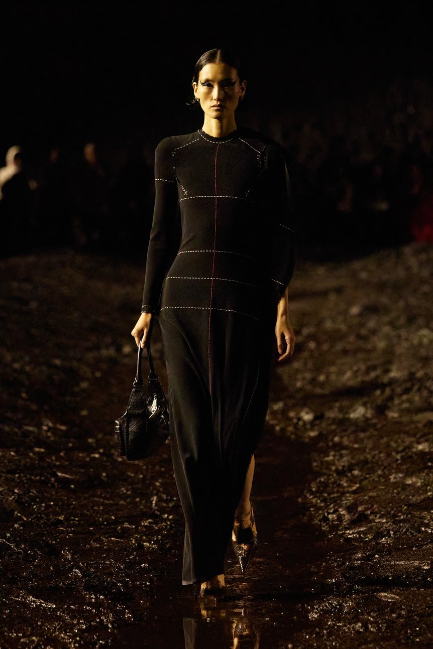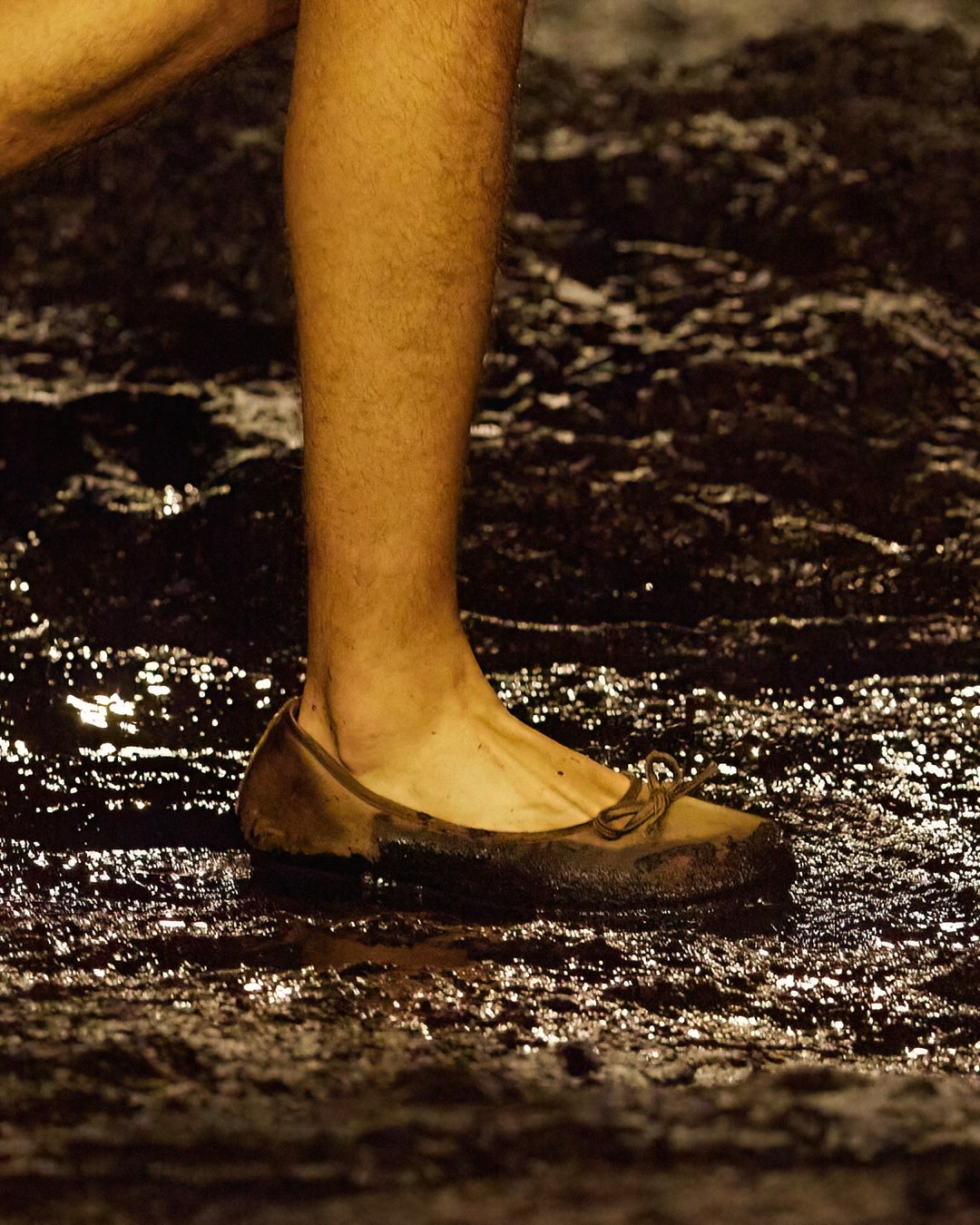 フロア全体を埋め尽くす泥の中央には大きな凹みがあり、モデルが歩く部分には水溜まりも。この異様な光景にライトが照らされると、一人目のモデルが姿を現した。
