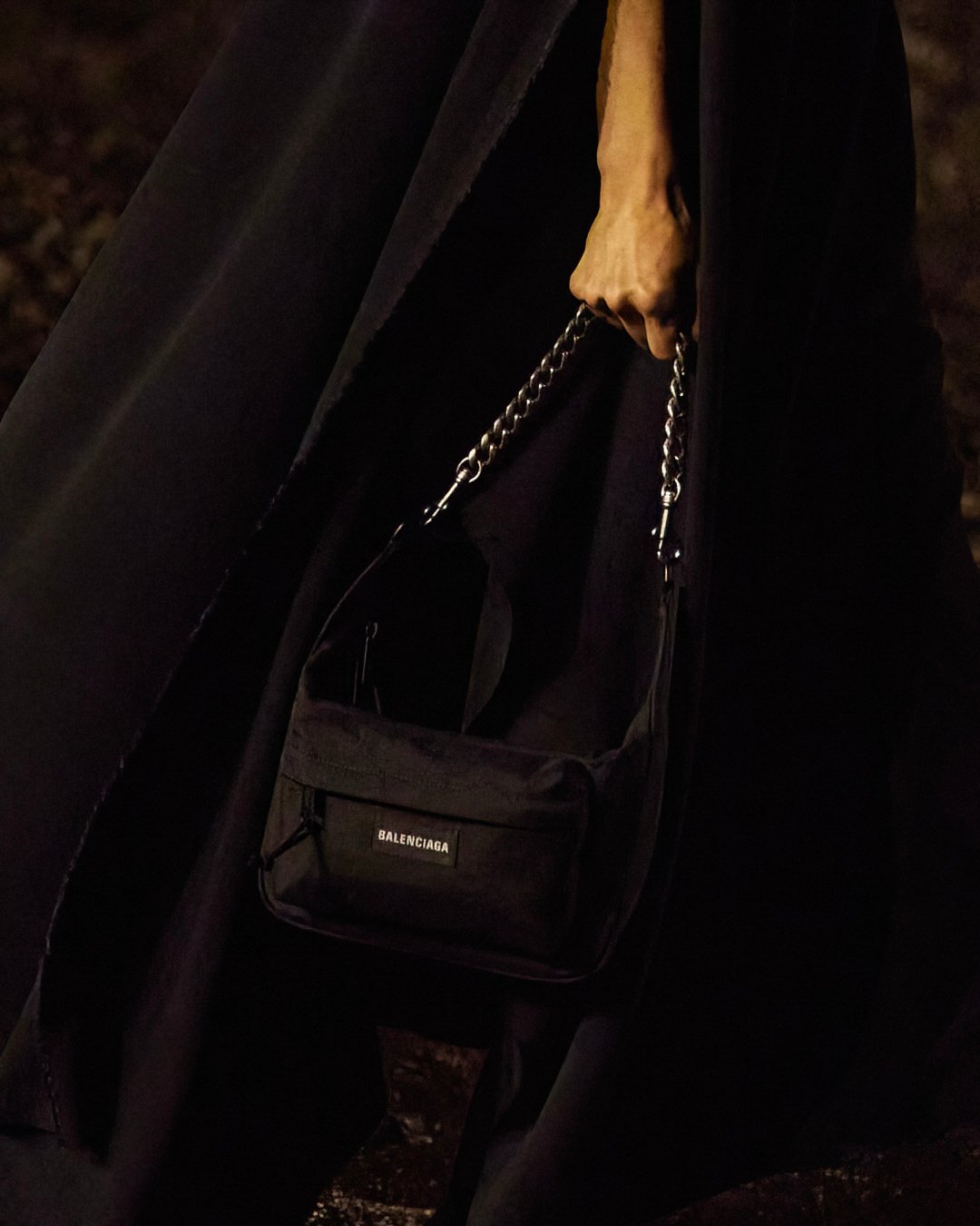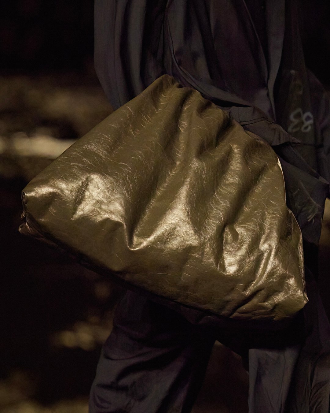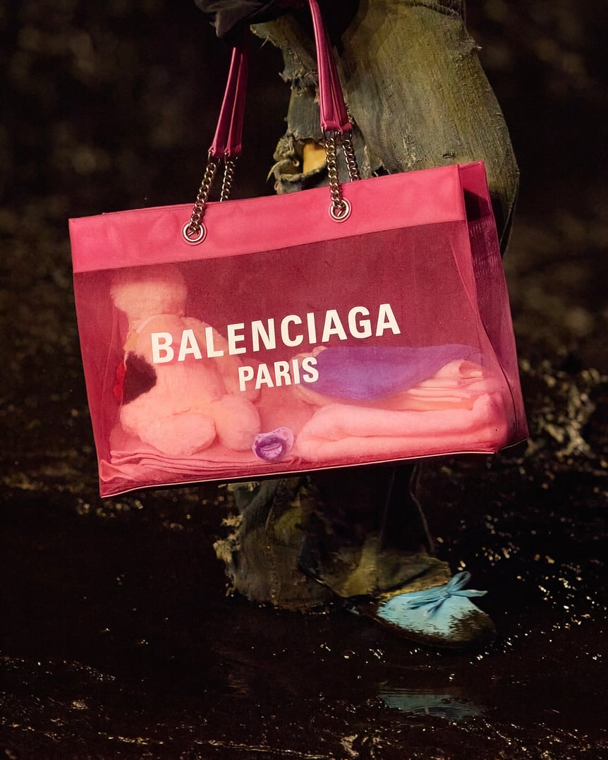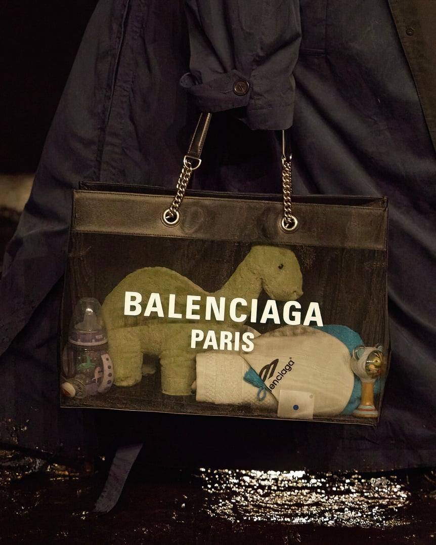 会場が一瞬ドキリとしたのが、中盤の赤ん坊を抱いた男性たち。赤ん坊はショーの後、特別に製作された人形だと判明するが、本物と見紛う出来。ボンバージャケットのポケットに哺乳瓶を入れ、デューティフリーバッグの中にはベビーグッズを詰めるなど、リアリティを追求するデムナの真髄が感じられた。なお、バレンシアガのロゴ入りベビーキャリア(抱っこ紐)の商品化は未定だという。