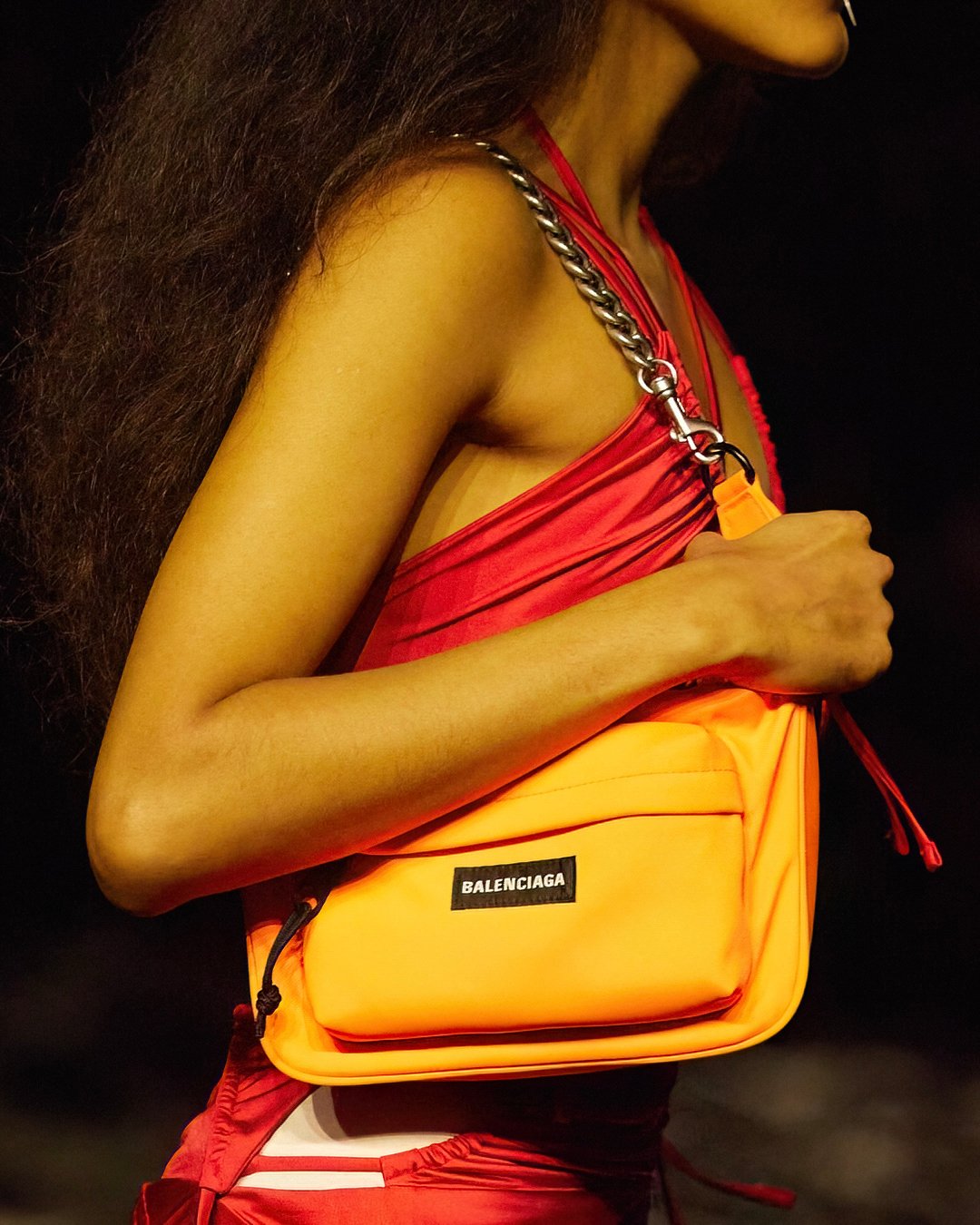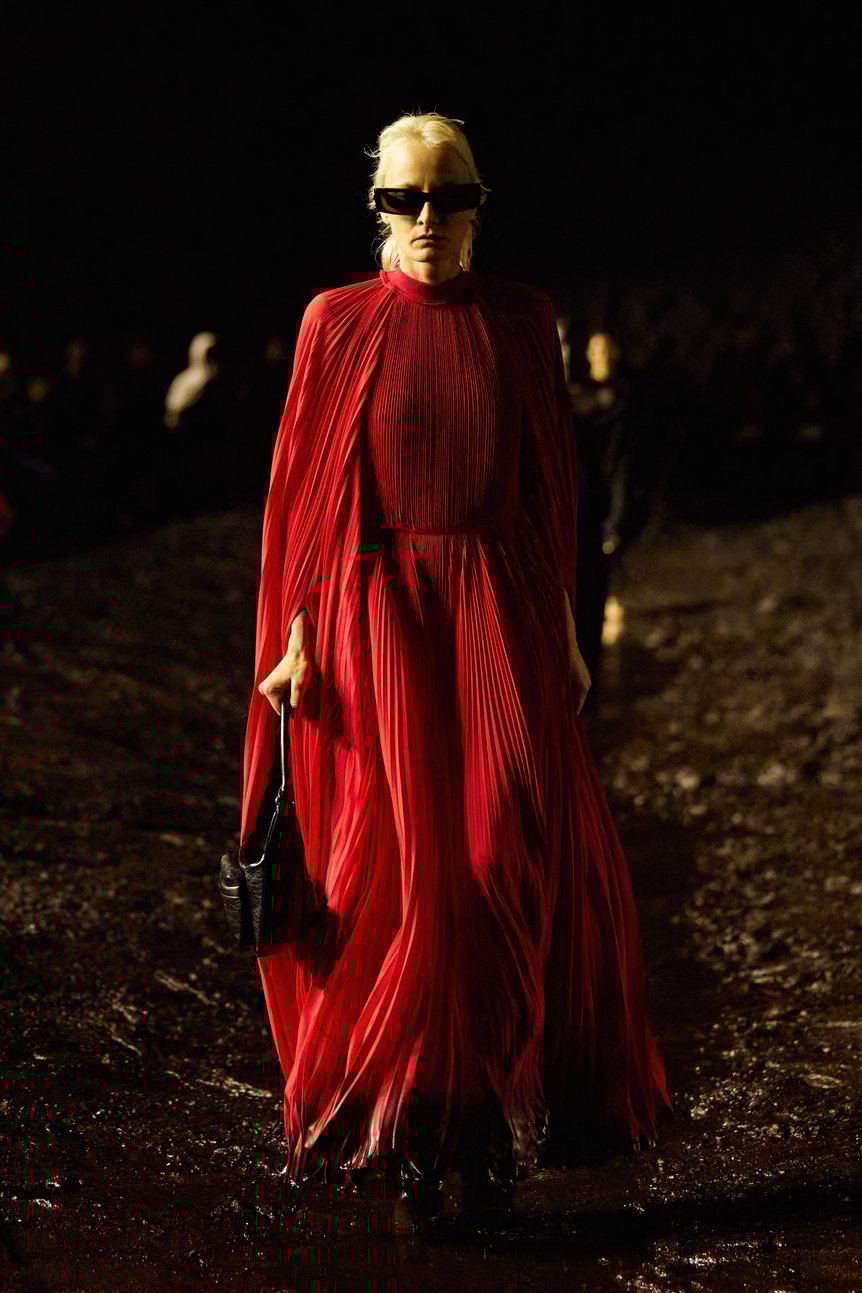 赤いキャミソールドレスをよく見ると、ビキニタイプの水着をつなげて作られているのがわかる。また、ショーのラストで視線を集めたレザーのマキシドレスは、バレンシアガのアイコンバッグ「シティ」を解体して再構築したデザイン。ロンググローブは「ル カゴール」バッグを再構築して作られている。実際にデットストック品が用いられたかは不明だが、アップサイクルのアプローチが強く印象に残った。