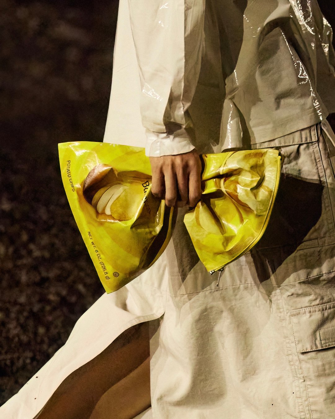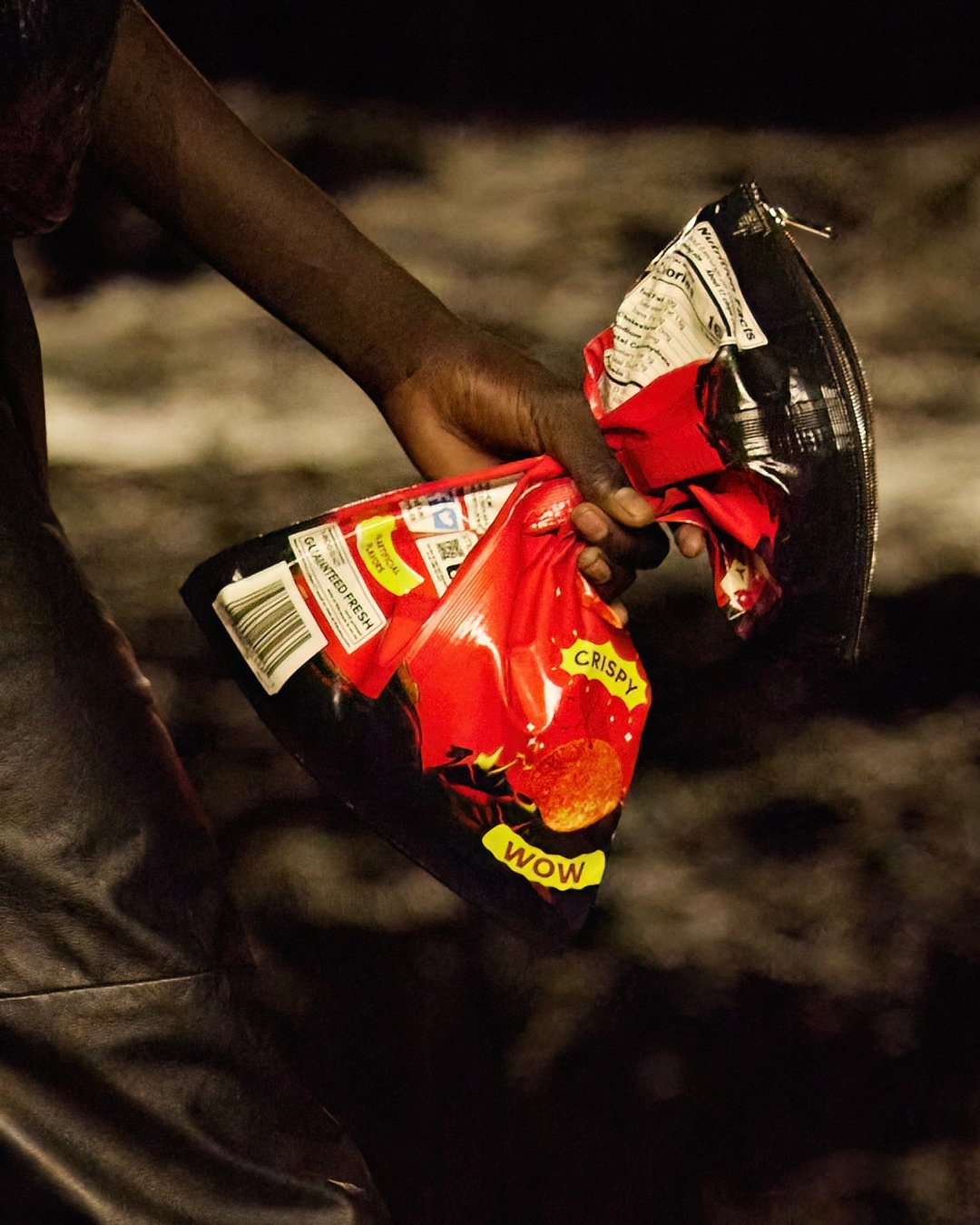 ランウェイでスナック菓子を持って歩いているように見えたのは、ポテトチップスブランド「Lay's」とのパートナーシップにより、ラムレザーでパッケージを忠実に再現した「L.O.L. クラッチ」。