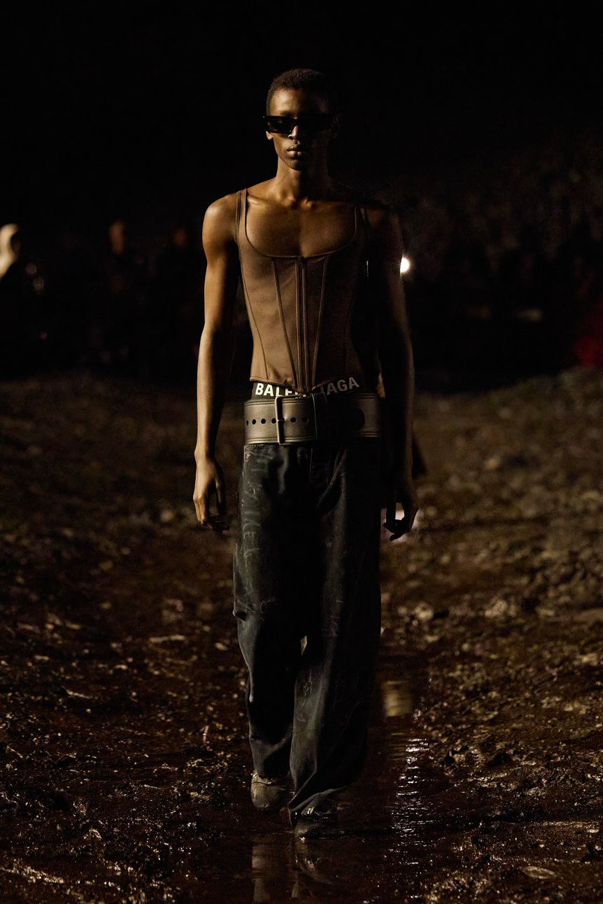 パリ中心部から車で約1時間。「バレンシアガ(BALENCIAGA)」のショー会場に到着し、メインホールに足を踏み入れると同時に湿った土の匂いが漂ってきた。暗闇に目を凝らすと、ランウェイがあるべき場所に大量の泥。その荒くれた道をモデルが歩けば、当然のことながら服もシューズも泥まみれになっていく。バレンシアガのデムナ(Demna)が2023年サマーコレクションで表現したのは荒廃した世界か、それともラグジュアリーへのアンチテーゼか。ファーストモデルにはサプライズも。