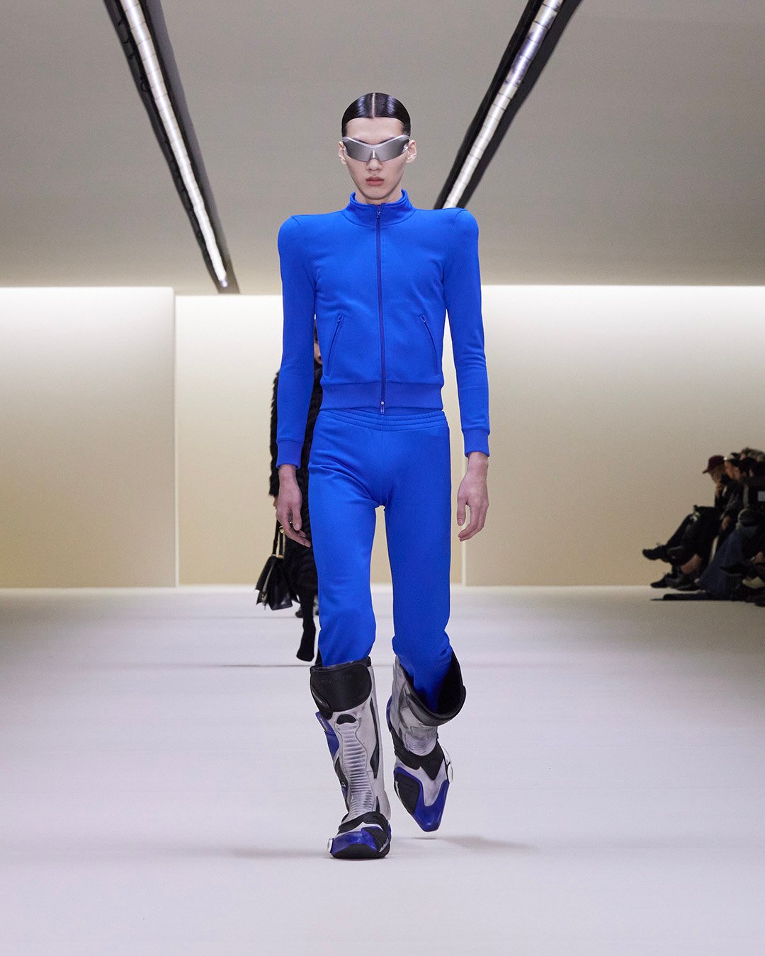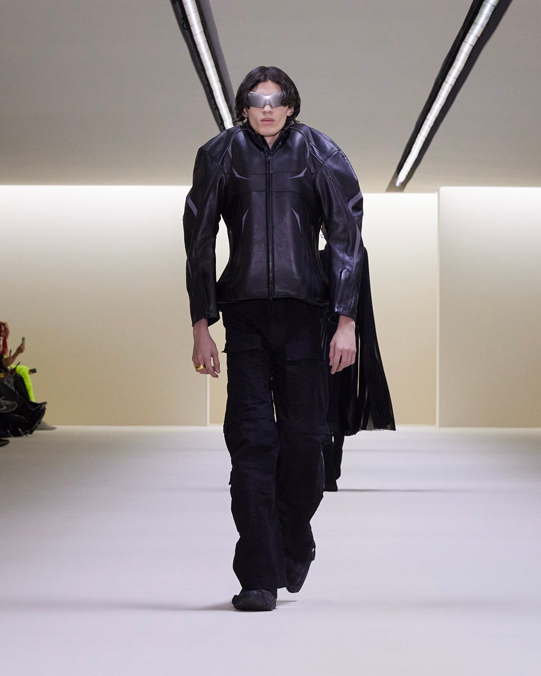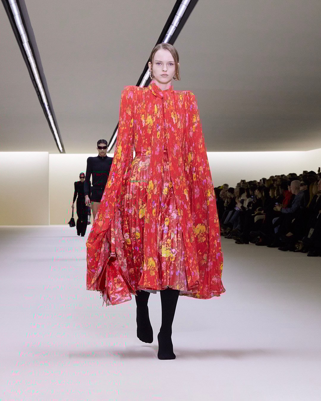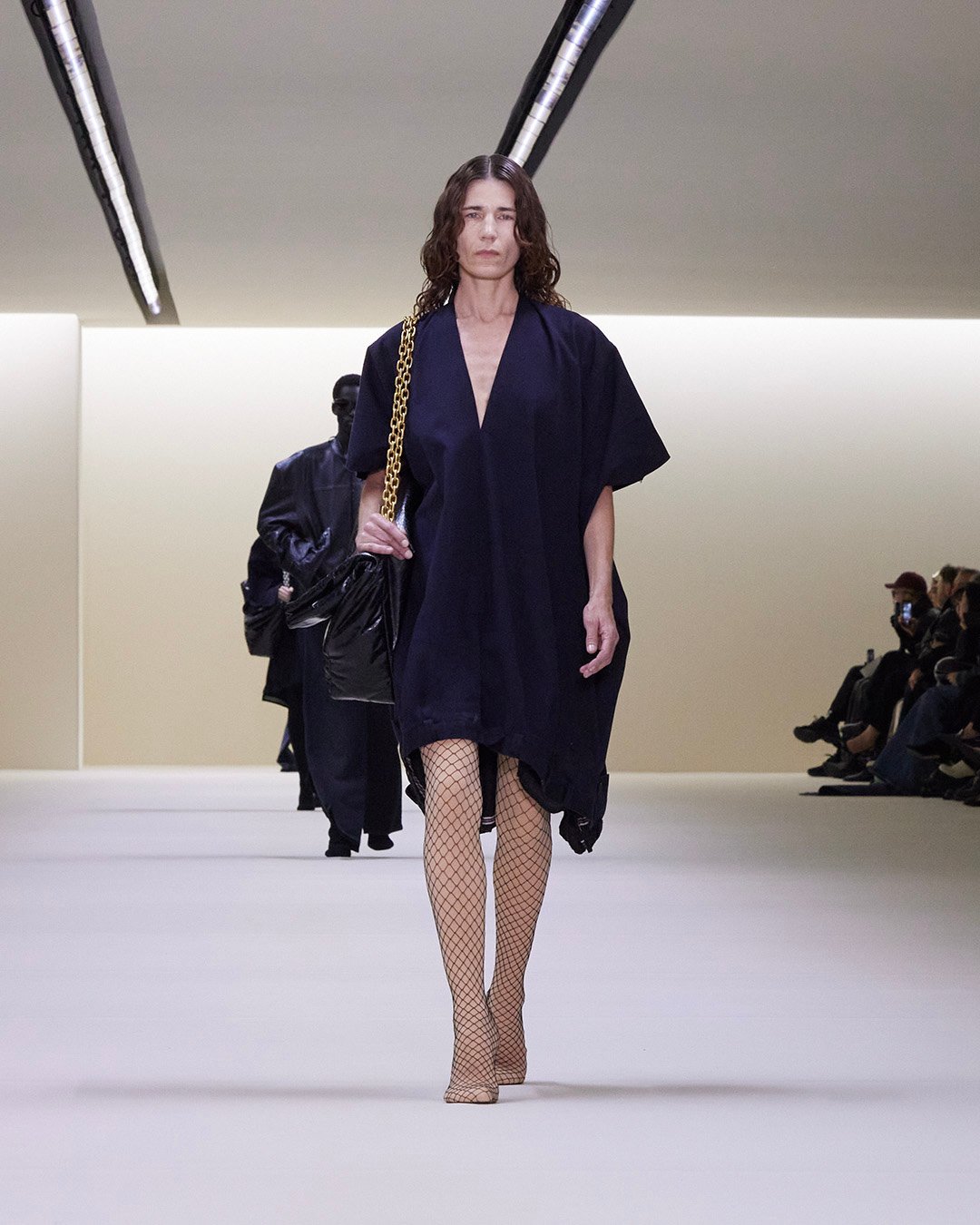 後半はクチュールコレクションからシルエットを引用し、特徴的なのが肩の作り。いわゆるパワーショルダーとは異なり、丸みを帯びて立体的なショルダーラインを描いている。マキシ丈のドレスやコートだけではなく、トラックスーツやジャージー素材のセットアップといったカジュアルなスタイルにも引用。従来のコレクションでは、特にストリートテイストのアイテムにはブランドロゴが様々な形で(時にアイロニカルに)施されていたが、それらが排除されているのが今回の特徴のひとつ。シルエットでバレンシアガと認識できるようになっている。