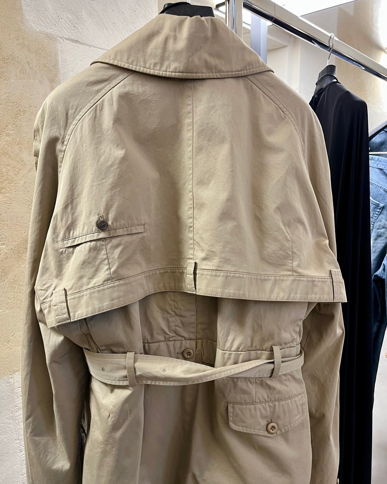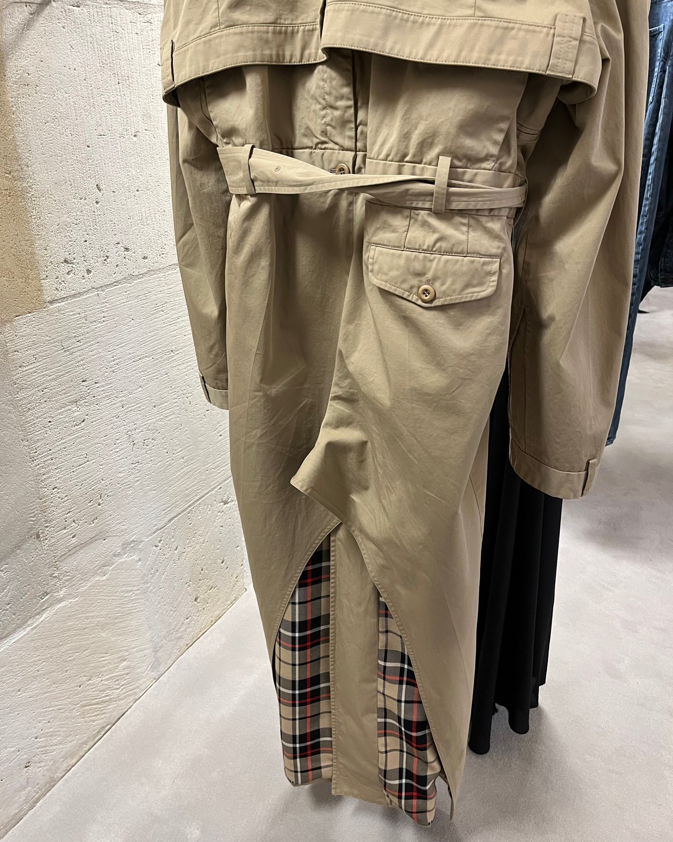 パターンの応用は続く。ルック13のミニドレスは、ネイビーのチノパンを解体して再構築。ルック18のトレンチコートはカーキのチノパンが融合している。袖口、ガンパッチ、ヨーク、そして後ろ身頃の全体にまで、チノパン特有のパターンが繰り返し用いられていた。