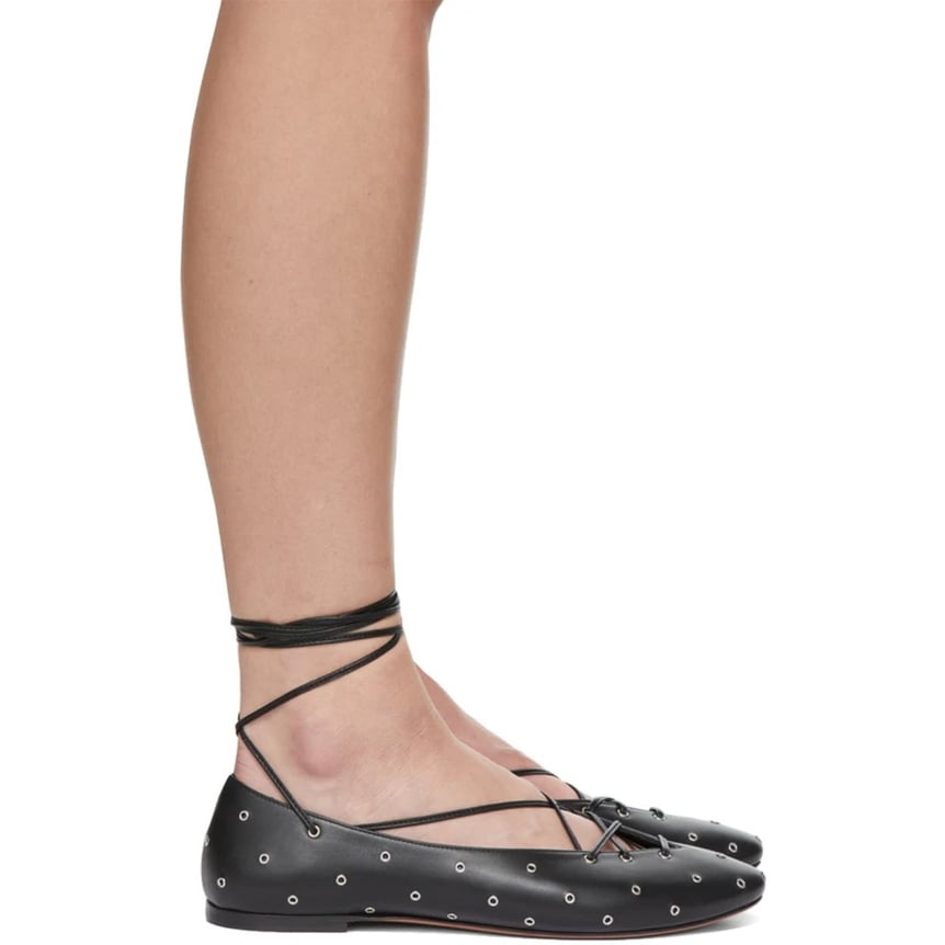 シグネチャーのアイレットをあしらった「アライア(ALAÏA)」のフラットシューズ。快適な履き心地を叶えるライトなクッションインソールを備えているのが嬉しいポイントです。