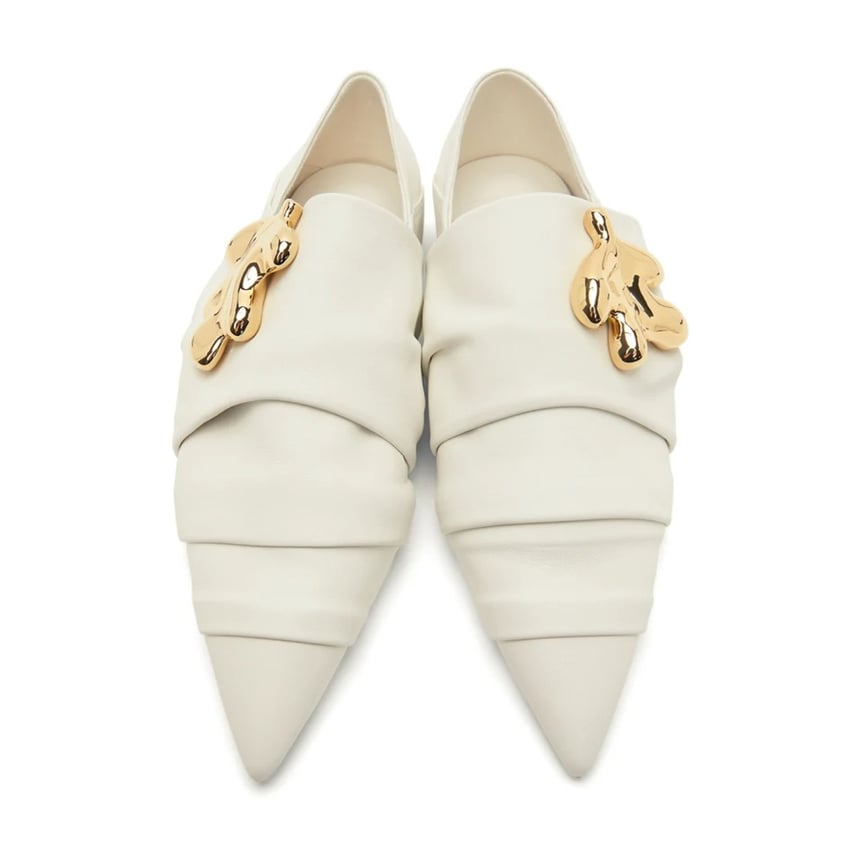 ゴールドの大きなブローチが目を引く「ジル サンダー(JIL SANDER)」のシューズは、ギャザーを寄せたポインテッドトゥでエレガントな印象。柔らかなラムレザー生地を採用しているので、スリッパのように踵を踏んでラフに履きこなすのもおすすめです。