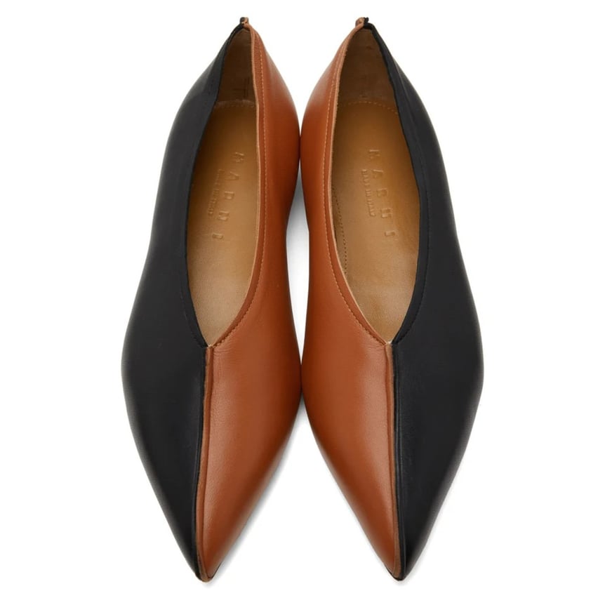 「マルニ(MARNI)」のシューズは、タンとブラックのカラーブロックが新鮮。遊び心ある配色ながらポインテッドトゥでエレガントな印象に仕立てたこのシューズで、足元に個性を添えて。