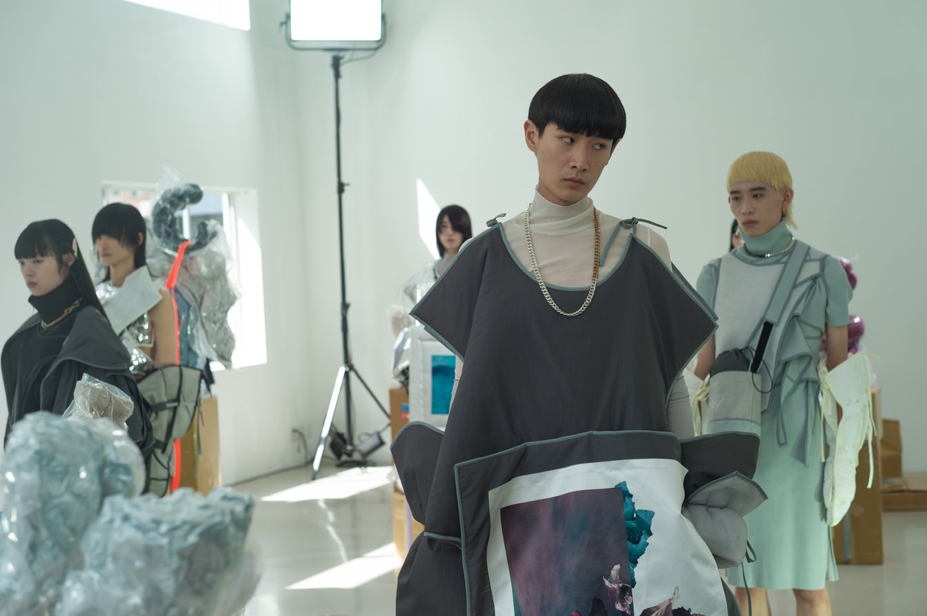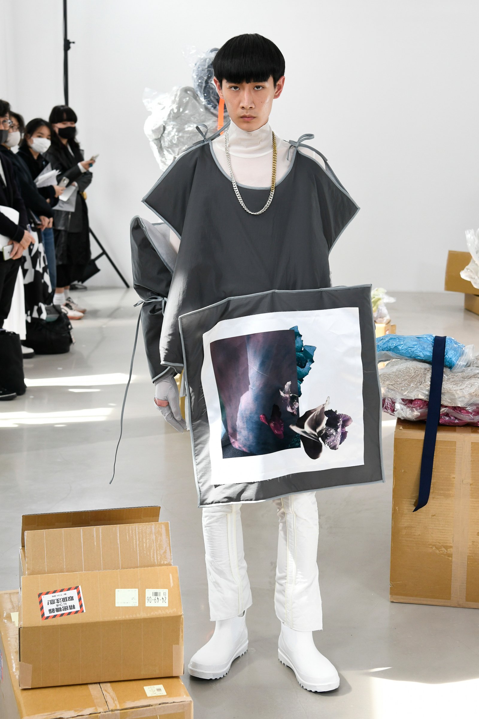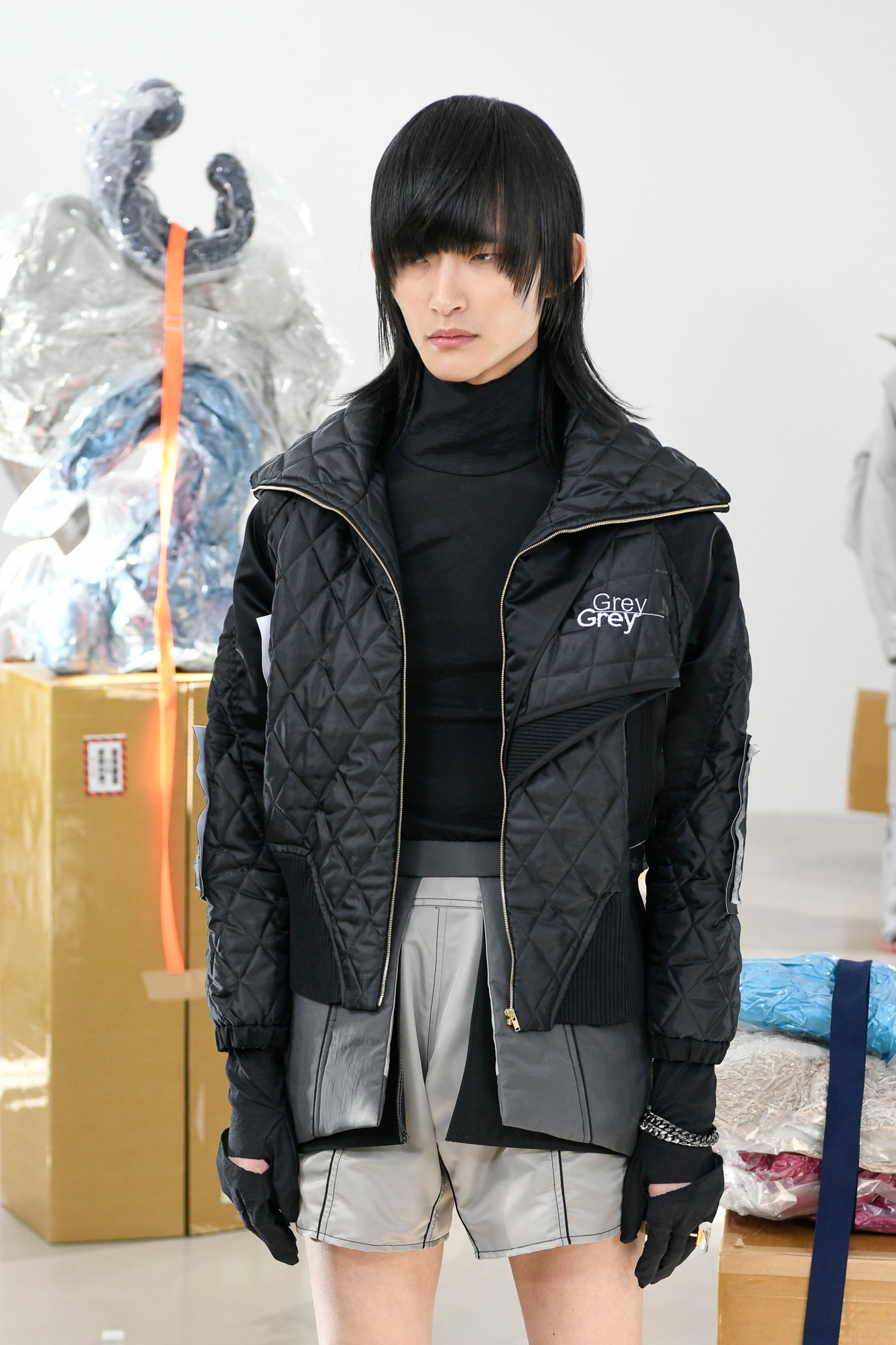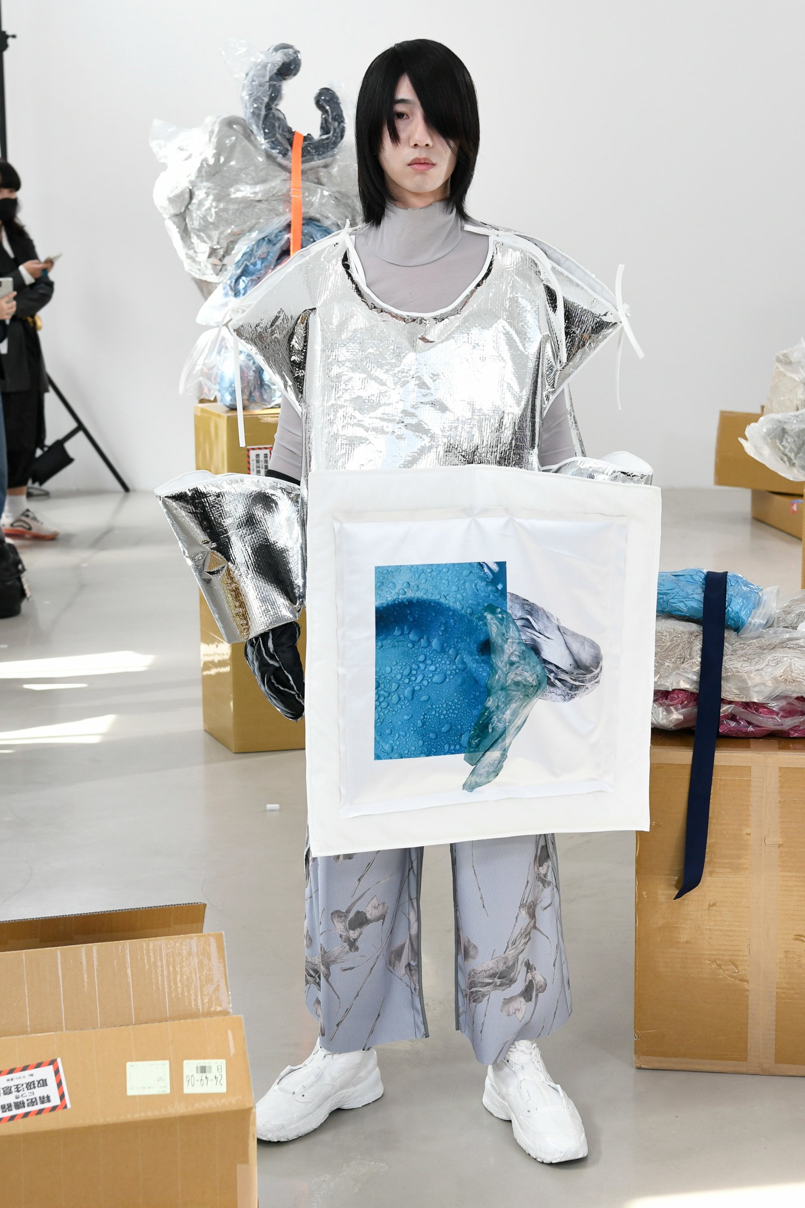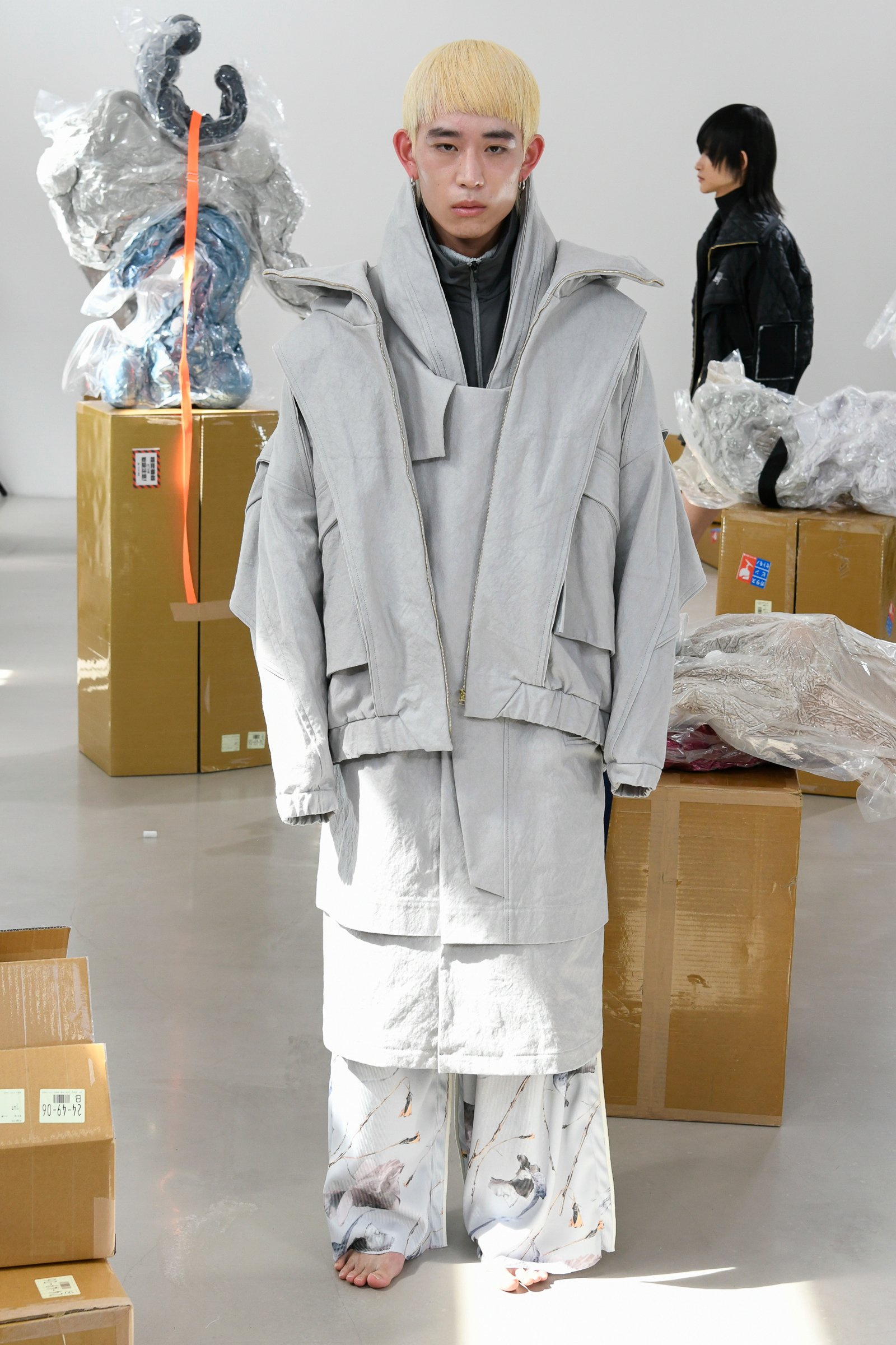 バルムング デザイナーのHachi自身は「2000年代のファッション青春感覚みたいなものを、原宿中心に吸収してきた」と自認するように、バルムングと原宿文化の親和性は高い。繰り返しになるが、原宿文化が可能にしたのは、身体的な着衣と彫刻的な着衣の二項対立からの脱却である。その先には「Greyの衣服」が存在するのみ。今回発表されたバルムングの新作は、鍋つかみを彷彿とさせるキルティング素材のグローブや、白いキャンバスの様な装飾品がデザインされたトップスをはじめ、ショートパンツに付属するポケットやリュックなど、モデルの身体からはみ出した大きなアイテムが目立った。圧縮袋で組み立てられたスカルプチャーと、極端なほど大きいアイテムの数々の対比は、ファッションにおける身体性と彫刻性の二項対立や、規定概念からはみ出そうとする意思表明の様にも感じる。