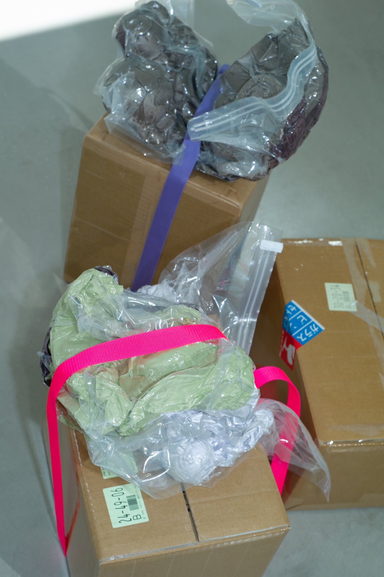 会場は雑居ビルの6階。30人程度の収容がやっとのスペースに入ると、そこには無造作に置かれた「取扱注意」のシールが貼られた段ボールの数々。段ボールの中には、トラックロープ1本と大きさの異なる布が詰め込まれた圧縮袋が複数梱包されていた。ショーが始まると段ボールの中身は、モデルたちの手によってソフト・スカルプチュアへと変貌。鈴木操が手掛けたという彫刻作品は、埴輪のような人の形にも、未知の植物のようにも見える。圧縮袋の中身は生活用品が包まれている布だと、デザイナーHachiは説明する。