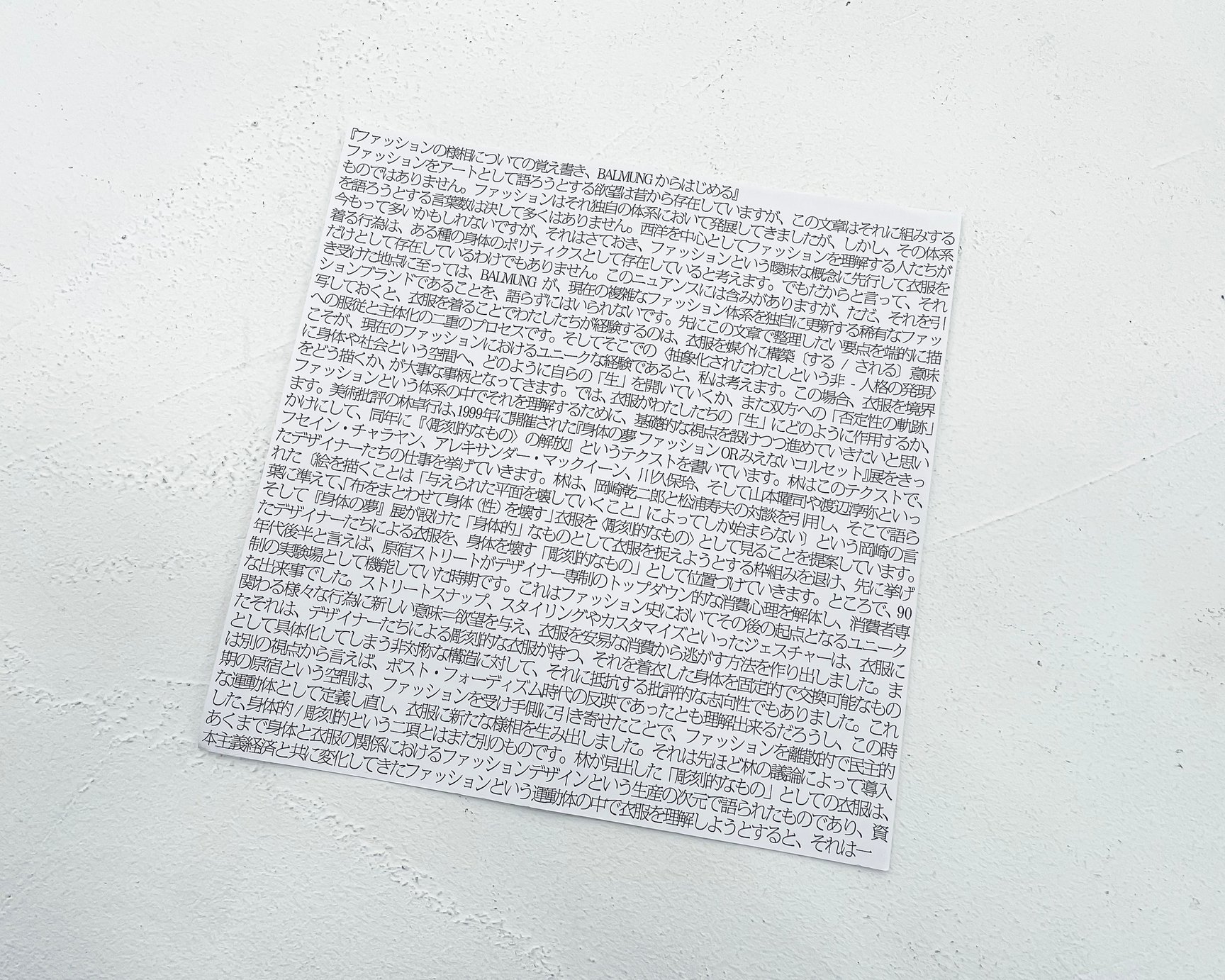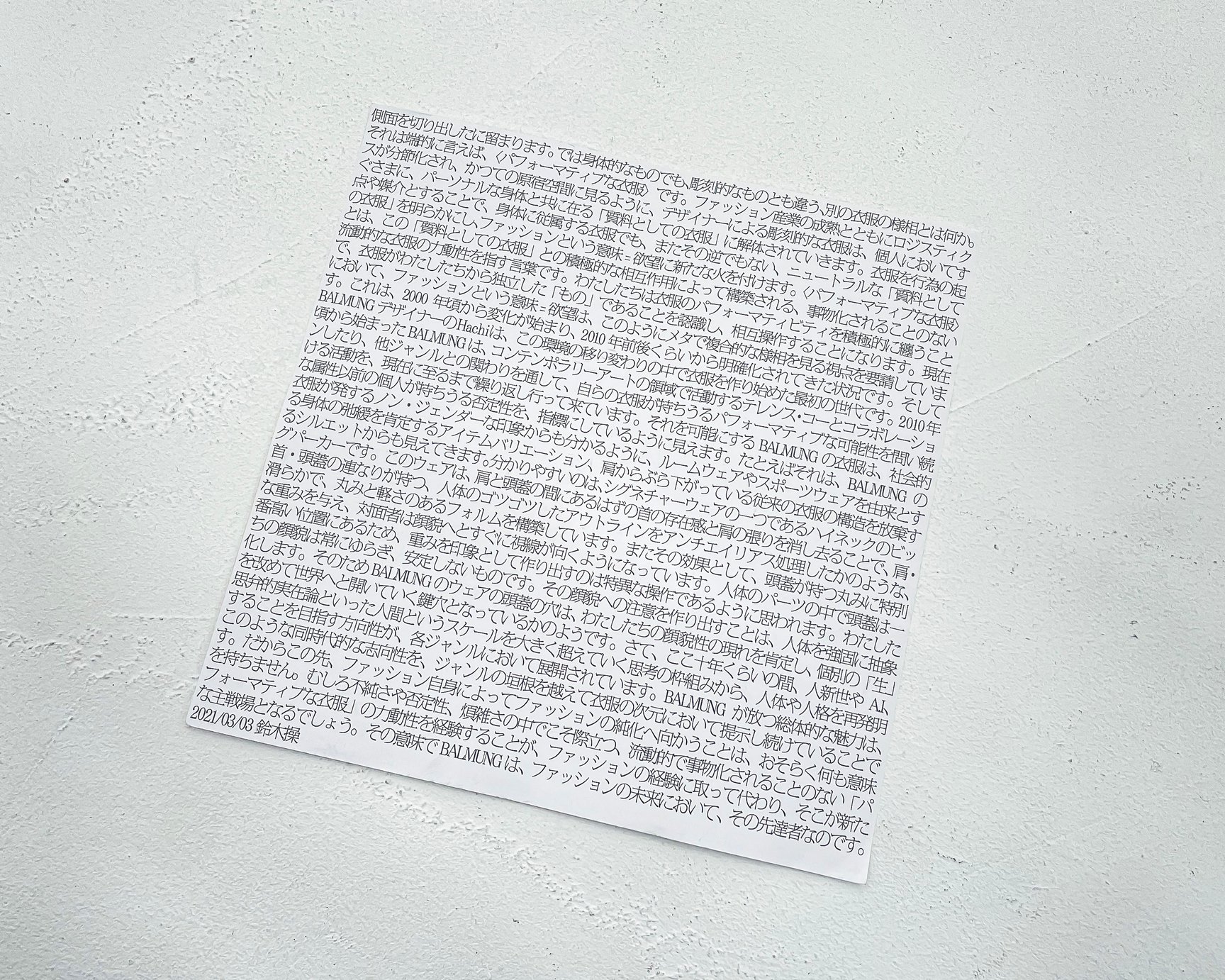 「バルムング(BALMUNG)」が2021年秋冬コレクションをショー形式で発表した。会場に入るとすぐに手渡された正方形の用紙にびっしりと文字が書かれた1枚の紙。アーティスト鈴木操によって書かれた「ファッションの様相についての覚書、BALMUNGからはじまる」と題されたテキストは、以下の様な文章から始まる。