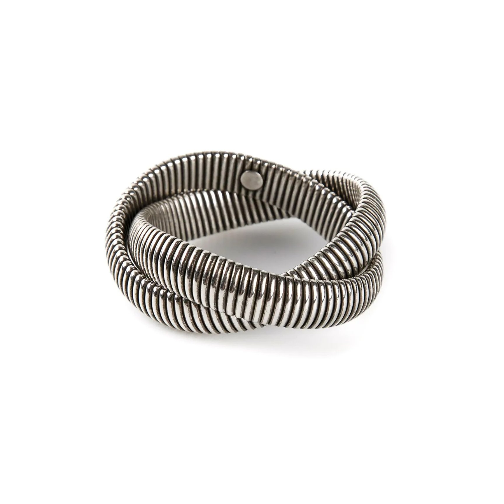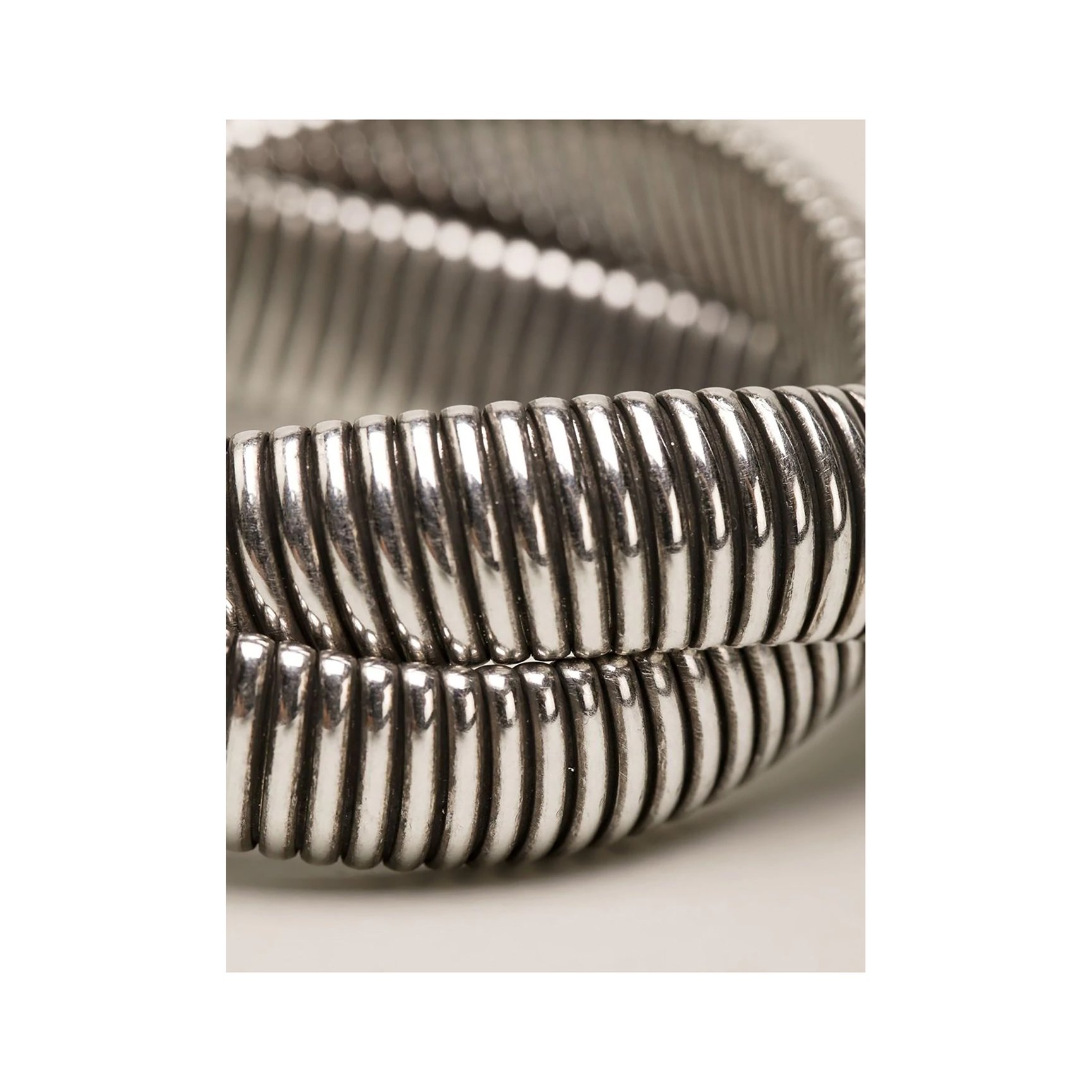 NY発モダンジュエリーブランド「ジャニス サビット(Janis Savitt)」より、シグネチャーの「コブラ」スタイルのブレスレットが2つ連なったバングルをチョイス。多数の溝に加え、ツイストした形状が目を引きます。