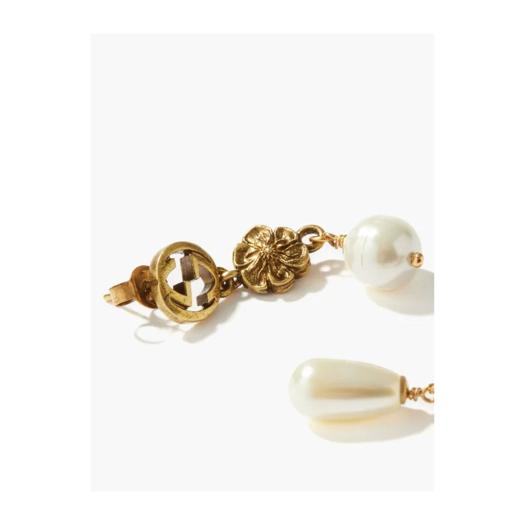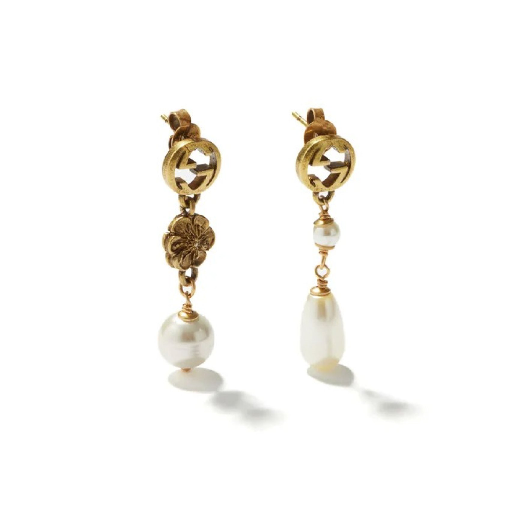 アンティークゴールドのフラワーモチーフとGGプレートが、クラシックな上品さを完成させる「グッチ(GUCCI)」のピアス。可憐に揺れる、ラウンド&ティアドロップ型のパールが視線を奪います。
