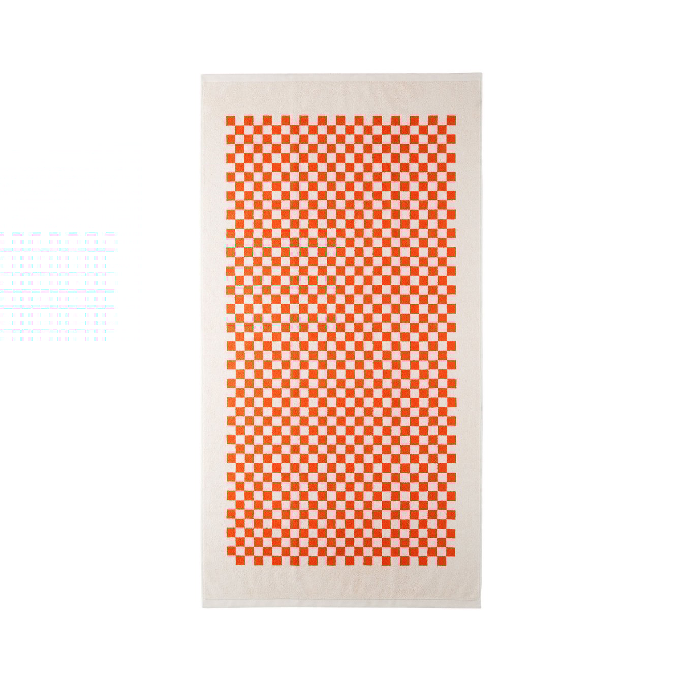 オレンジとホワイトの市松模様が陽気なムードを盛り上げてくれるバスタオル。オーガニックコットンの優しい肌触りで体を包み込んでくれます。もちろんおうちでのバスタオルとしても◎。