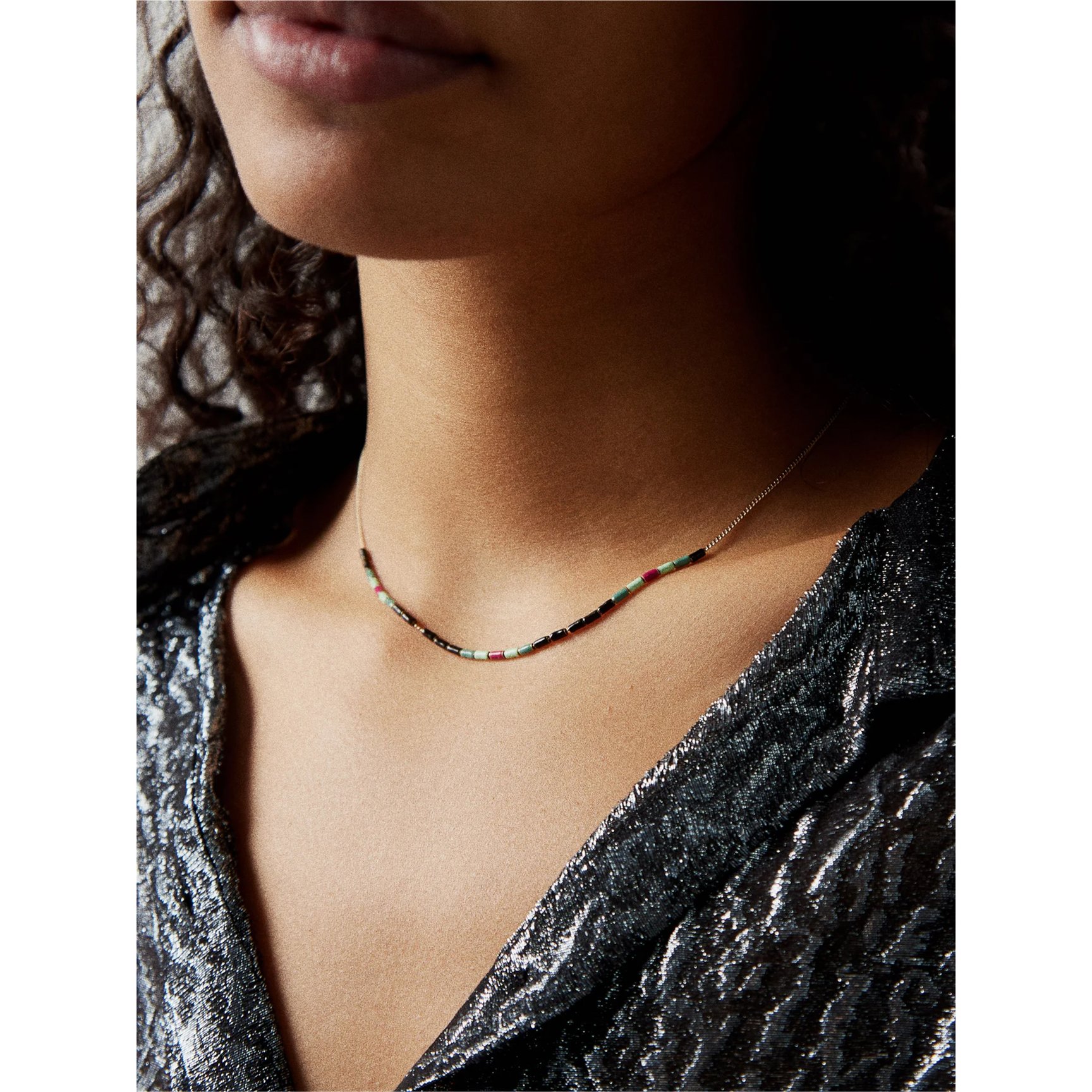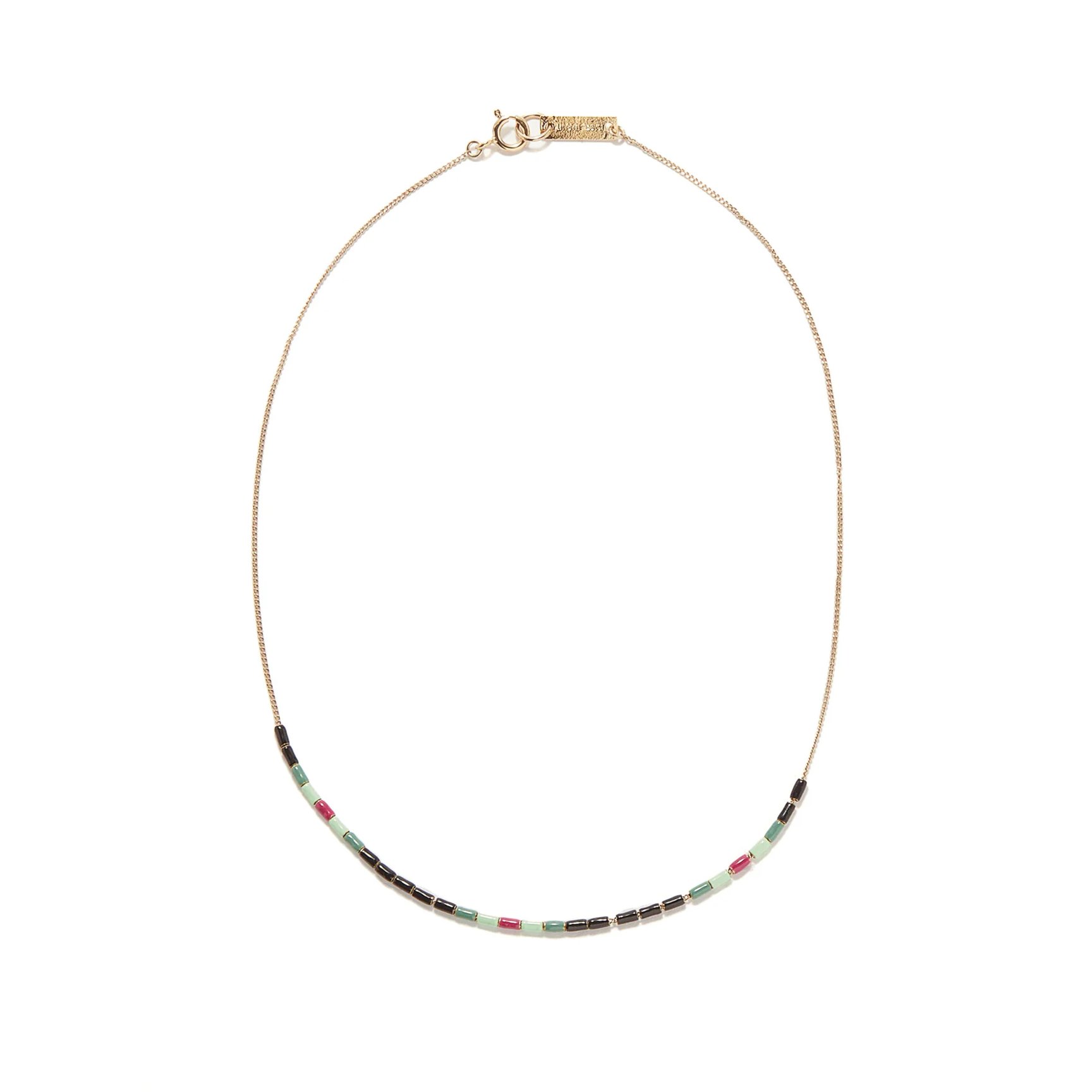 上品にビーズをまといたい方におすすめなのが、「イザベル・マラン(ISABEL MARANT)」のビーズネックレス。細身のゴールドトーンプラスに、マルチカラーのビーズがあしらわれたボヘミアンな感性が反映されたアイテムです。上品な細身ネックレスに、ビーズの遊び心が加わります。
