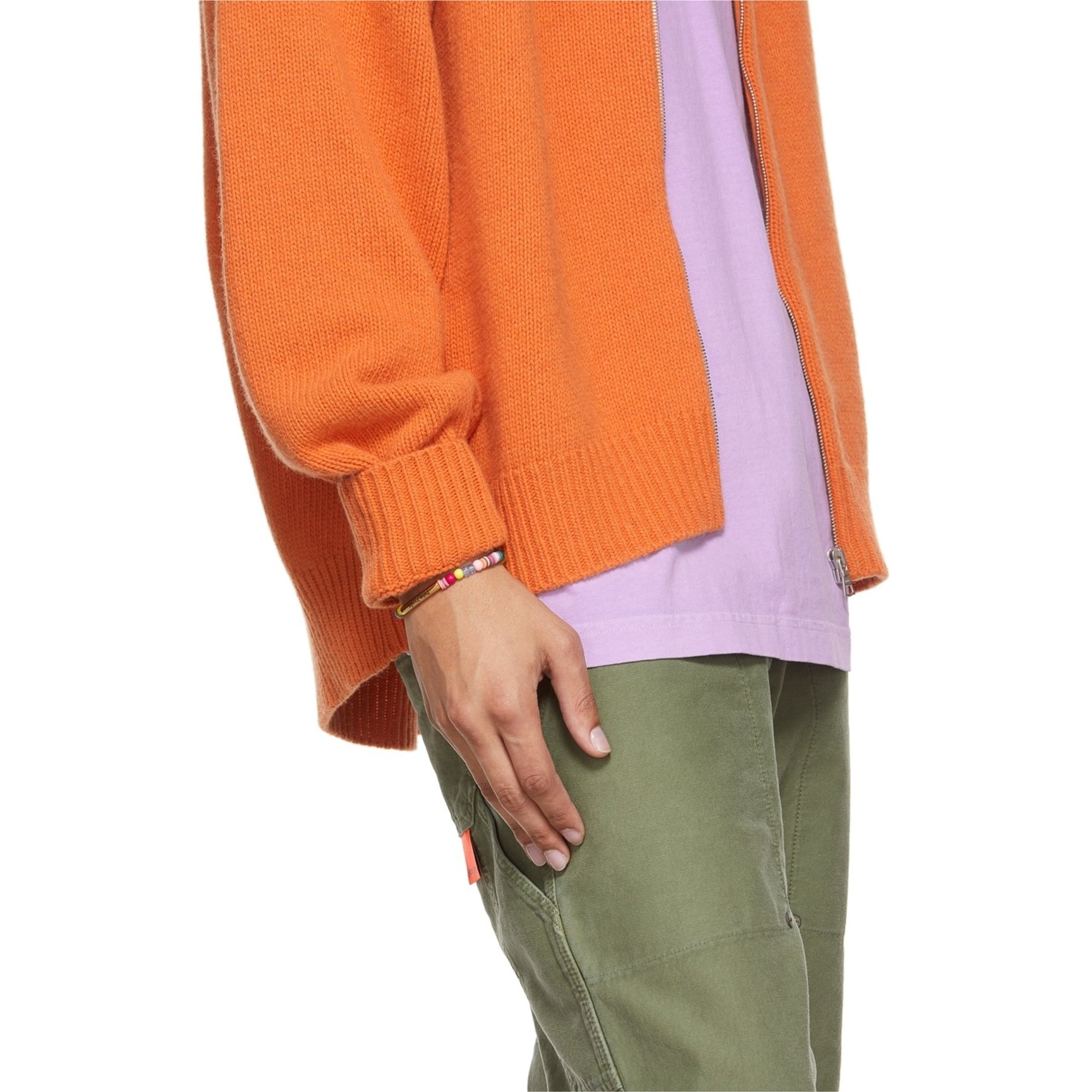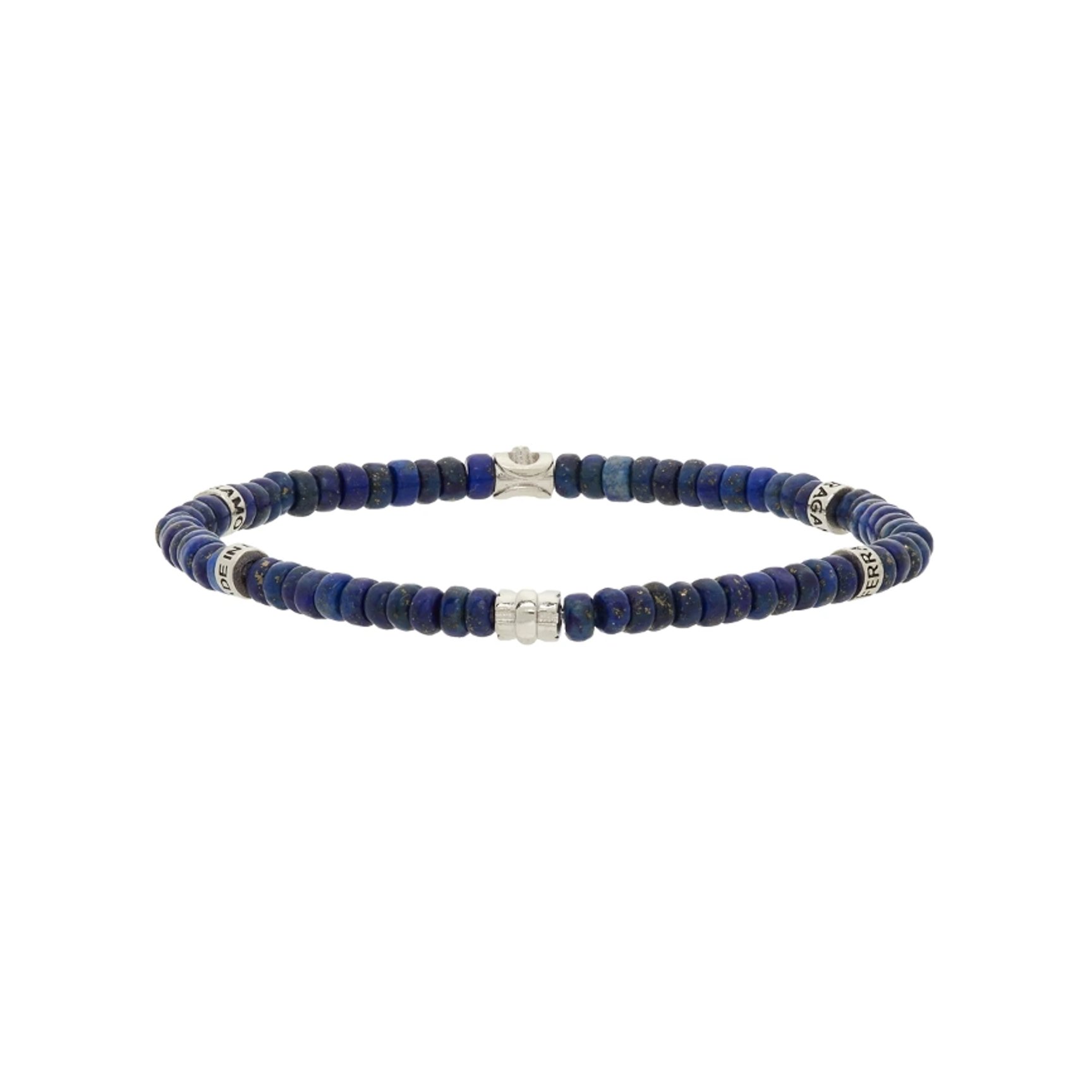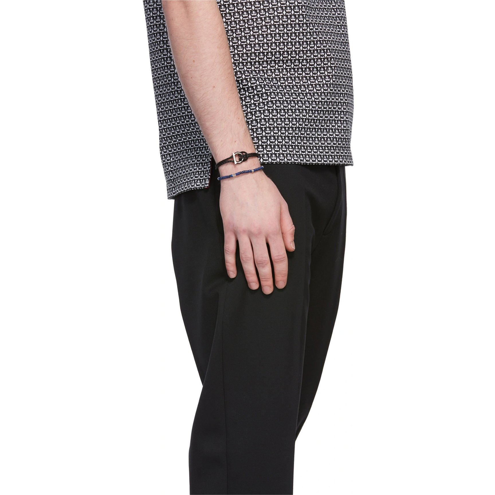 カラー・デザインともにユニセックスで使えるビーズブレスレットは「サルヴァトーレ・フェラガモ(SALVATORE FERRAGAMO)」のもの。ストーンビーズとシルバートーンのハードウェアが、手元に小さな高級感をプラス。さりげなくあしらわれたロゴ入りのビーズもワンポイントです。