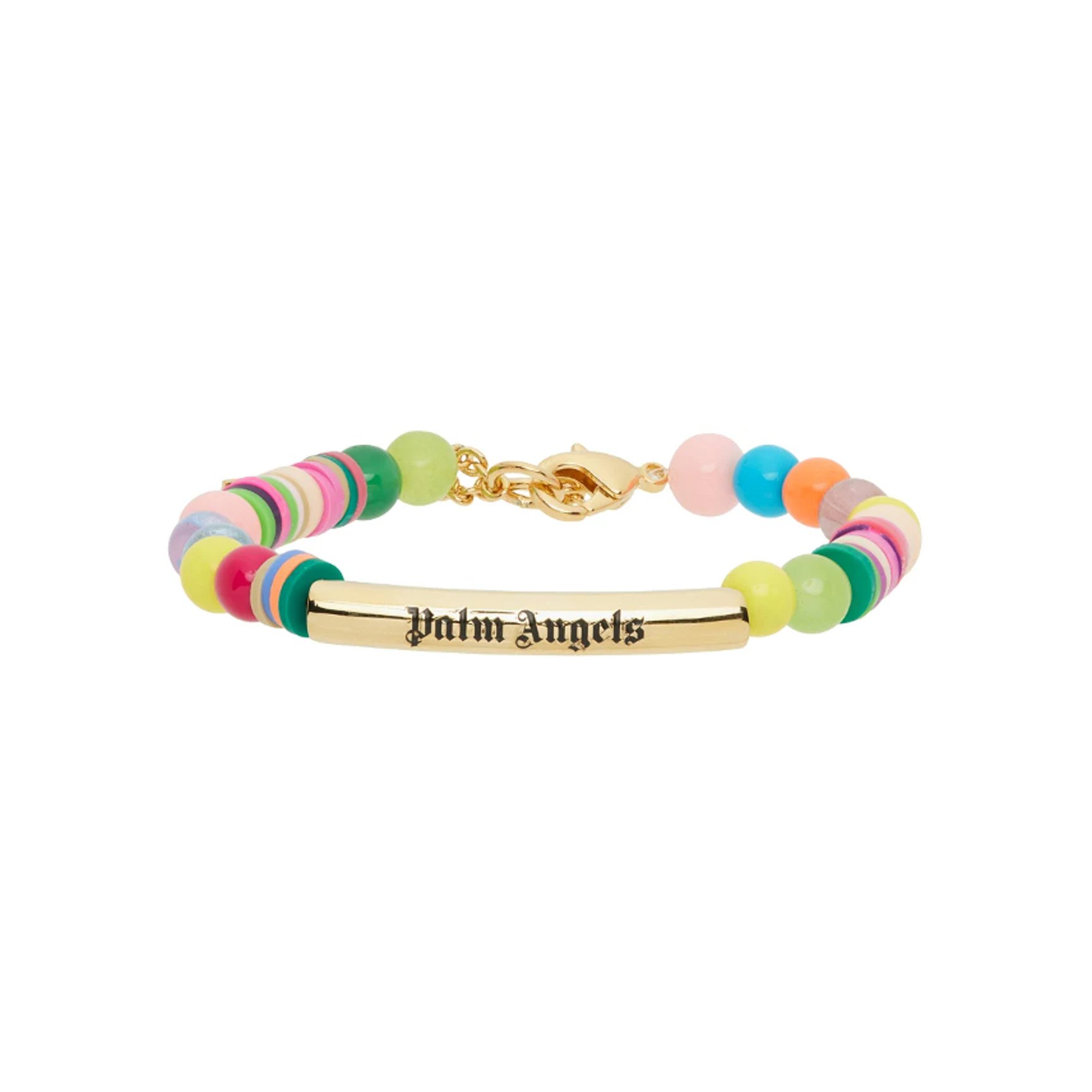 「パーム エンジェルス(PALM ANGELS)」のビーズブレスレット。プラスチックとガラスのビーズブレスレットは、手元を明るく彩ってくれるマルチカラー。全面にあるゴールドトーンのロゴのハードウェアが、ストリートな印象を与えます。