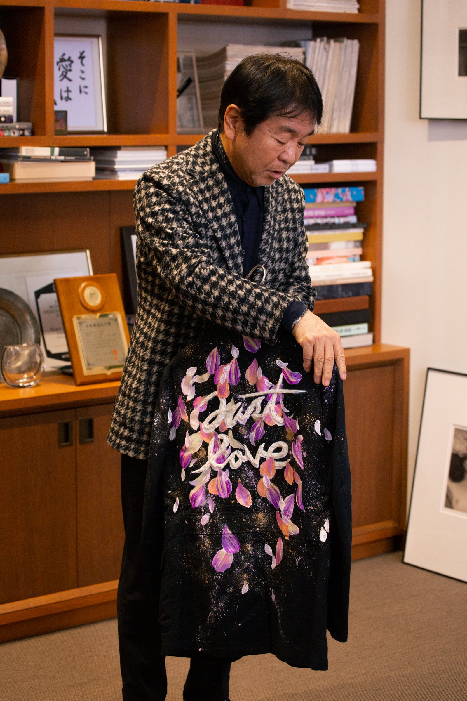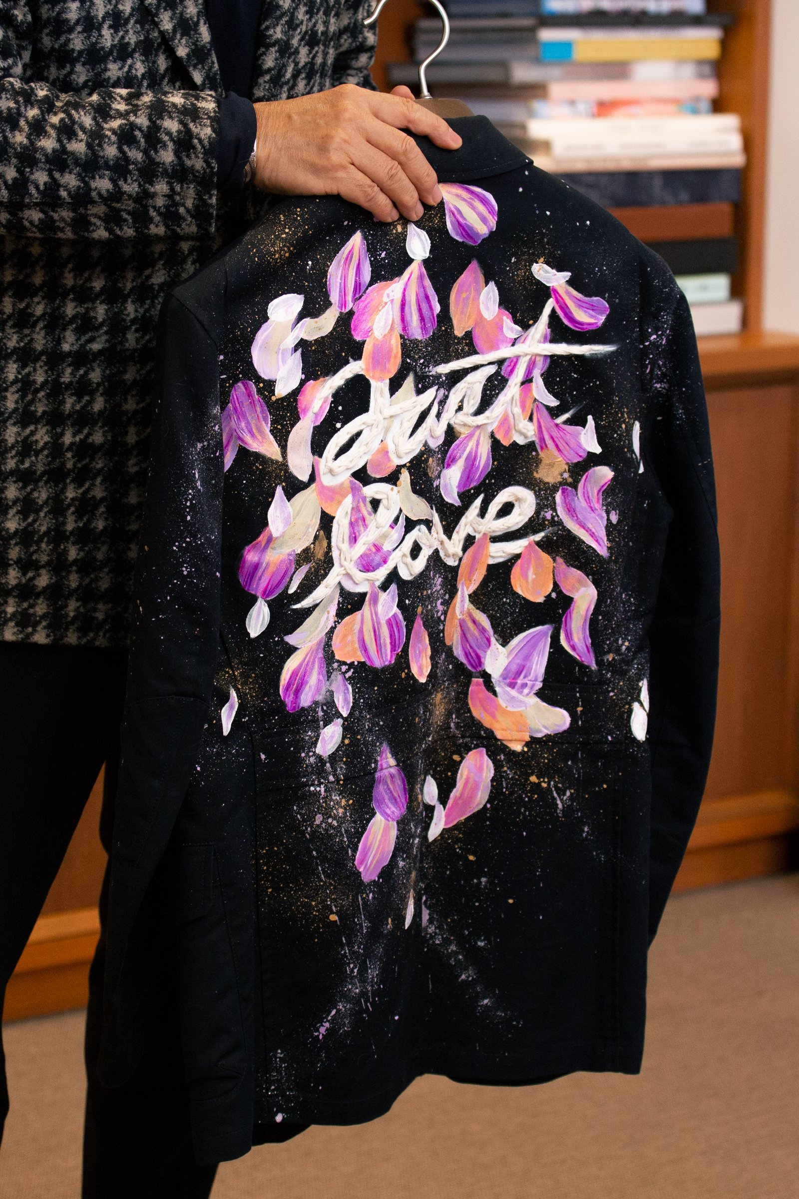 型が古いスーツも、アーティストに加工してもらうことで、アップサイクルされて蘇るんです。僕自身これをよく着ていますよ。アーティストの方も新しい表現ができるのでとても協力的です。