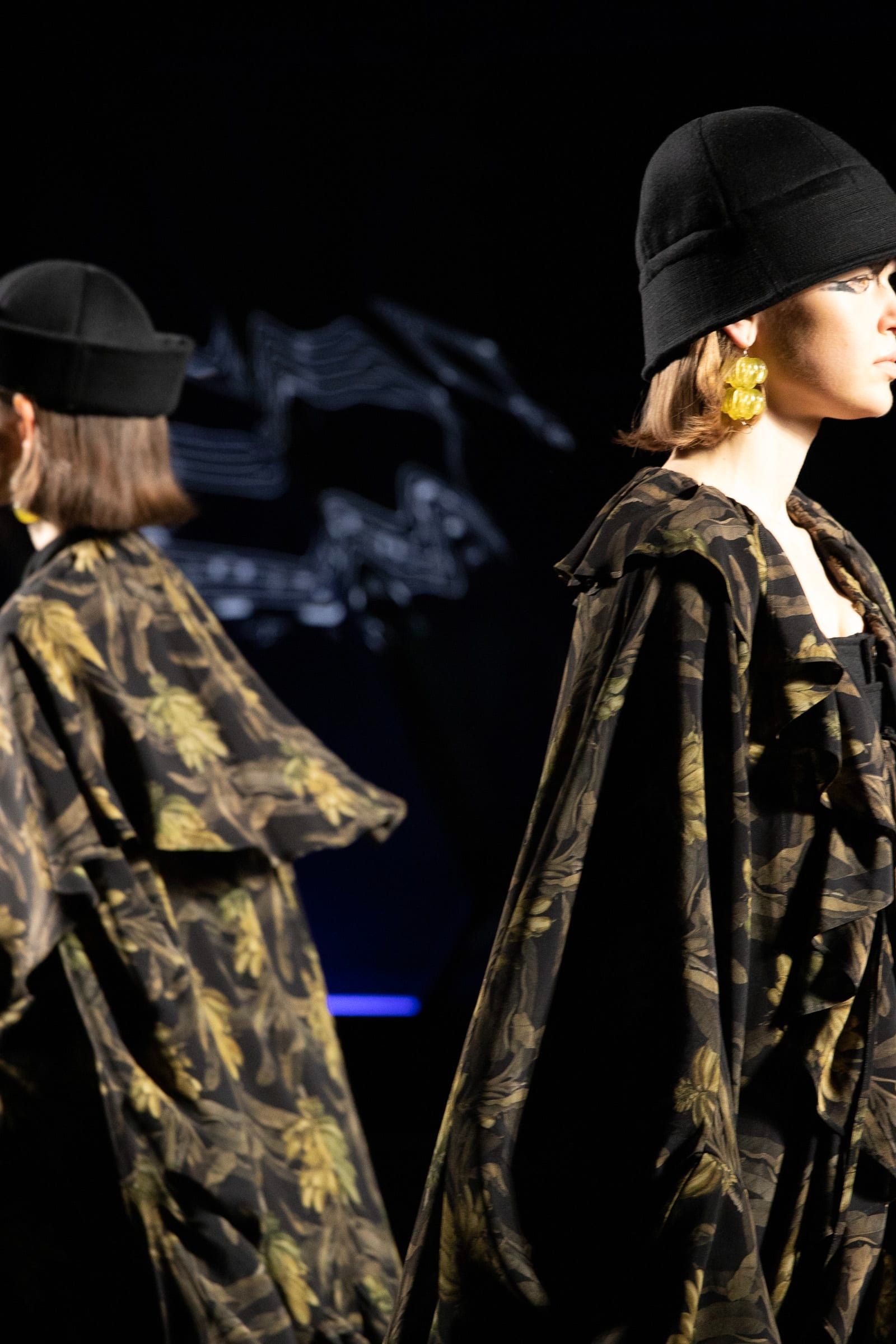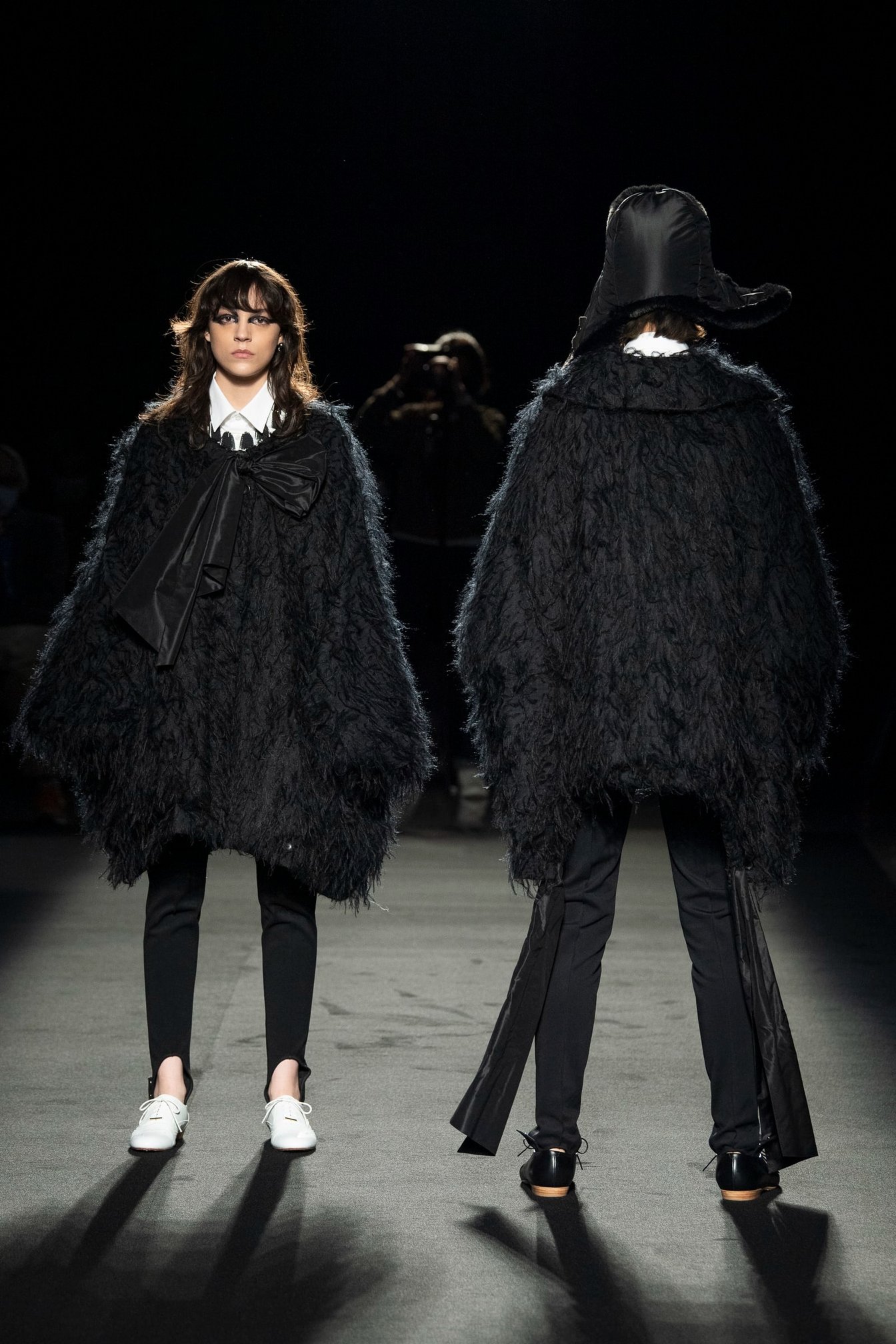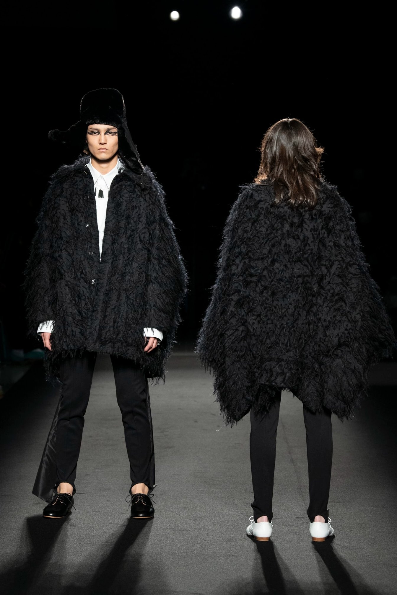 どのピースを見比べても際立つのが、それぞれの着こなしが上下、後ろ前のいずれでも成立しているという点。そしてどの服も美しいフォルムで、完成度の高さに驚かされる。たとえばコートのセーラカラーやフードは逆さにするとフィッシュテールのような躍動感のあるシルエットに変化し、胸元のフリルはスカートのプリーツのように変化していたり、ボウタイのリボンは後ろになびく襞になっていたり。思わずハッとさせられるトリックの効いた着こなしの数々は、高いパターン技術があってこそ成せる業ということは明らかだ。