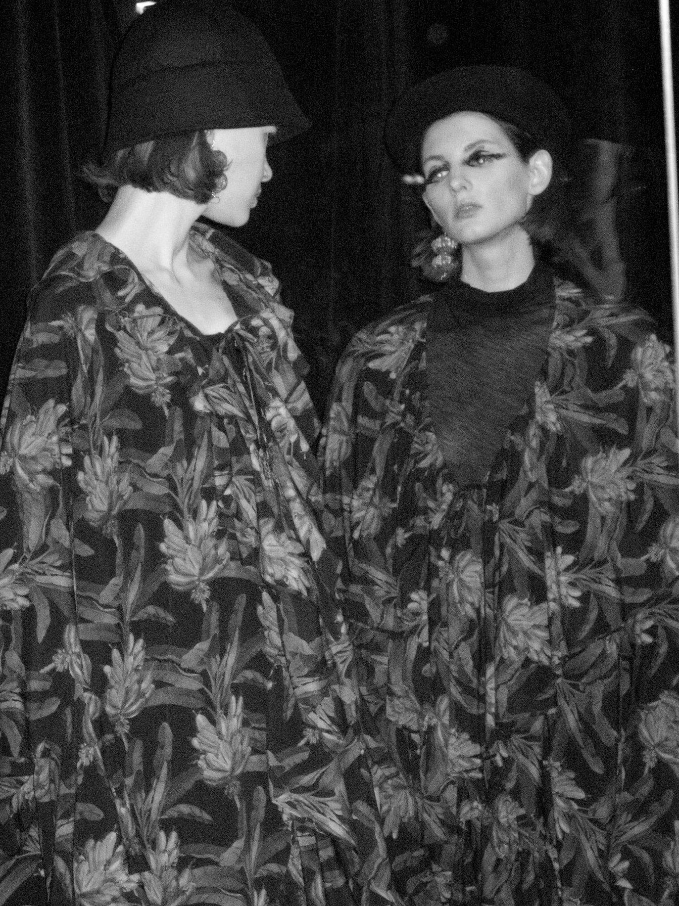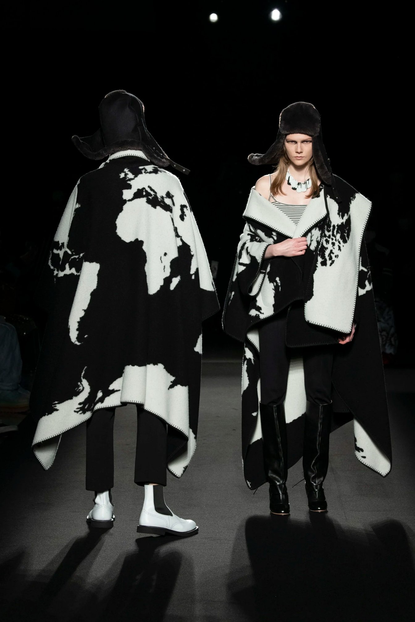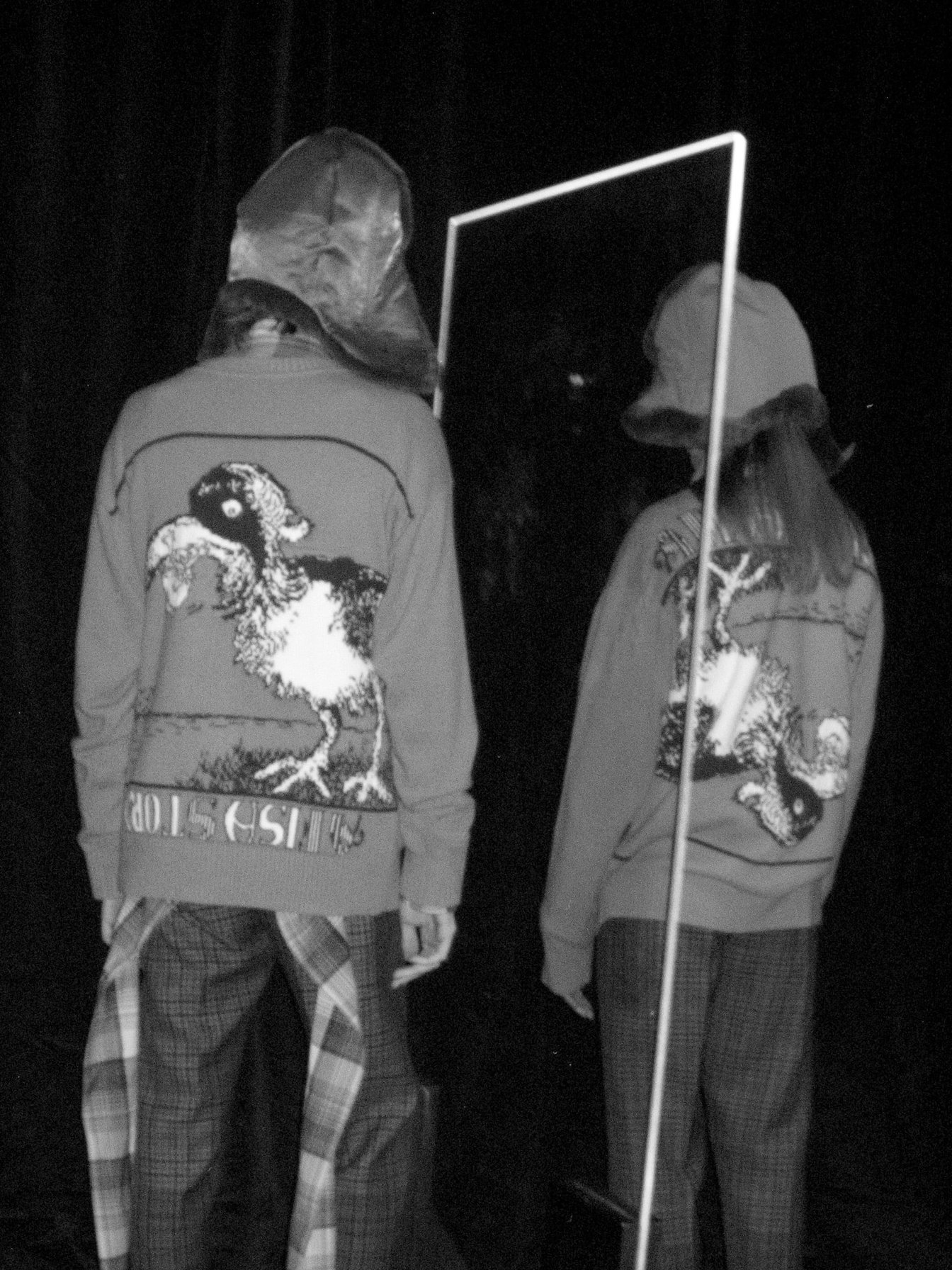 上手と下手から登場するモデルは対になっており、同じ服を違った着方でスタイリングしている。単に上下逆さに着るだけではなく、前と後ろを逆に着たり、バッグは持ち手を逆にしたり、鏡のように左右対称だったり……。素材や柄は同じだが、シルエットやボリューム、丈などが異なっているため、見る側は「どうなっているのだろう」と、まるで間違い探しのように左右の服に見入ってしまう。