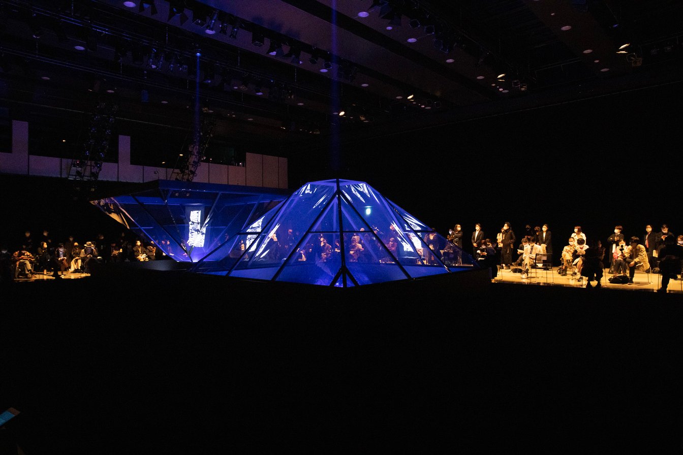 まず会場に入って目を奪われたのが、中央に上下対に設置された2つのピラミッド型の装置。モニターによってショー映像が上下が逆さに映し出され、今回の上下対極のテーマを視覚的に伝える。ショーがスタートしてピラミッドには音符が浮かび上がるが、BGMの音楽もが逆さのメロディーを奏でているという手の込みようだ。
