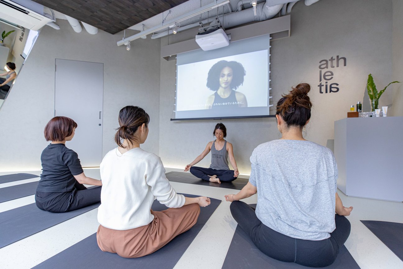 「アスレティア 表参道」はブランド初のフラッグシップショップ。ラルフローレン表参道店から神小通りに曲がってほど近くに位置。スタジオとショップの2つの機能を持ち、肌や身体、ライフスタイルの新しい提案や情報を発信しています。2階のスタジオではヨガやマインドフルネスのレッスンを実施。男女別に更衣室があるので、しなやかなライフスタイルを目指す男性にもおすすめ。