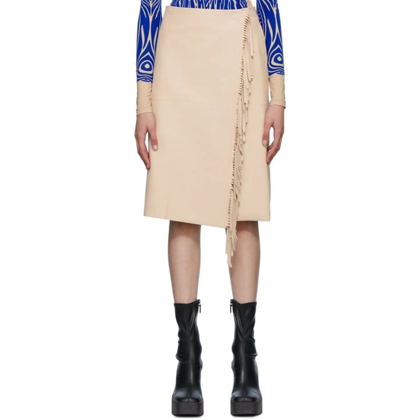 「ステラ マッカートニー(STELLA McCARTNEY)」のフリンジスカートは、シルエットやカラーも相まって早くも秋を感じさせるデザイン。レザータッチな生地が、よりリュクスな印象を与えてくれます。