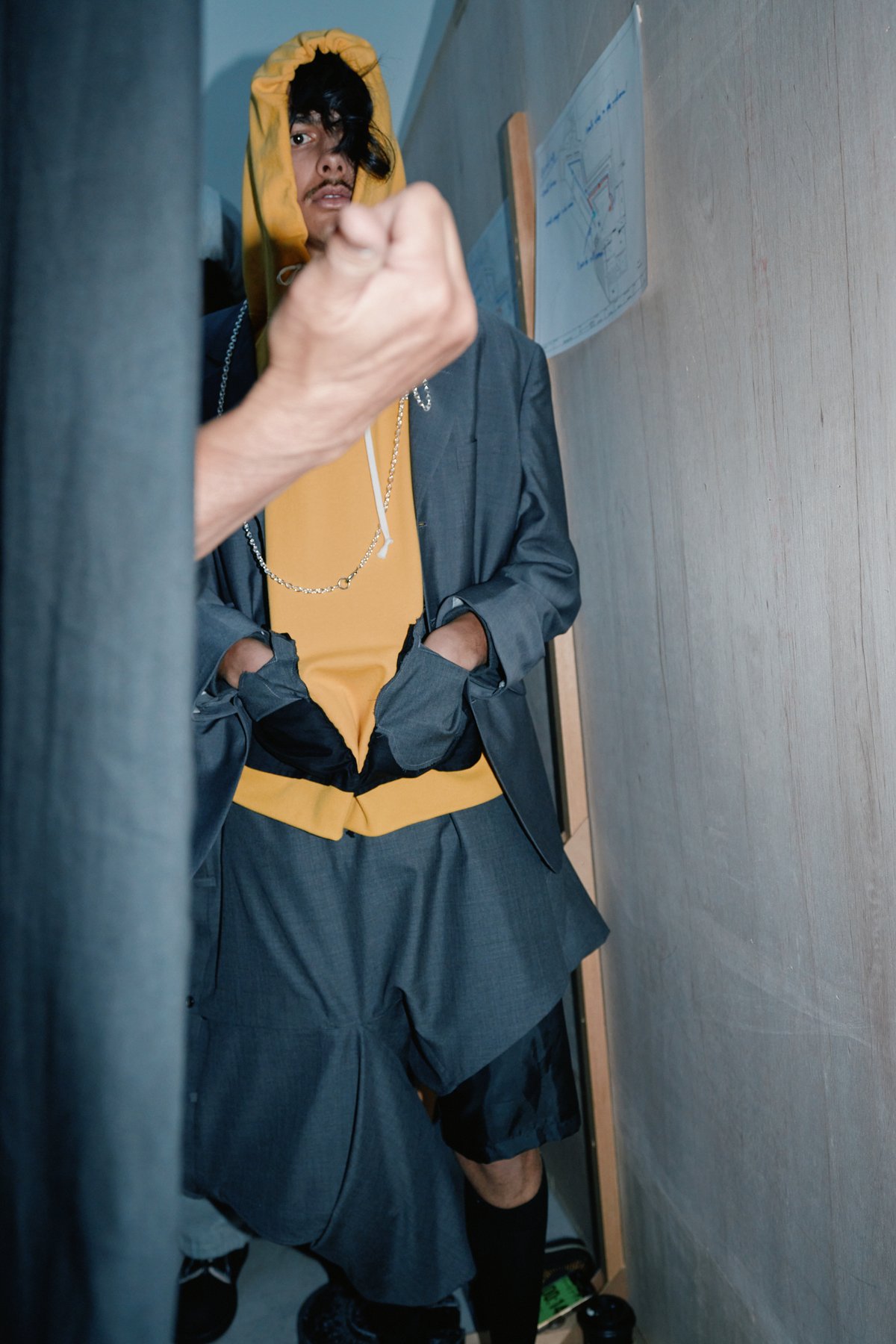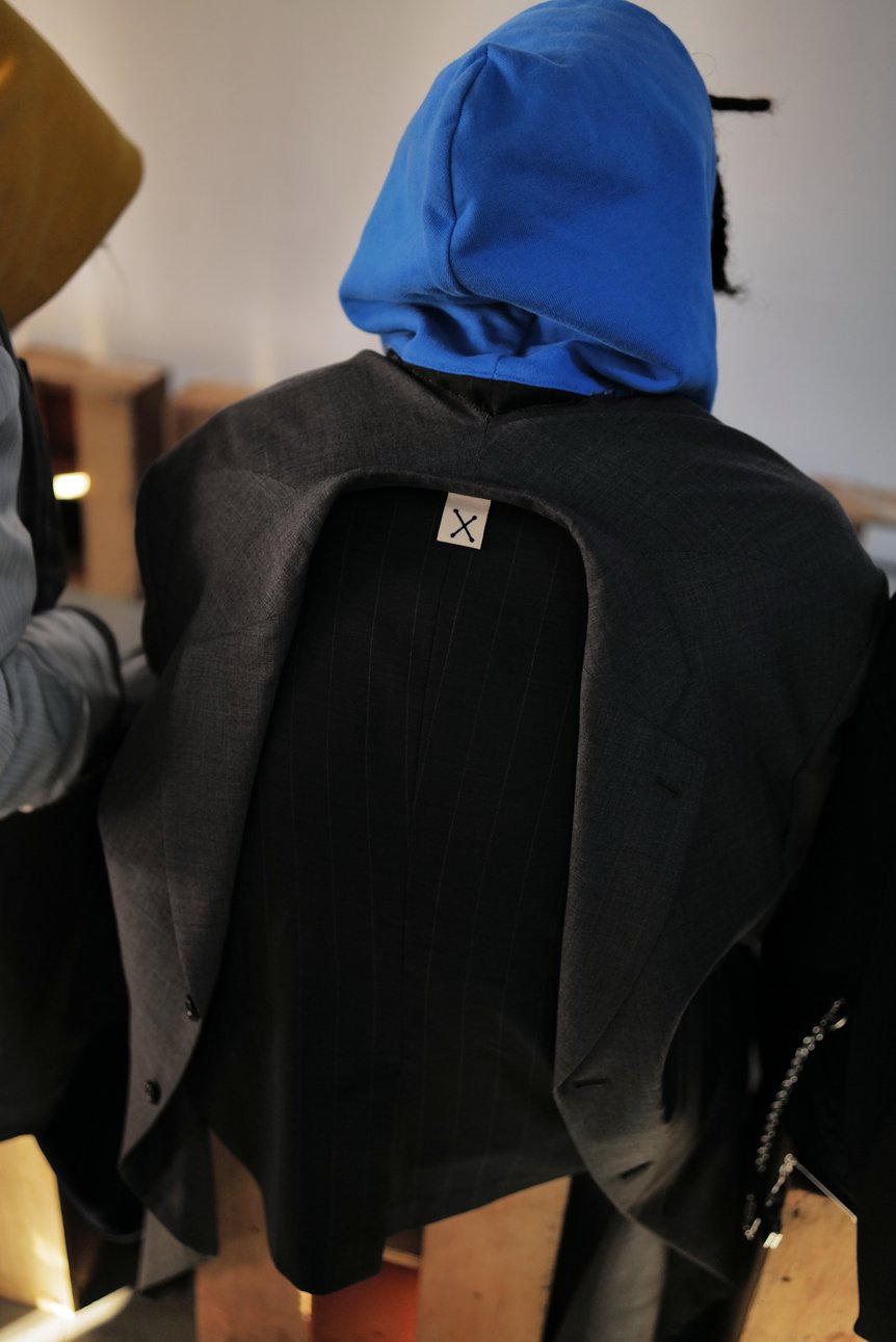 また、前シーズンでのシャツへのアプローチと同様に、今回は「ジャケット」がジャケットとして成立する要素やバランスを探求。「人々は腰ポケットや袖のパーツを『ジャケット』と記憶しているのではないか」という仮定から、ジャケットの腰ポケットをヒップに付けたスウェットパンツや、フロントに付けたフーディー、前裾からテーラードジャケットの裾を覗かせた裏毛のジップアップフーディー、前身頃の肩部分からインサイドアウトのジャケット袖が垂れ下がったTシャツなどが生まれたという。