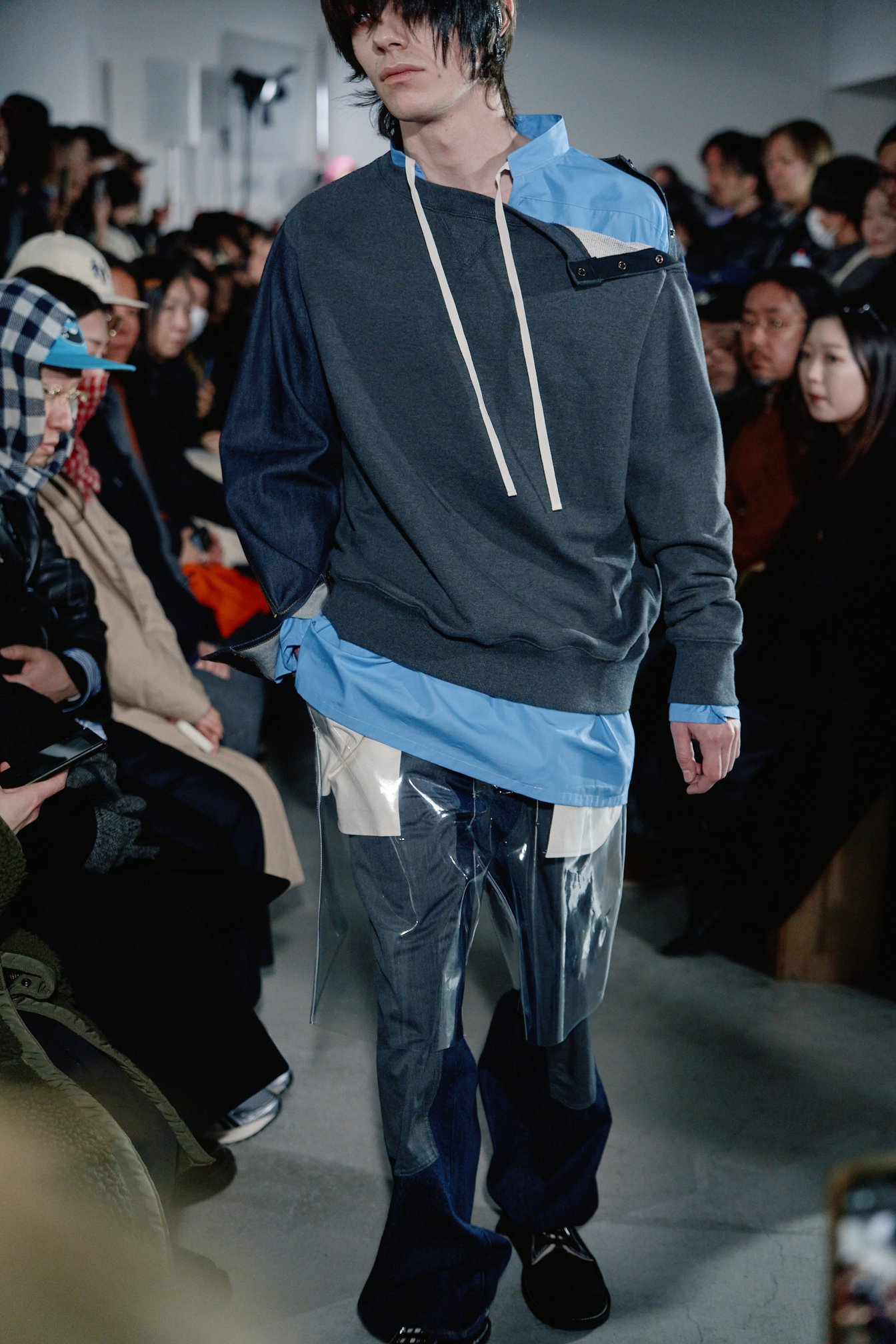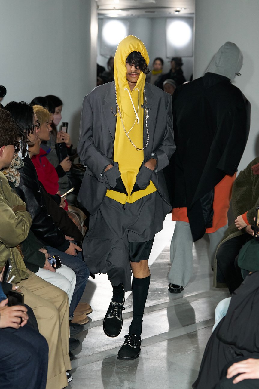 さらに、フォーマルなスーツをフーディーやスウェットパンツ、Tシャツ、デニムといったストリート文脈のアイテムとドッキングさせたり、黒やグレーが基調のアイテムにイエローやオレンジ、グリーンなどの原色や、PVC素材のクリアカラーを取り入れることで、異なるテイストや要素を融合した。