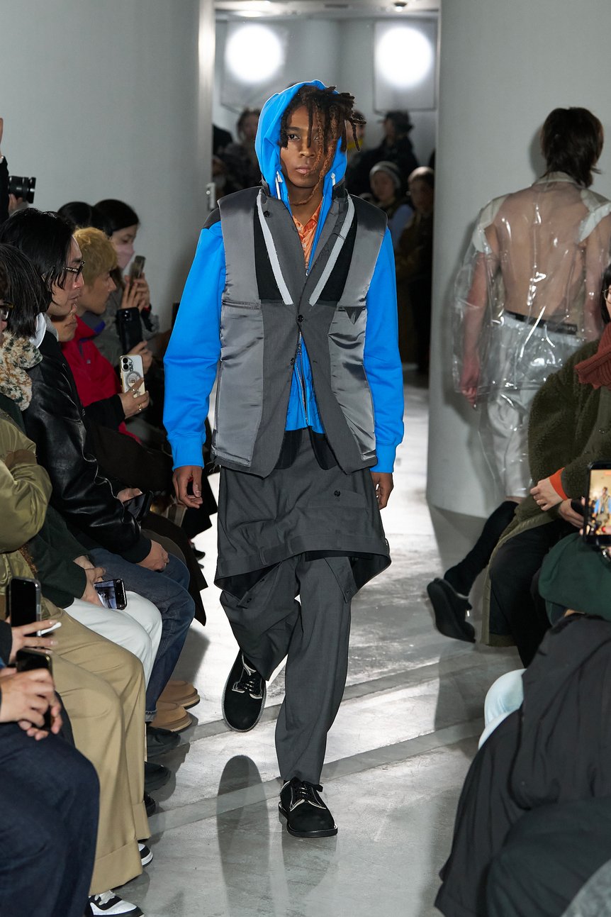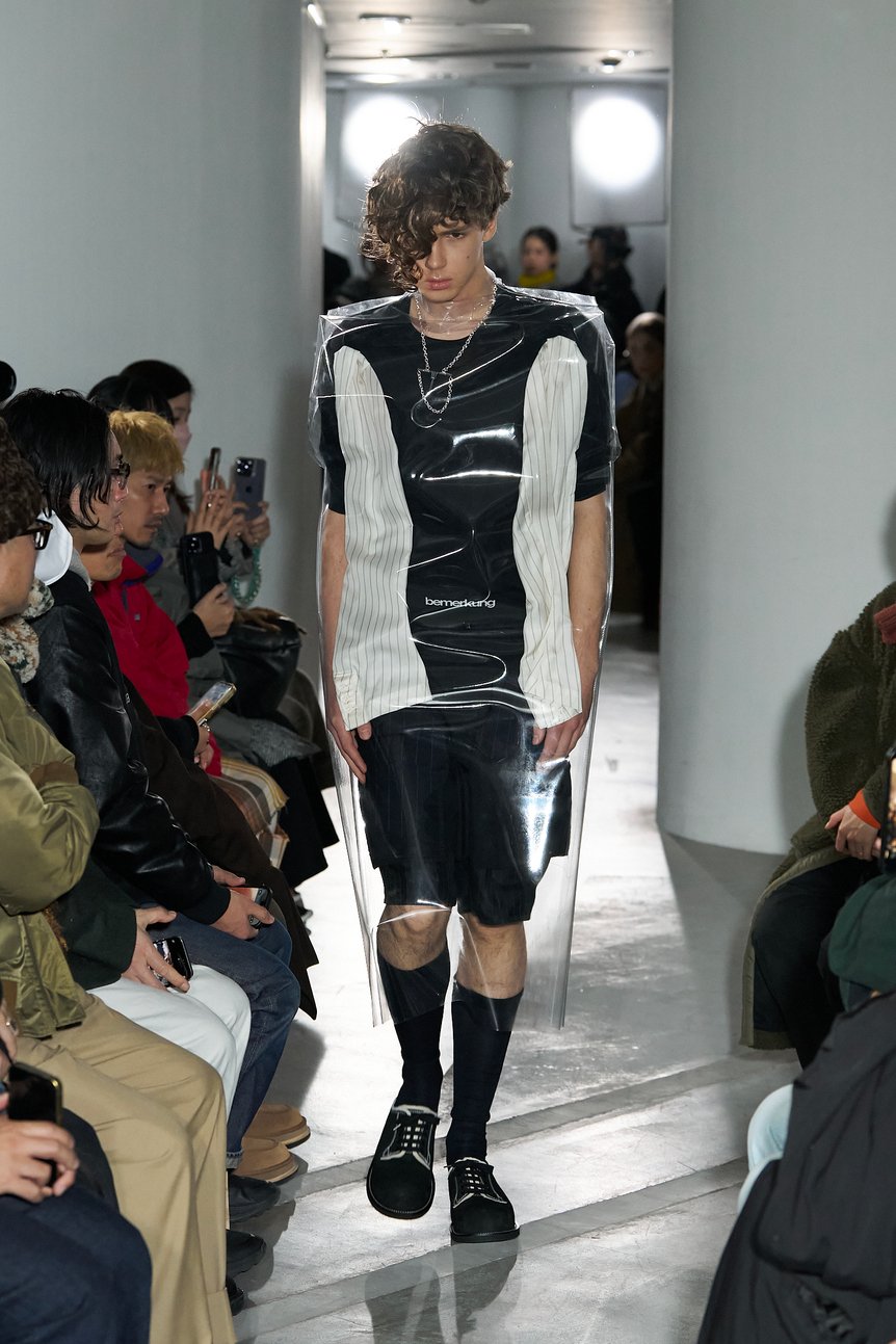 「コム デ ギャルソン オム プリュス(COMME des GARÇONS HOMME PLUS)」で約8年間パタンナーとして経験を積み、2025年秋冬シーズンにデビュー。3シーズン目にして早くもランウェイショー形式での発表を選択した2026年秋冬コレクションのテーマは、「Beyond Reframing」。そこで池田が示したのは、パタンナーならではの視点と手作業から生み出された実験的デザインが喚起する、「服」そのものの根源的な面白さと楽しさだった。