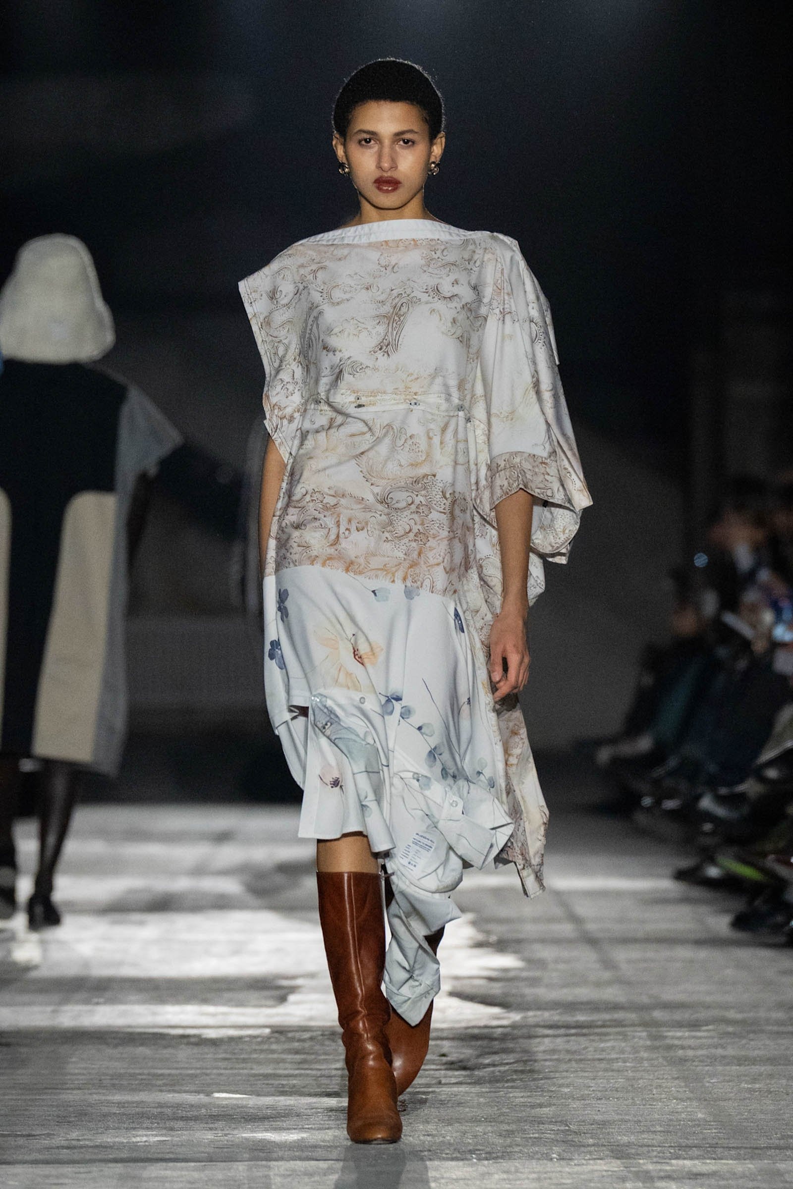 「カシア クチャラスカ(Kasia Kucharska)」の2026年秋冬コレクションでは、自身の母性や感情の揺らぎといった内面的テーマを、手書きの斜線のように描かれたラテックス素材とコットンシャツの柔らかなフォルムの対比によって可視化。シャツやスカートといったベーシックなアイテムを、巻く・結ぶ・外すといったモジュール構造へと変換し、ドリーミーな世界観の中にも力強さを持ち合わせたコレクションを発表した。