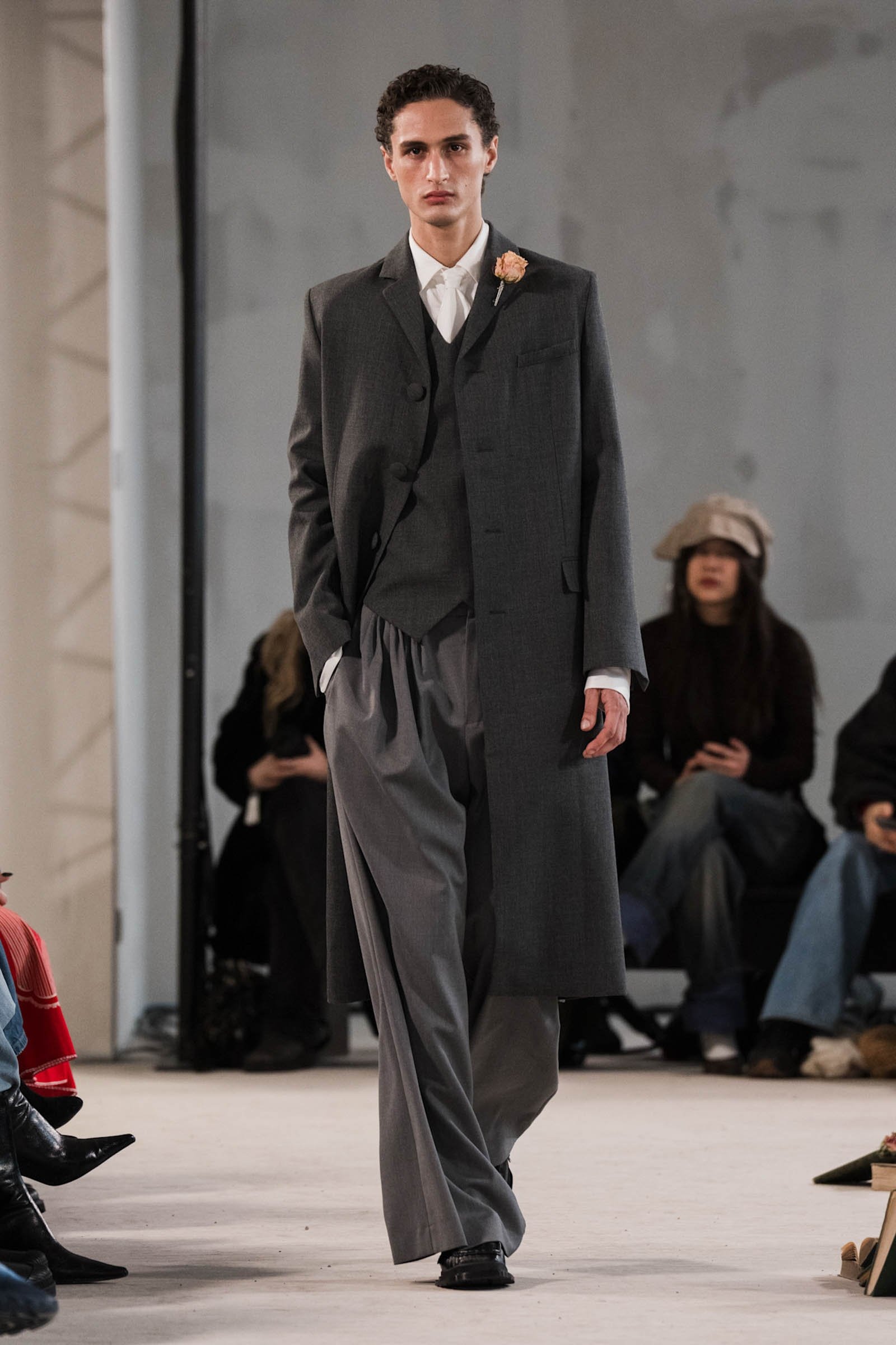 マリオ・カイネ(Mario Keine)が手掛ける「マルケ(MARKE)」は、ケルンを拠点に、テーラリングを基軸としたコンテンポラリーファッションを提案するブランド。上質なイタリア製の余剰生地と機能素材を組み合わせ、メンズを主軸にユニセックスな視点で再構築されたジャケットやパンツは、クラシックな仕立てとスタイリングで叙情的なムードが漂う。2026年秋冬では、アイコニックなくるみボタンの配置や、わずかなズレを意図的に残したプロポーションが際立った。他ブランドとは一線を画くベルリンモードの分野を切り拓き、シーズンごとに存在感を増している。