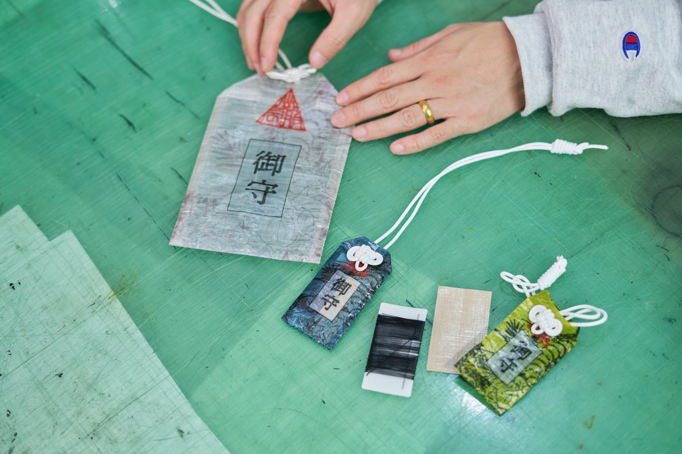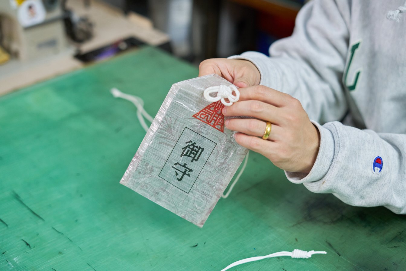 上出:これまでにバムフラップと半袖フリース、手拭いを発売しました。開発中の最新作は、僕らが愛してやまないDCF(キューベンファイバー)にオリジナルでプリントを施した「御守」シリーズです。本当に山に持っていってほしい御守りで、中にはDCFの補修パッチと縫い針と縫い糸を入れていています。山で万が一持ち物に穴が開いたりしたら命取りなので、願掛けだけでなく、本当に“御守り”として穴を補修できるリペアキットです。さっきのような薄い生地のテントに穴が開いたときにも便利ですね。