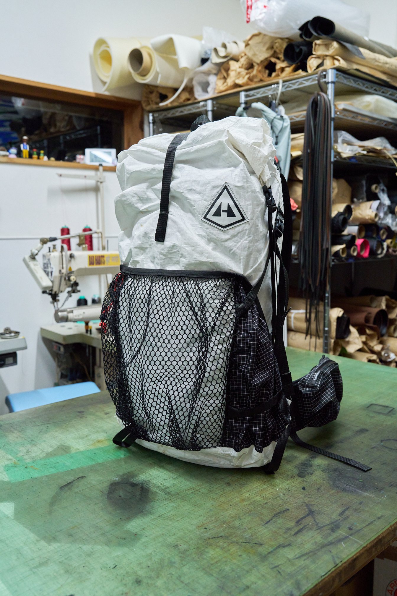 上出:山では色々な持ち物が濡れるので、濡れたものが乾くまでなんでも一旦入れておけるという点でメッシュは便利なんですが、枝などに引っかかりやすいのが欠点なので、サイドはメッシュじゃない方が使い勝手が良いです。ハイパーライトの大きいバックパックを買ったのは「ポーター」以来なんですが、クオリティが間違いないのはもう知っているし、8年使っても壊れていないし、正直買う必要はありませんでした。なのになぜ今年これを購入したかというと、まだどのブランドも使用していない最新の素材が採用されたからです。
