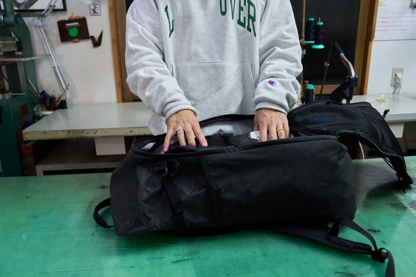 上出:結局、生地で選んじゃいますね。これを買ったときはまだ先ほどの「ジャンクション(新型)」が発売されていなかったんですが、このウルトラという生地が出てきたときも結構驚きました。ものすごくざっくり言うと、「ポーター」にも使われていたDCHの次に登場したのがこのウルトラで、防水性も強度も高いし、見た目もいい感じ。ウルトラが使われているものを色々買って試していた一環でこちらも購入しました。メイン素材がウルトラ400TXで、サイドポケットはダイニーマのストレッチ素材を採用しているのでよく伸びます。モノを入れていないときはスッキリとしているのに収納力が高い。機内持ち込みができるサイズでありながら36Lとある程度の容量があり、クラムシェル型でガバッと大きく開くので荷物のオーガナイズがしやすく、軽量なのも飛行機移動が多い人間にとっては嬉しいですね。PCスリーブが背面に独立しているので、パソコンを手荷物検査のときにすぐ取り出せて便利です。国をまたぐ移動のときは基本的にこれひとつで、大きな荷物を運ぶときはこれに加えてスーツケースも持ちます。