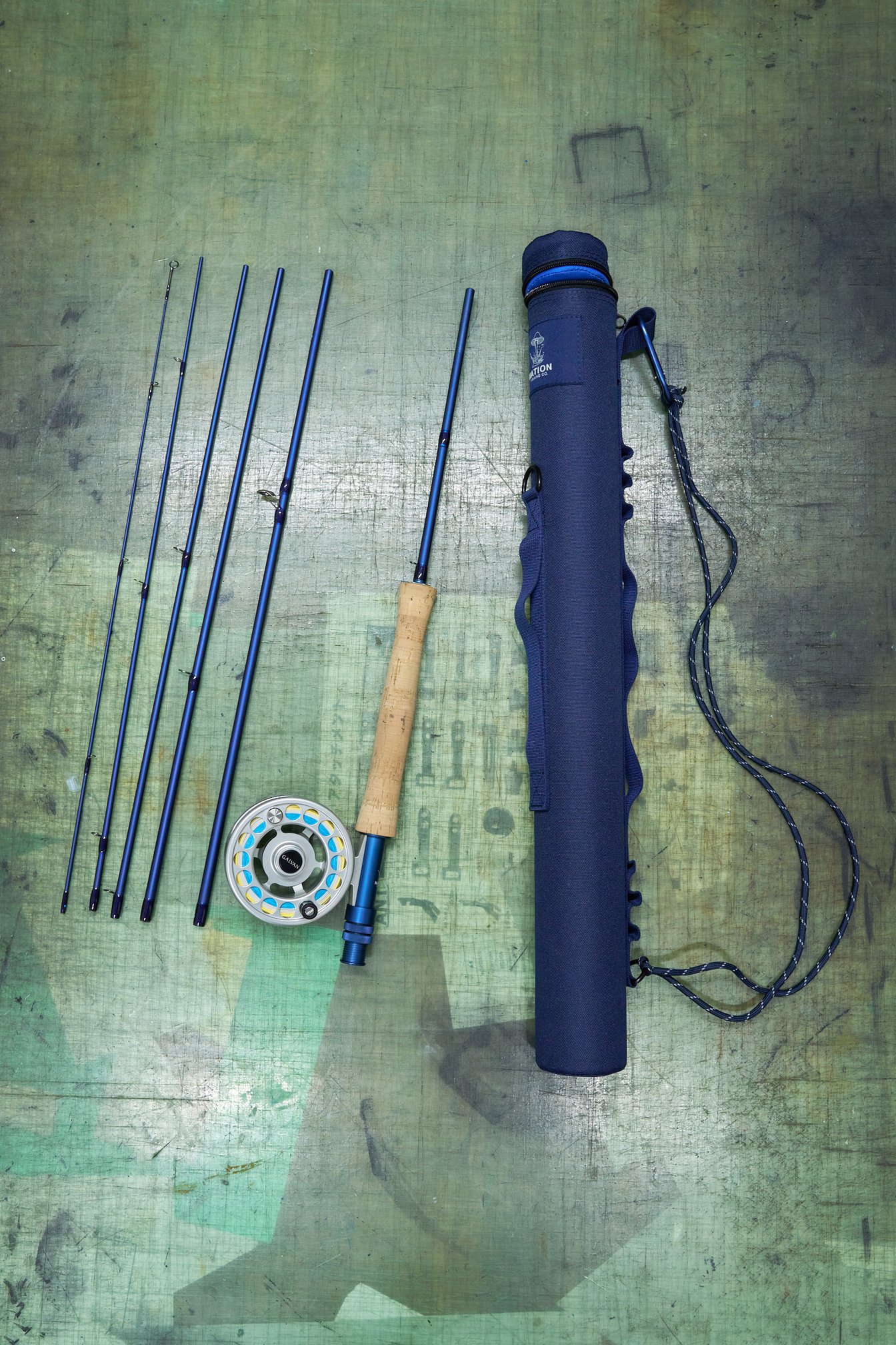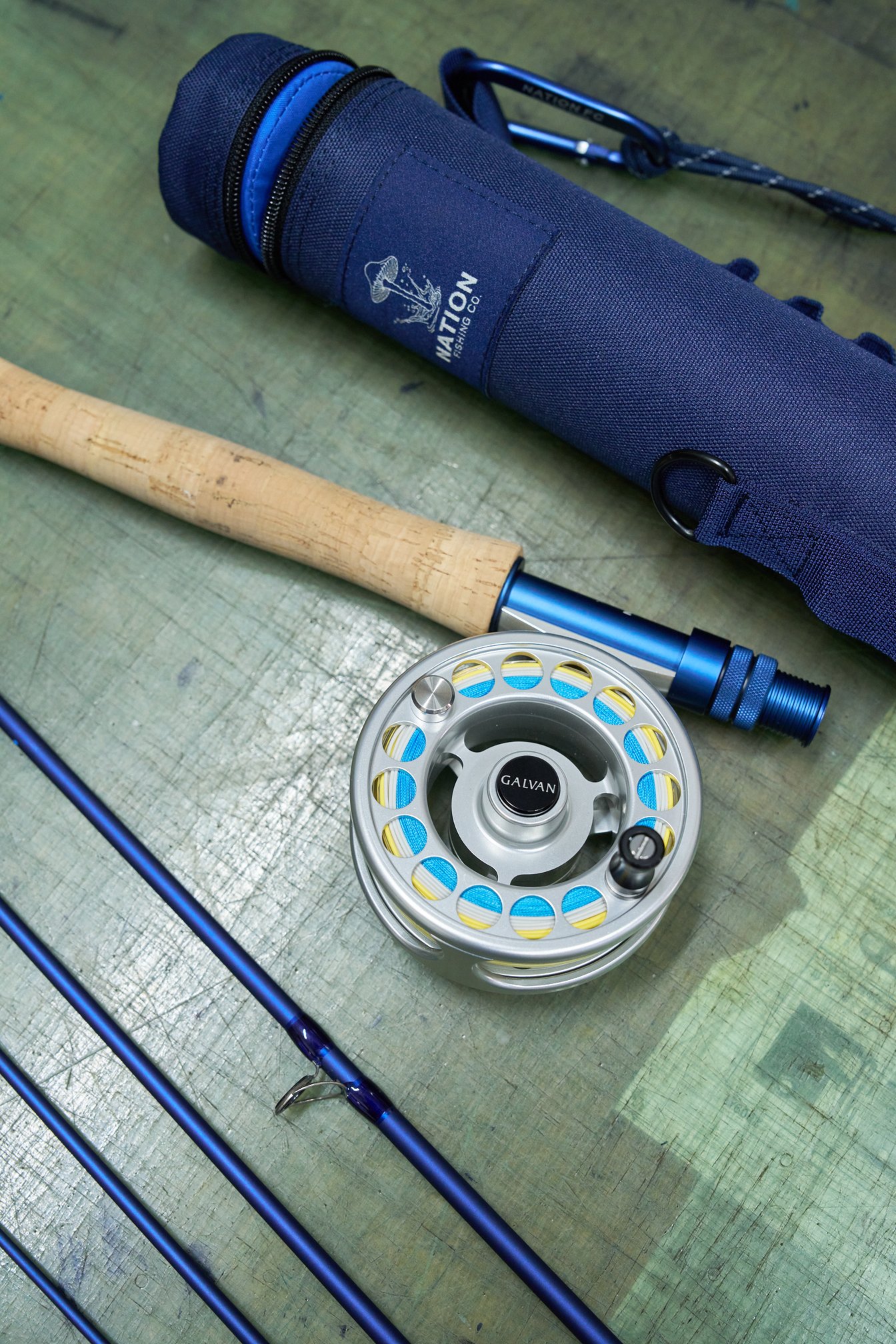 上出:釣りは元々餌釣りから始めて、その後いわゆるスピニングリールやベイトリールをしていたんですが、山に登るようになってからはテンカラ(竿、ライン、毛鉤のシンプルな仕掛けでヤマメやイワナなどの渓流魚を釣る日本の伝統釣法)という釣り方に変えました。多分世界で一番シンプルな釣り方で、道具が軽いので山に持っていくには最適です。ただ、テンカラではせいぜい3mの竿と3mのライン(釣り糸)の計6mしか毛鉤を飛ばすことができないので、アメリカの広大な川には太刀打ちできず、ついにフライフィッシングを始めることにして、道具を揃えました。ロッド(竿)が「ネーションフィッシングクラブ(NATION FC、以下 ネーション)」、リールが「ガルバン(GALVAN)」というブランドのもので、どちらも先日ニューヨークで知り合った方が作っているブランドです。フライフィッシングの道具ってかっこいいですよね。