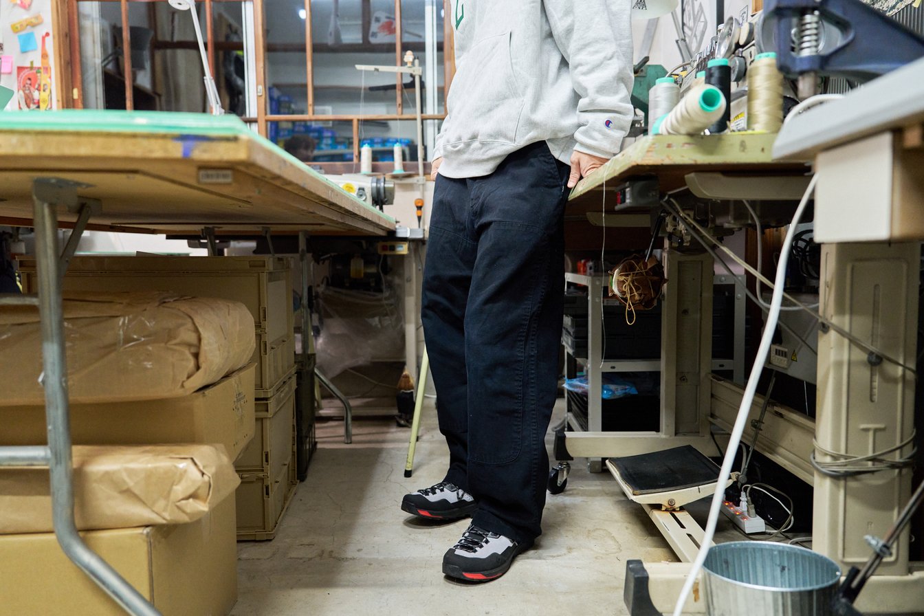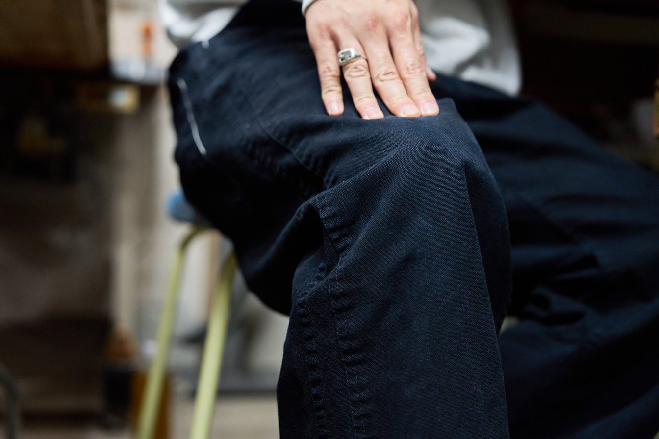 上出:はい。結局友達が作っている服が一番いいんですよ。友達の服だからといって必ずしも快適なわけではありませんが、これはめちゃくちゃ快適。クライミング用に作ったパンツで、分厚いダック地を使っていて、膝はダブルニー仕様になっています。クライマーって「カーハート(Carhartt)」のダブルニーをよく穿いていて、岩に擦れて膝に穴が開いているのがかっこいいんですよ。それを自分たち用にアップデートしているのがこのパンツ。シルエットはすごくシンプルなストレートで、着ていてとても楽です。毎日のように穿いていて、ちょっと色が落ちてきていますね。