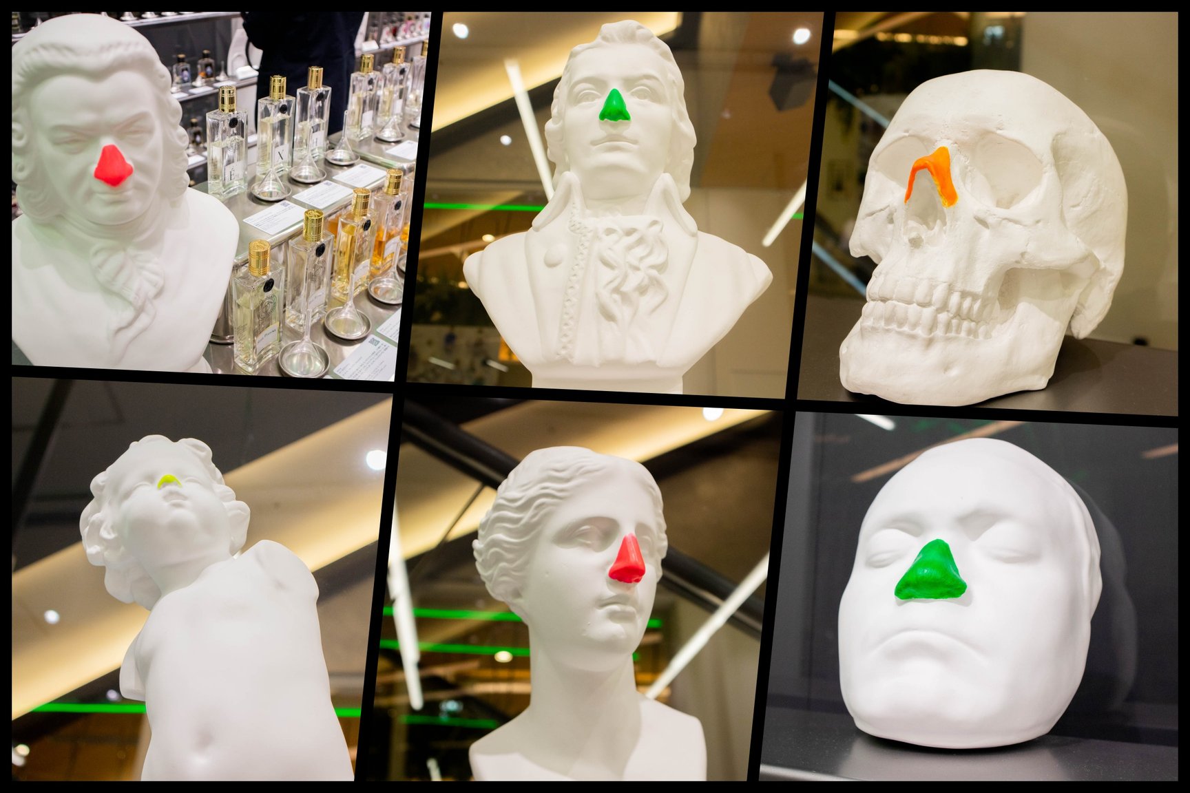 気軽に香りを楽しめる店舗設計に重点を置いたことですね。ちなみに、僕らの裏テーマは「香水の民主化」。店名は分かりやすく「ノーズショップ(=あなたの鼻が主役です)」にしました。壁もなるべく取り払って、オープンな空間を設計して。クスッと笑えるギミックとして、店内の石膏のようなオブジェに「香りは十人十色」というメッセージを込めて鼻のパーツだけ一体ずつ色を変えているんです。徹底的にお客さんが気軽かつ自由に嗅ぎ比べできるような空間にして、接客でも自由を妨げないようにしています。