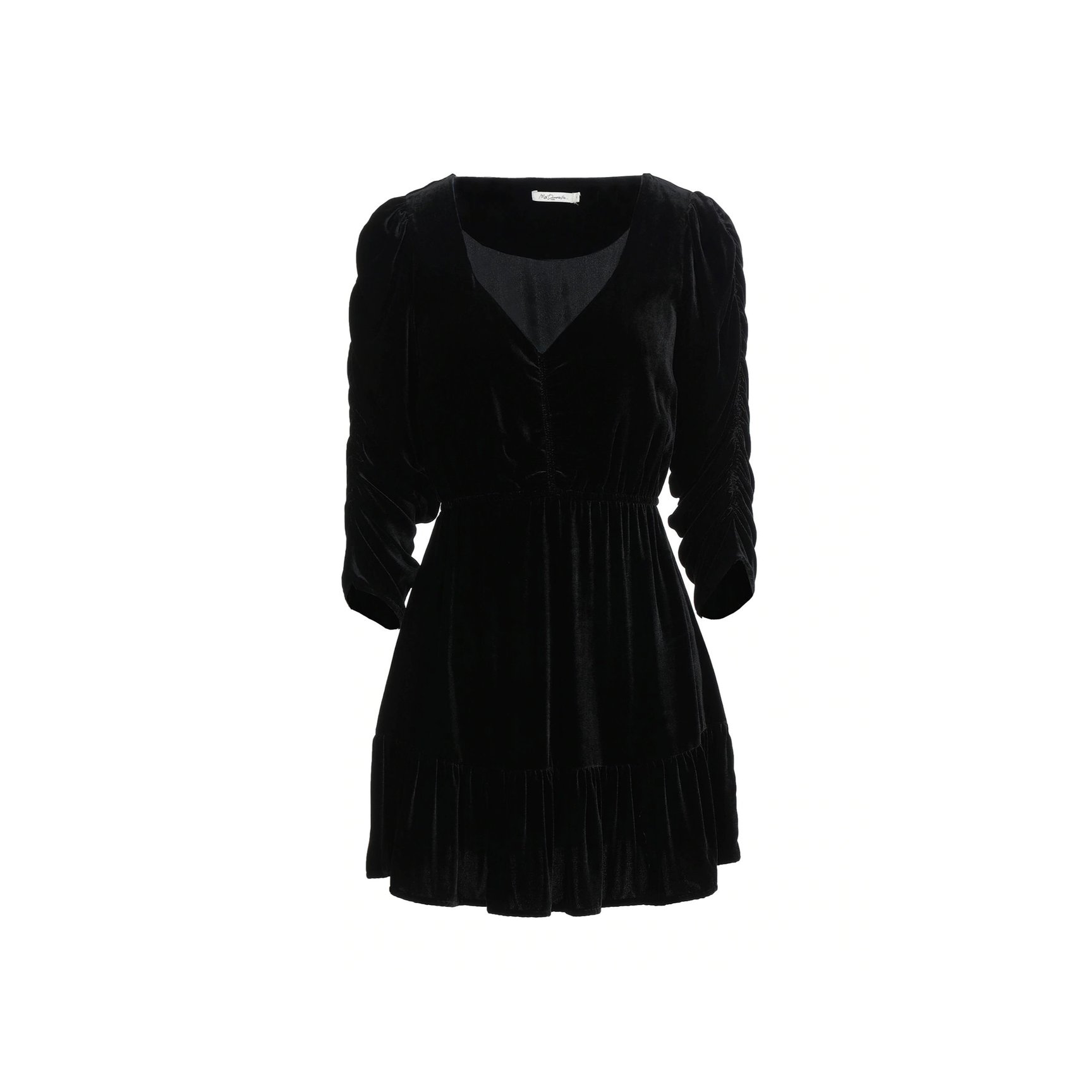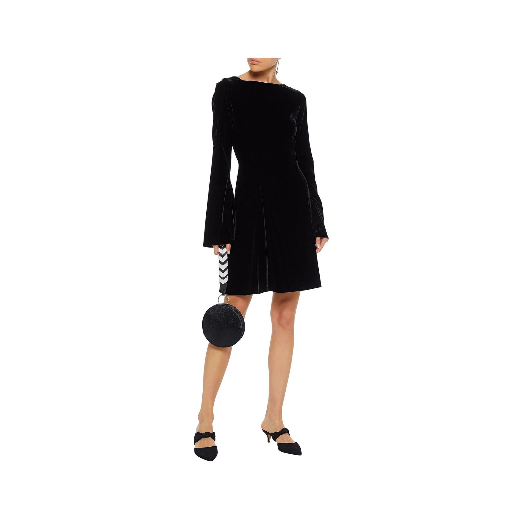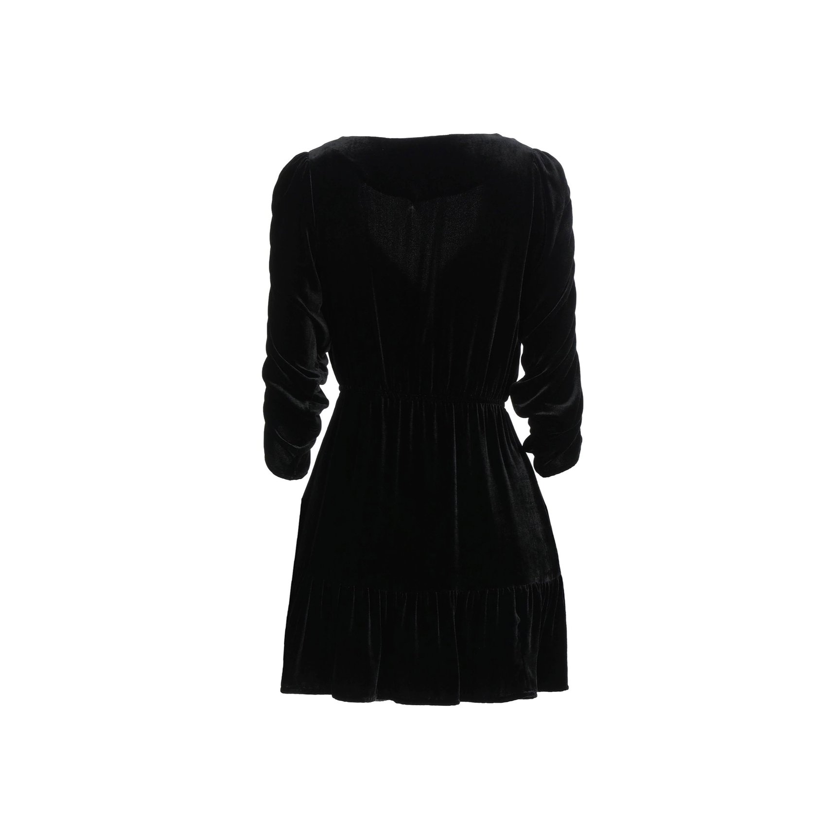 パリ発「メドモワゼル(Mes Demoiselles)」のベルベットワンピースは、ギャザーの入った七分袖とフレアシルエットのミニスカートによる適度なメリハリがポイント。Vネックのネックラインで程よく肌見せも。