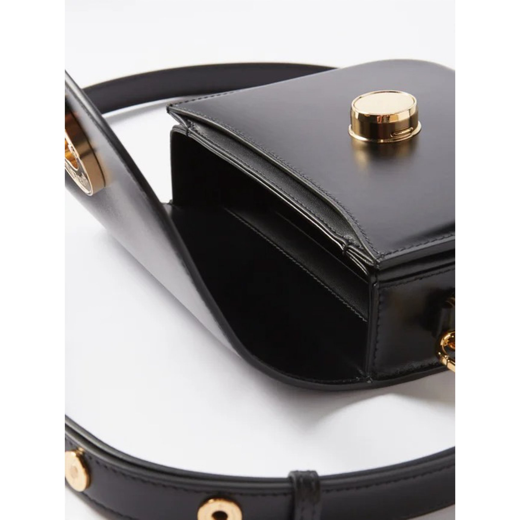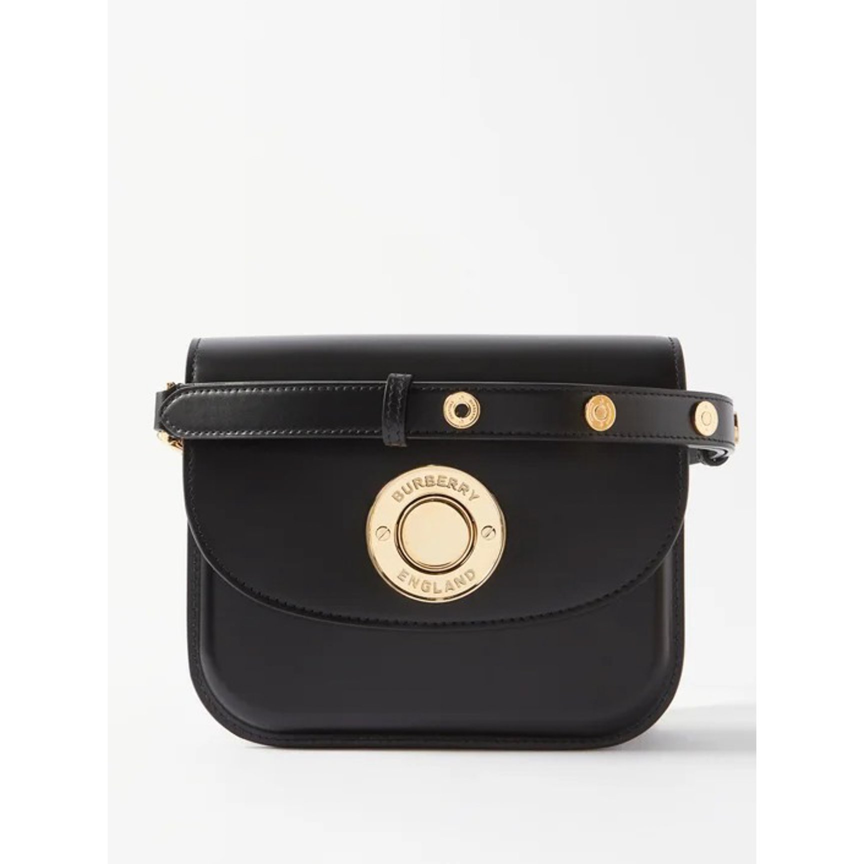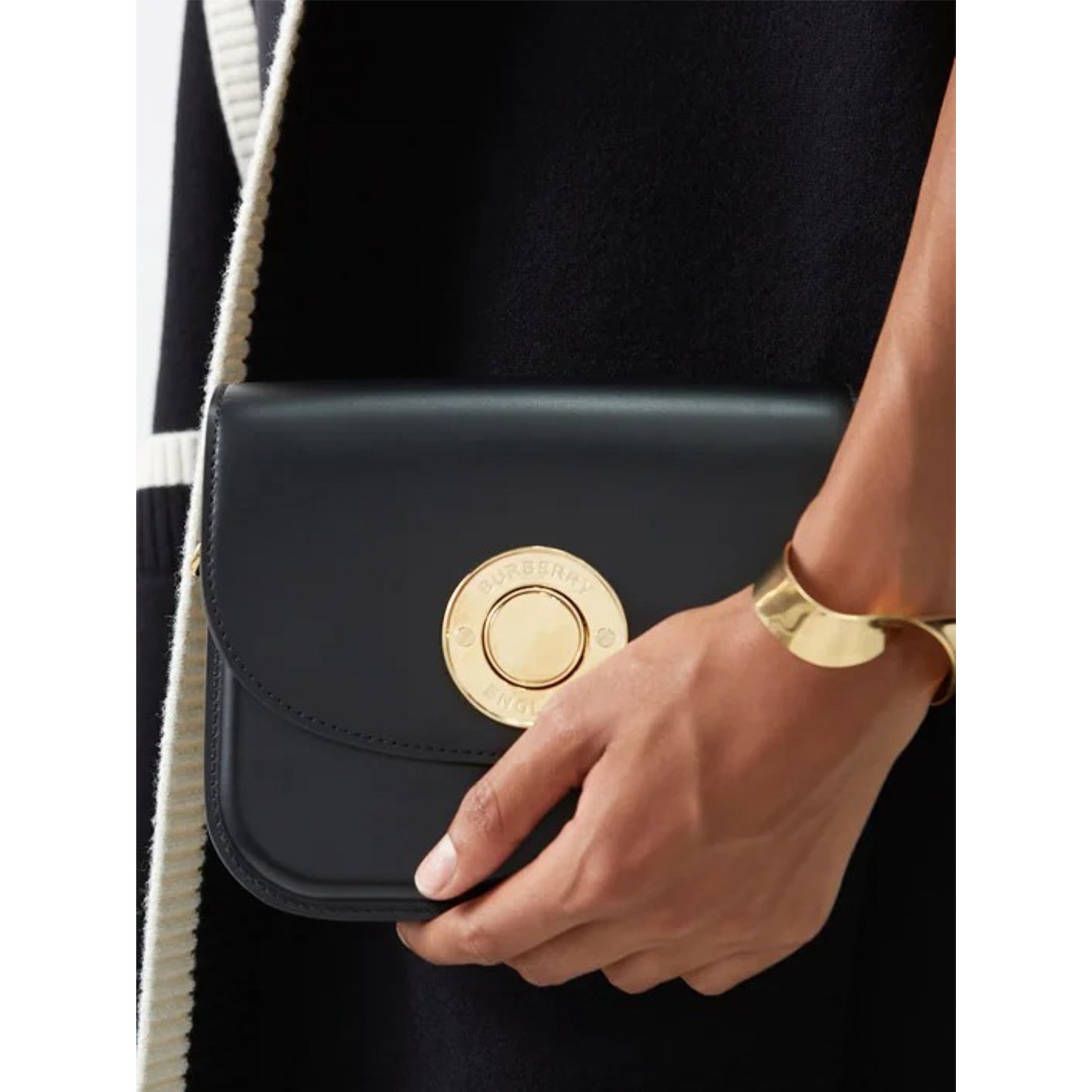 「バーバリー(BURBERRY)」のロゴをエングレーブで施したゴールドトーンのまん丸とした金具が、コーディネートを華やかに彩ります。コンパクトながら内側は3つのスペースで仕切られているので使い勝手の良さも叶います。
