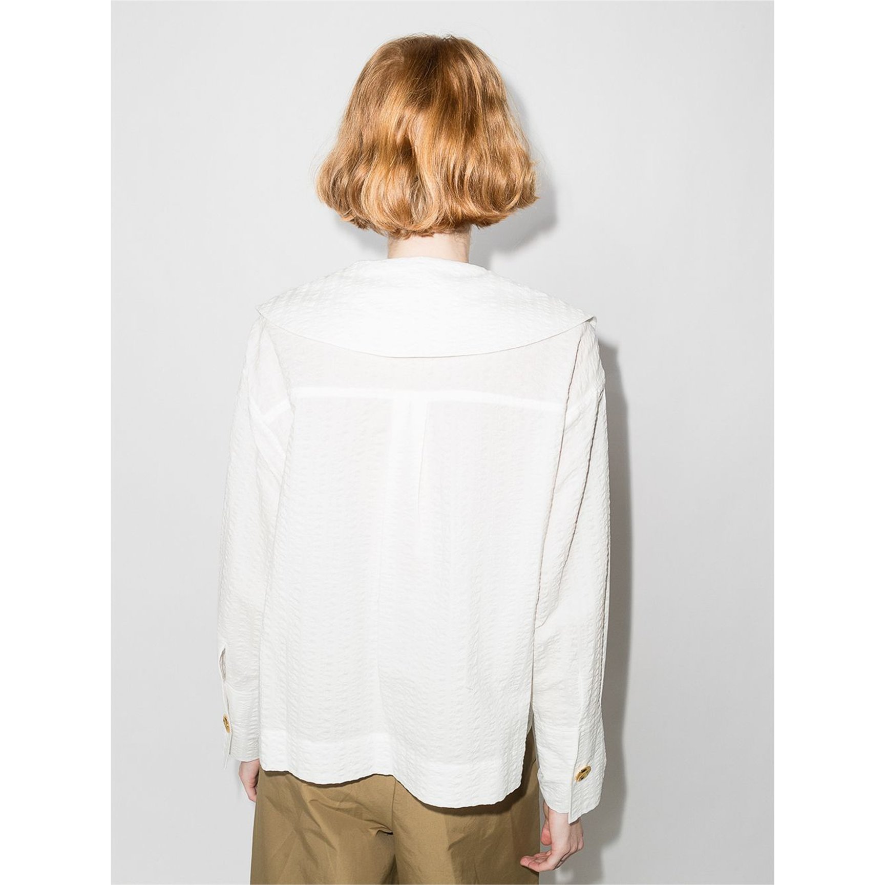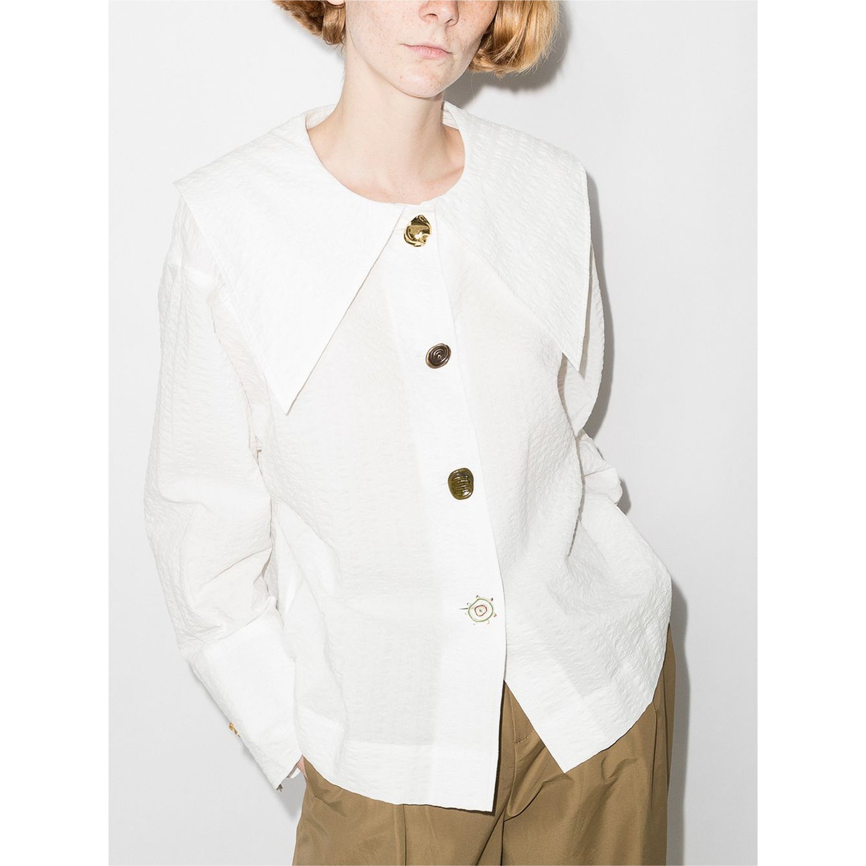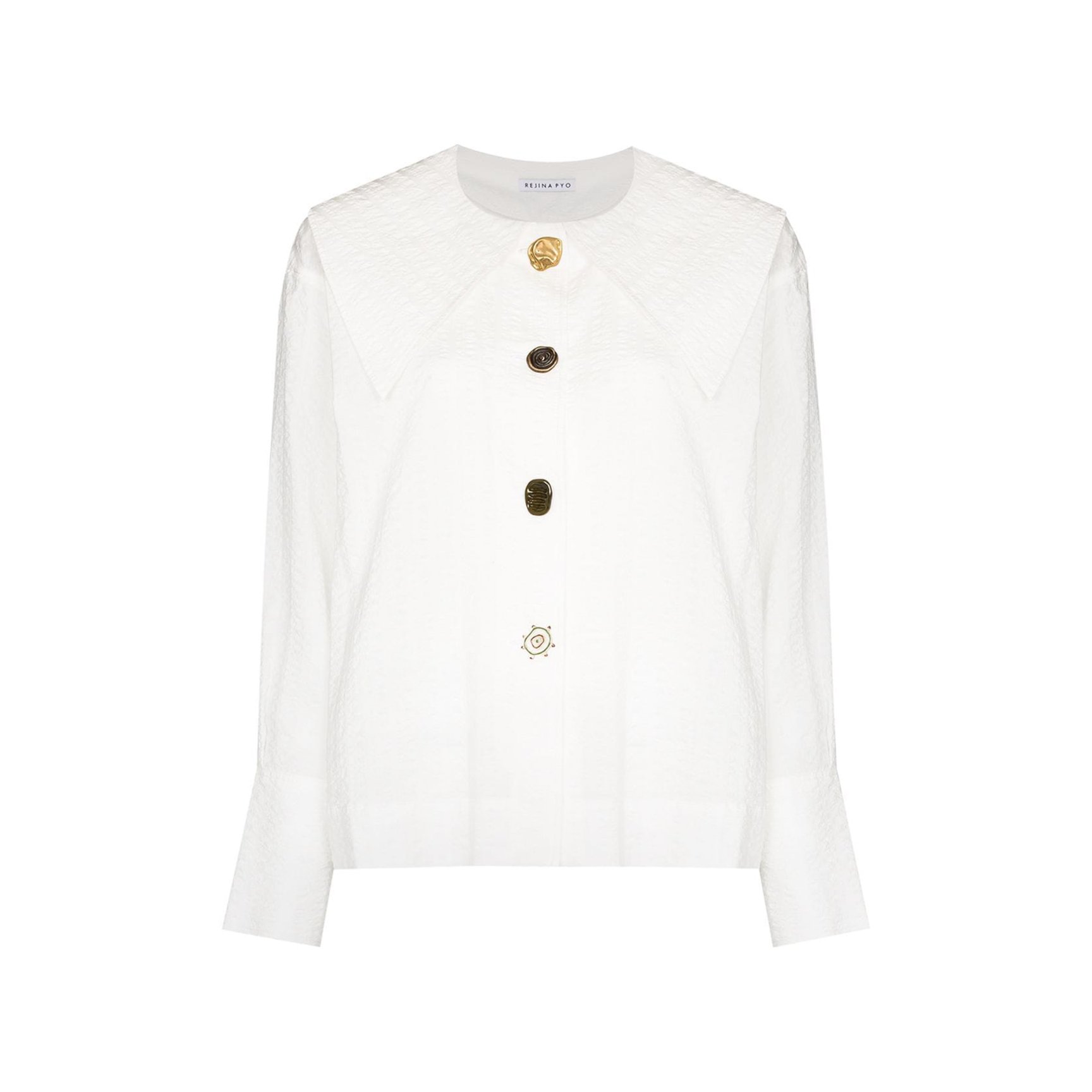 遊び心満載のデザインが毎シーズン楽しみな「レジーナ・ピョウ(Rejina Pyo)」から、レトロムード漂うブラウスをご紹介。肩まで届くビッグカラーとレジーナ・ピョウならではの様々なデザインの飾りボタンがポイント。ジャケットをさらりと羽織ってクラシックに着こなしたい一枚です。
