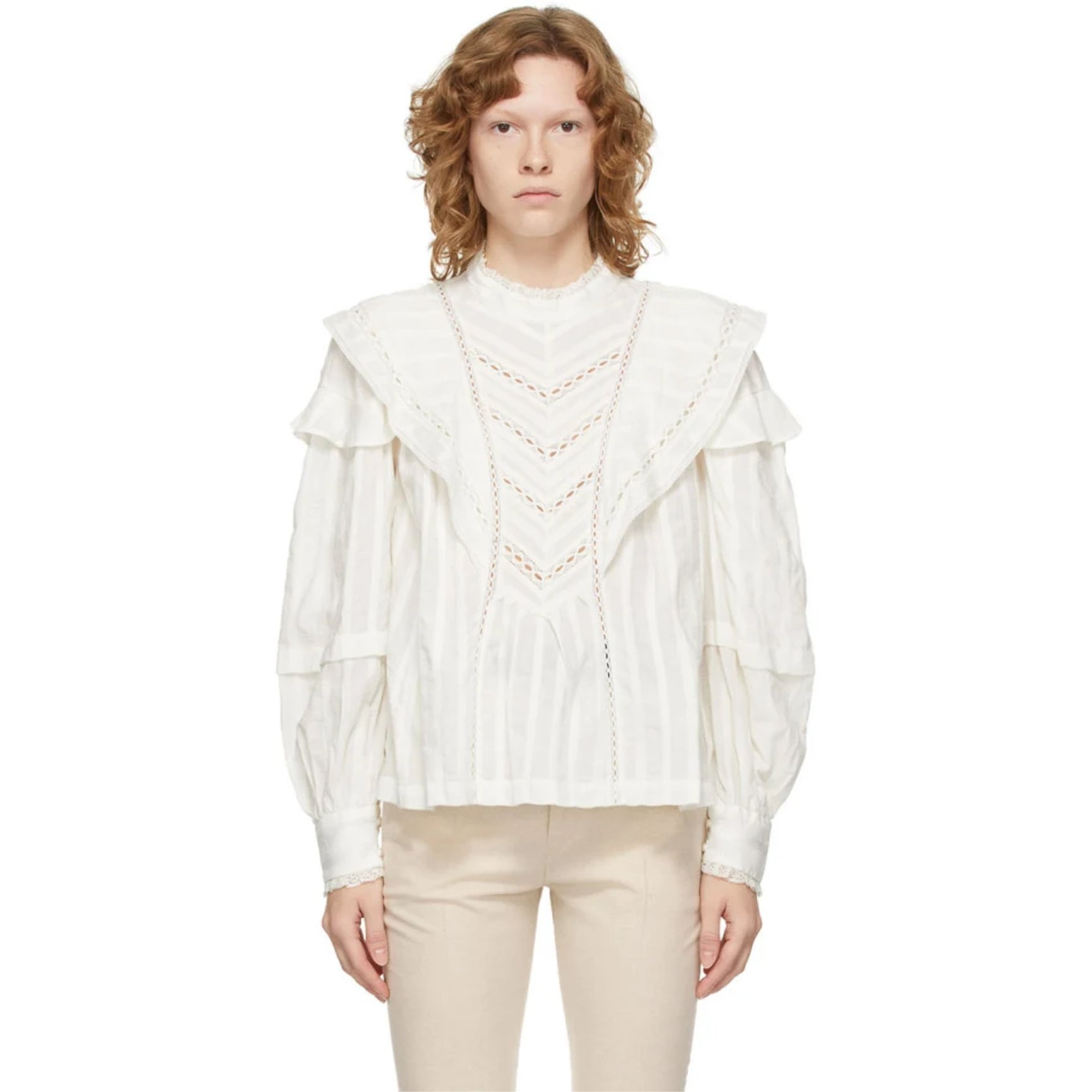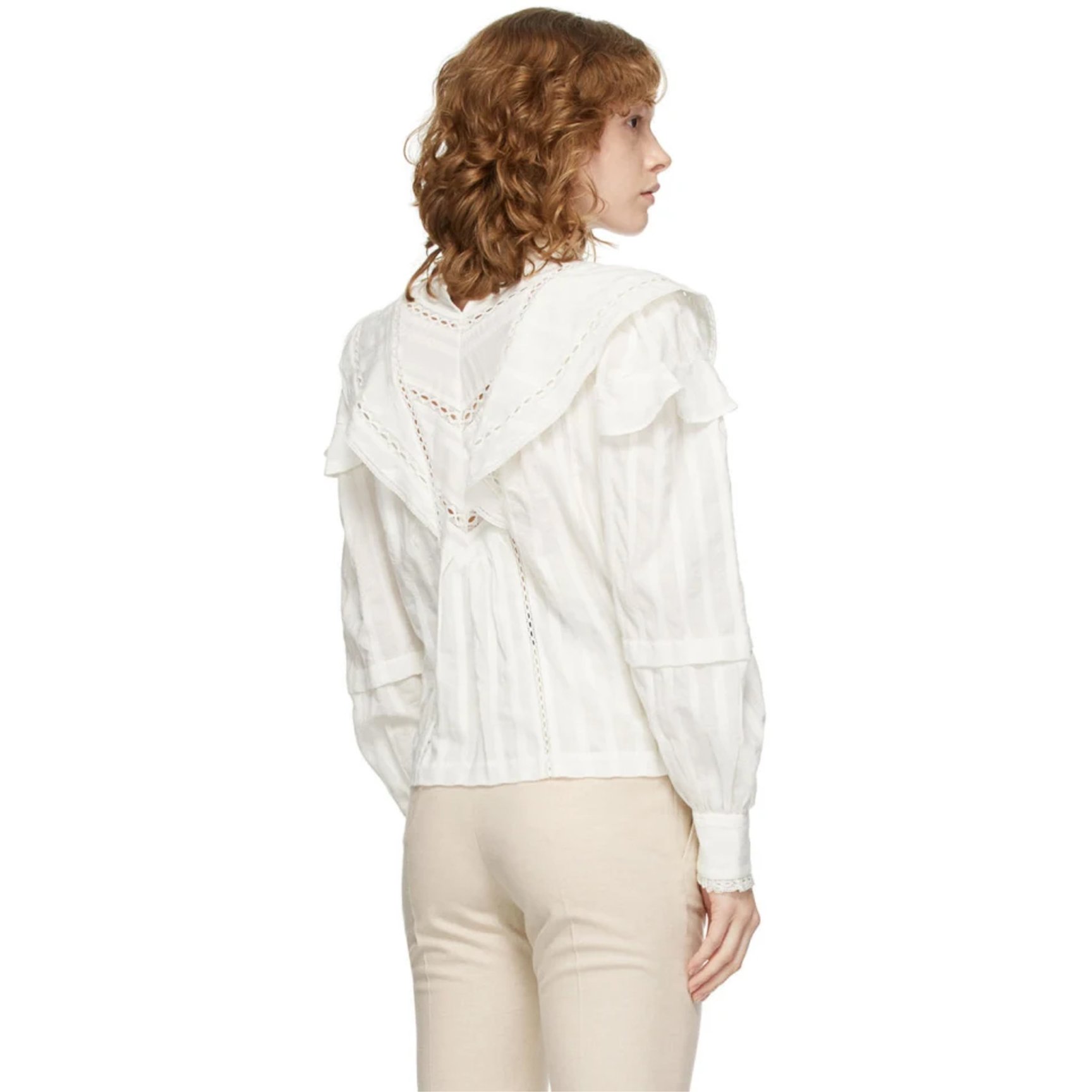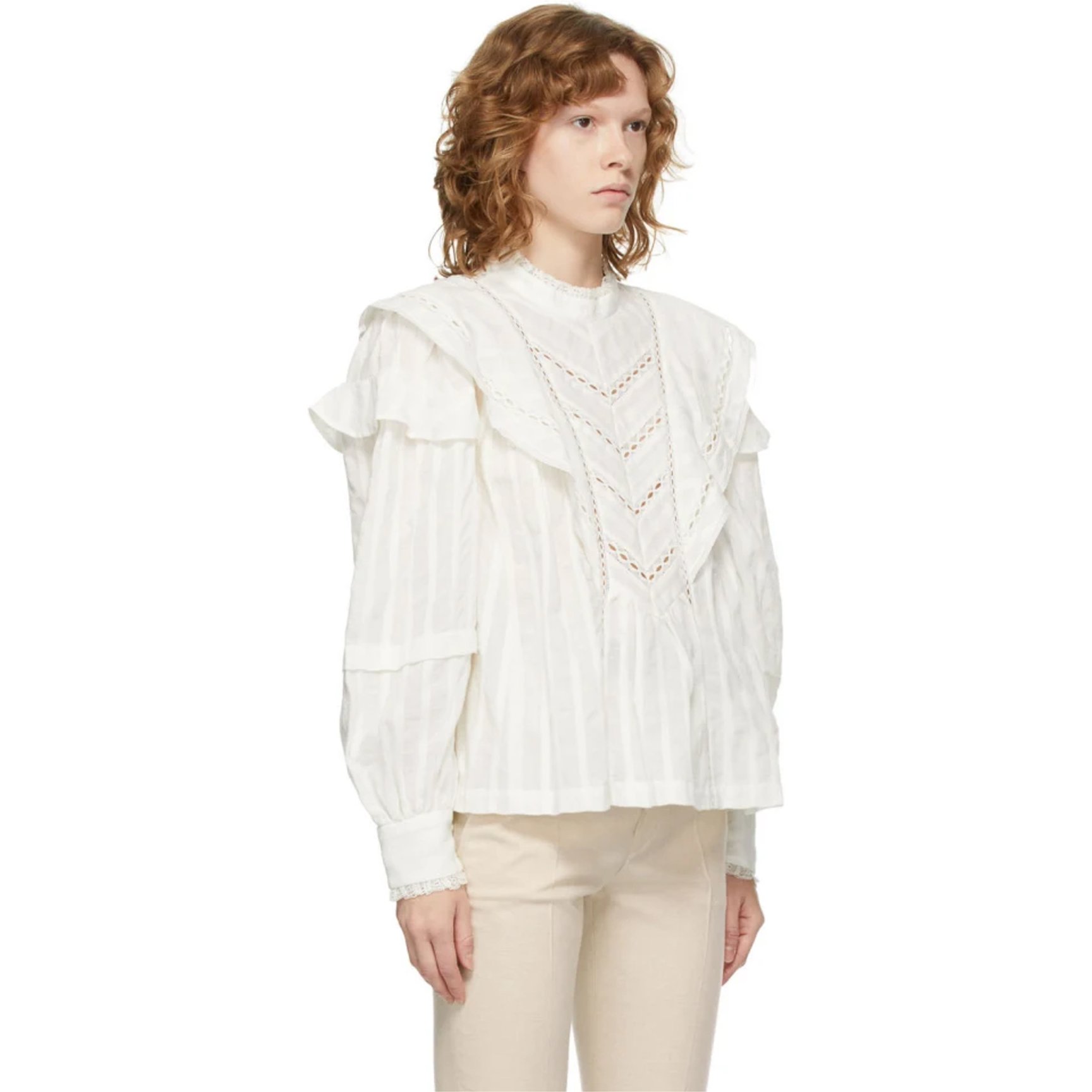 シティライクでありながら、どこか懐かしさも感じる「イザベルマランエトワール(Isabel Marant Étoile)」のブラウス。甘くなりすぎない絶妙なバランスで肌触りのいいコットン生地とレースを組み合わせ、首まわりの大きなフリルが動くたび軽やかに揺れる可憐な一着です。