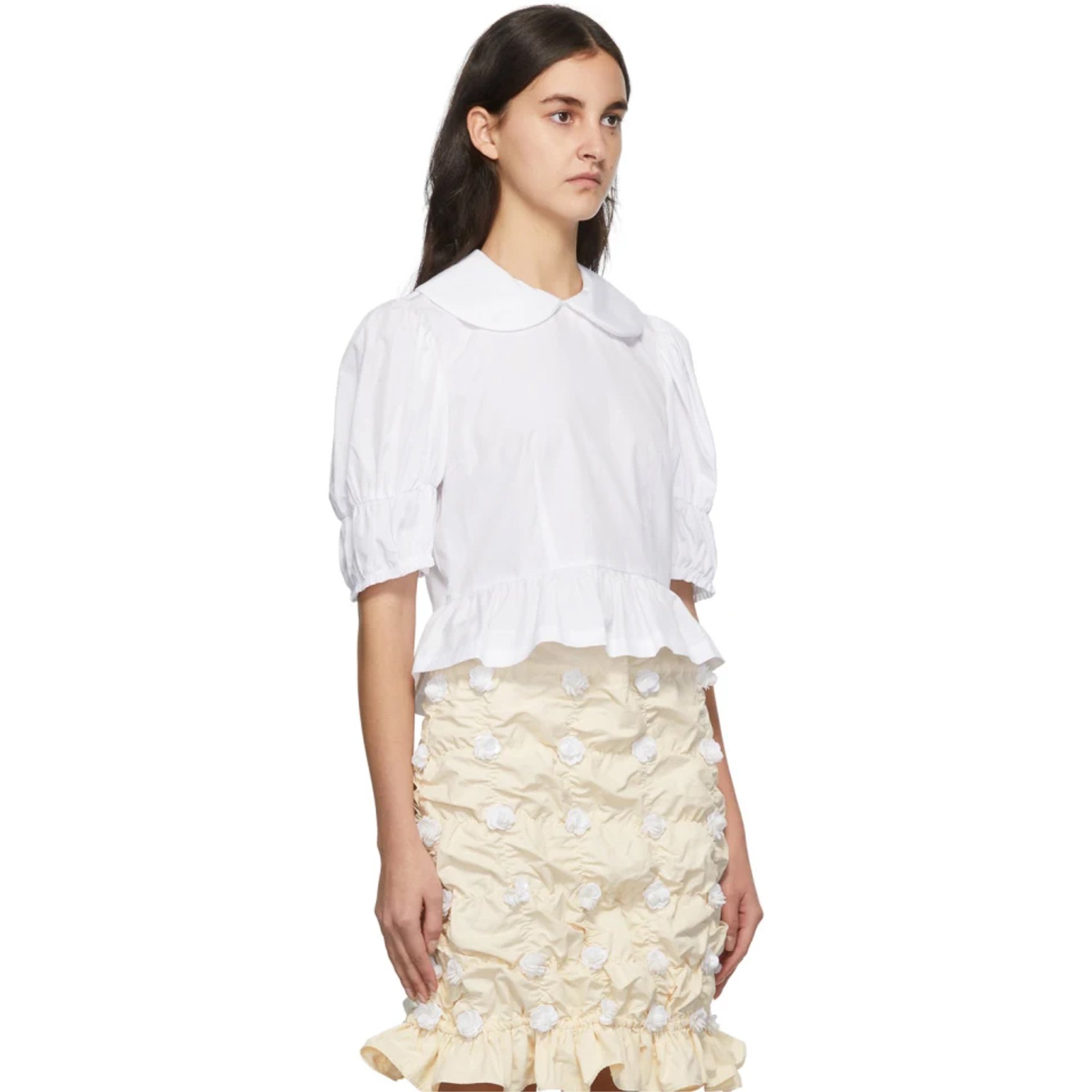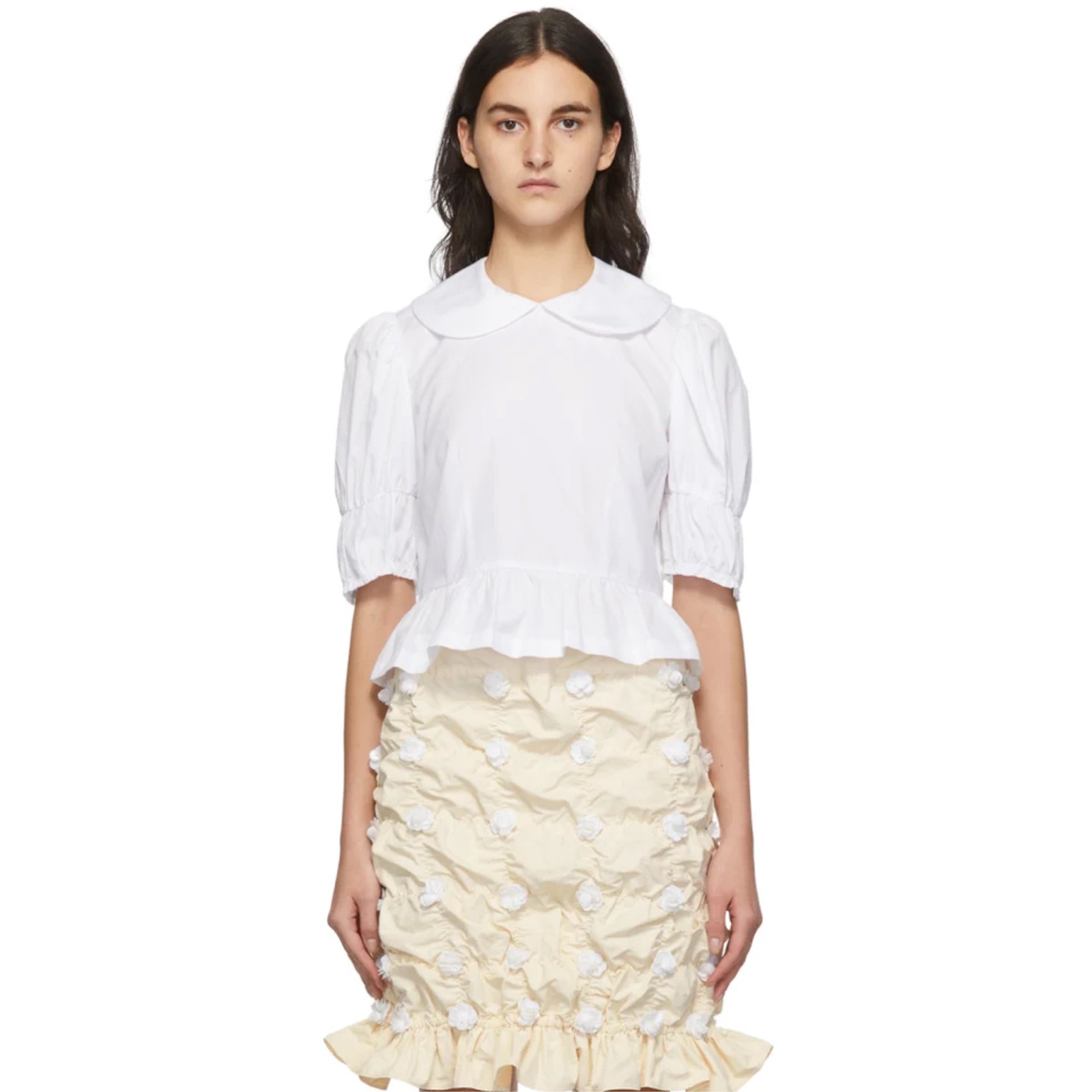 「コム デ ギャルソン ガール(COMME DES GARÇONS GIRL)」のシグネチャーアイテムをピックアップ。制服を思わせる丸襟ブラウスに、パフスリーブやペプラムなどガーリーなディテールをぎゅっと詰め込んだデザインが魅力的。カジュアルなデニムなどとも好相性。