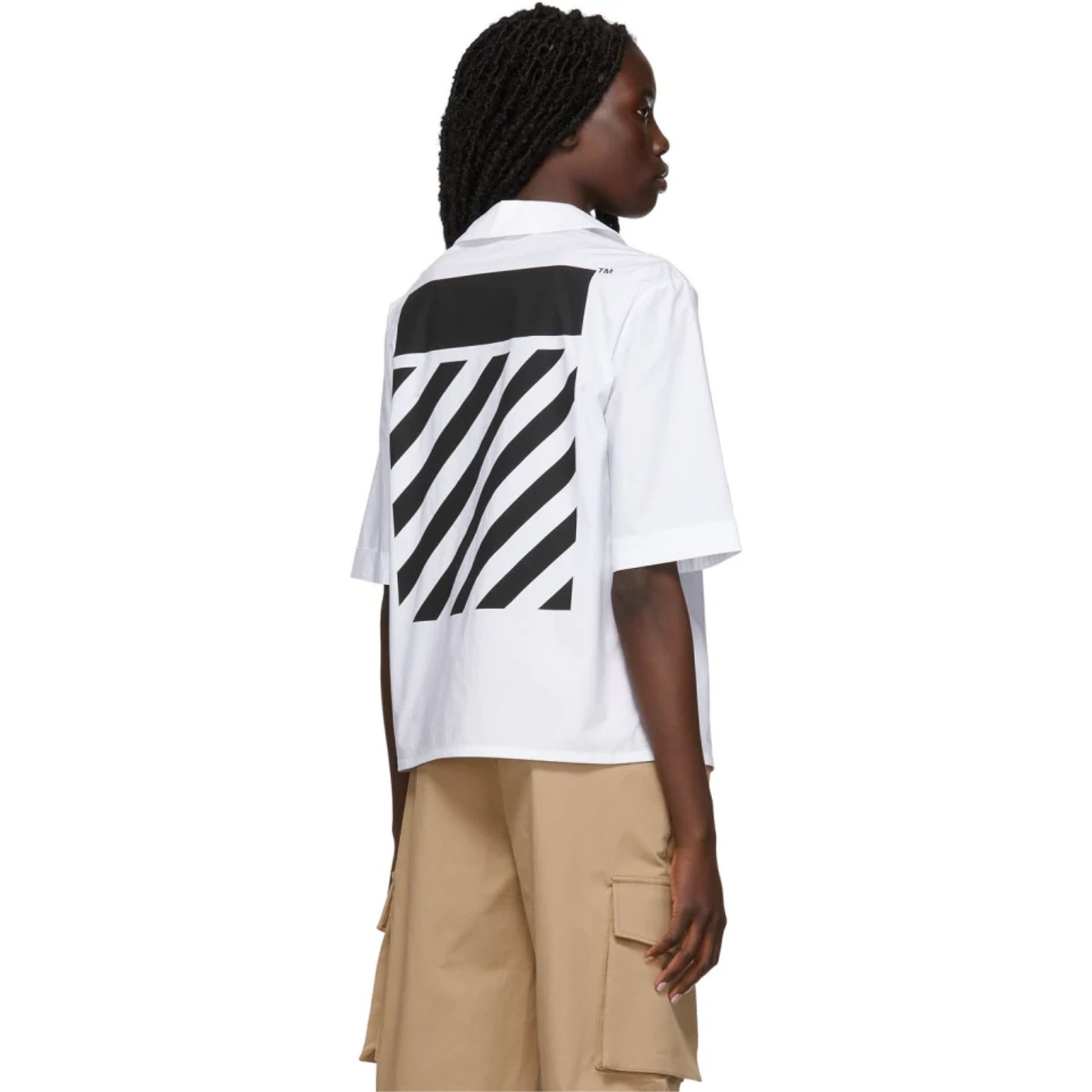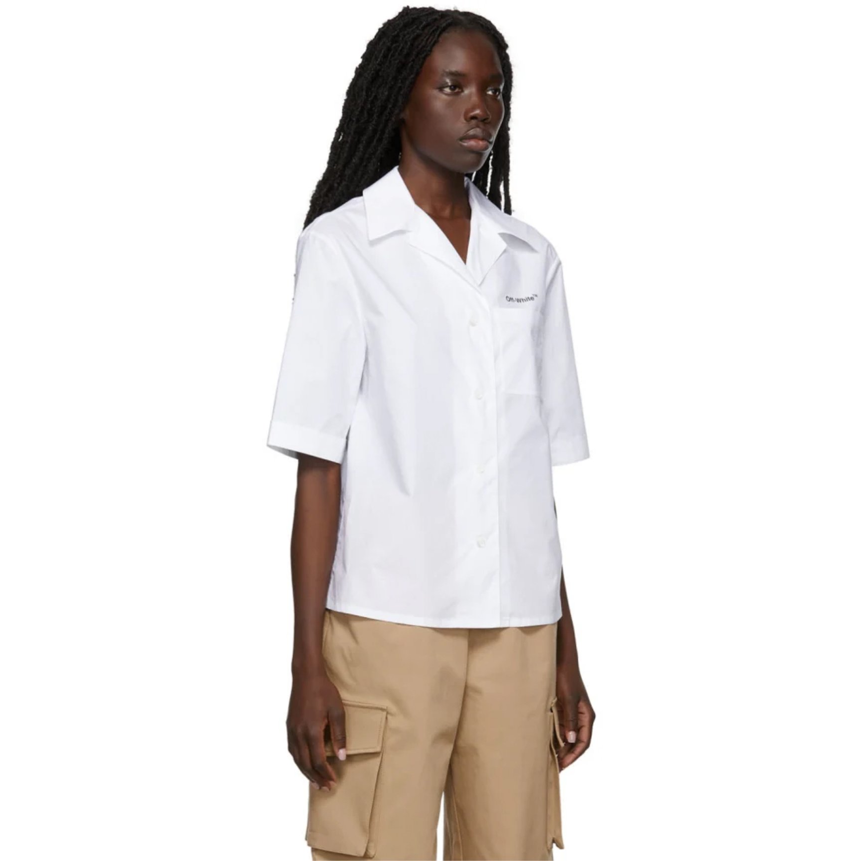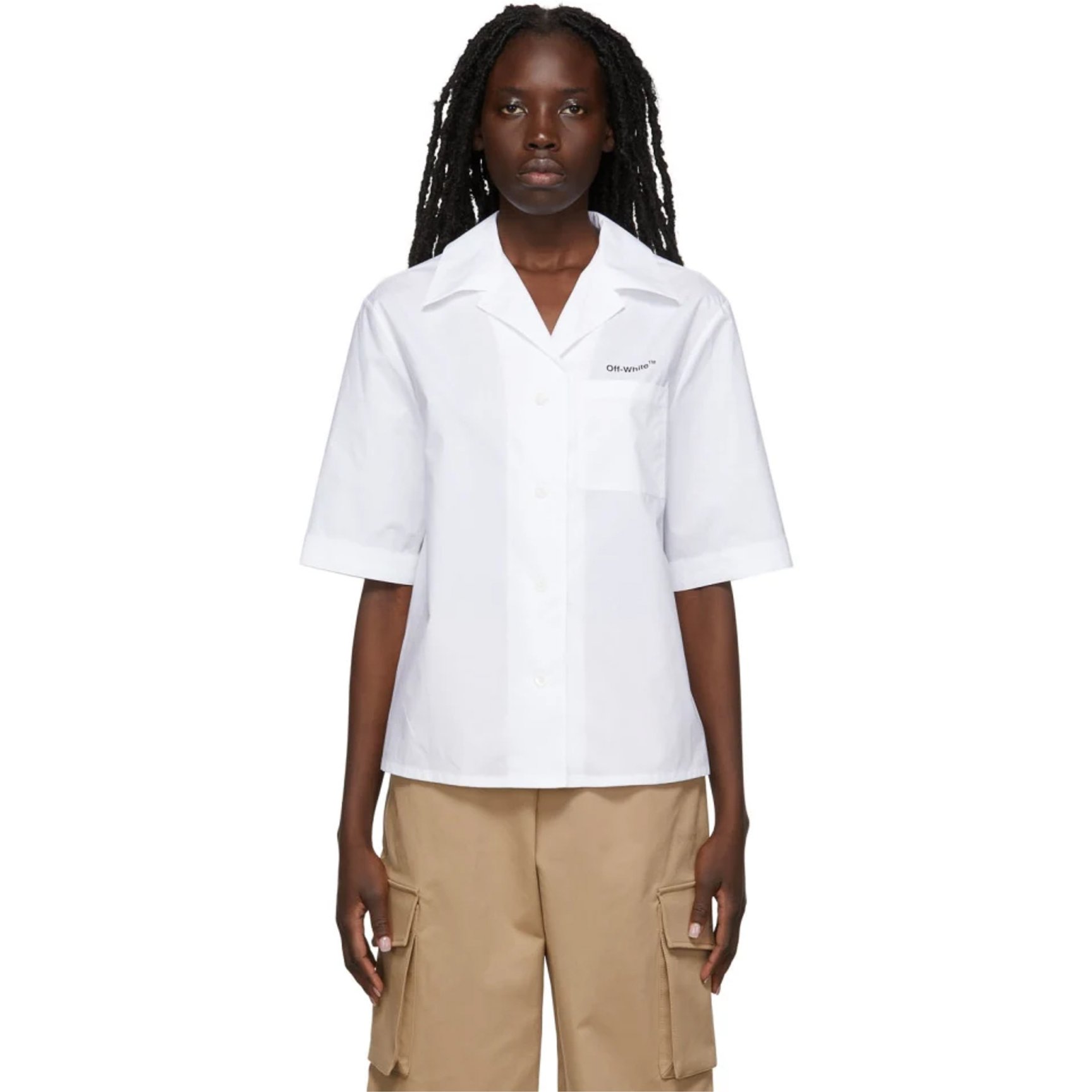 メンズライクな「オフホワイト(OFF-WHITE)」のオープンカラーシャツ。胸元にはポケットと控えめなロゴプリントを、背面にはシグネチャーラインをプリントとブランドらしいストリートテイストなデザイン。ゆったりとした5分丈の袖のシャツはレイヤードとも相性が良く、シーズン問わず活躍してくれそう。