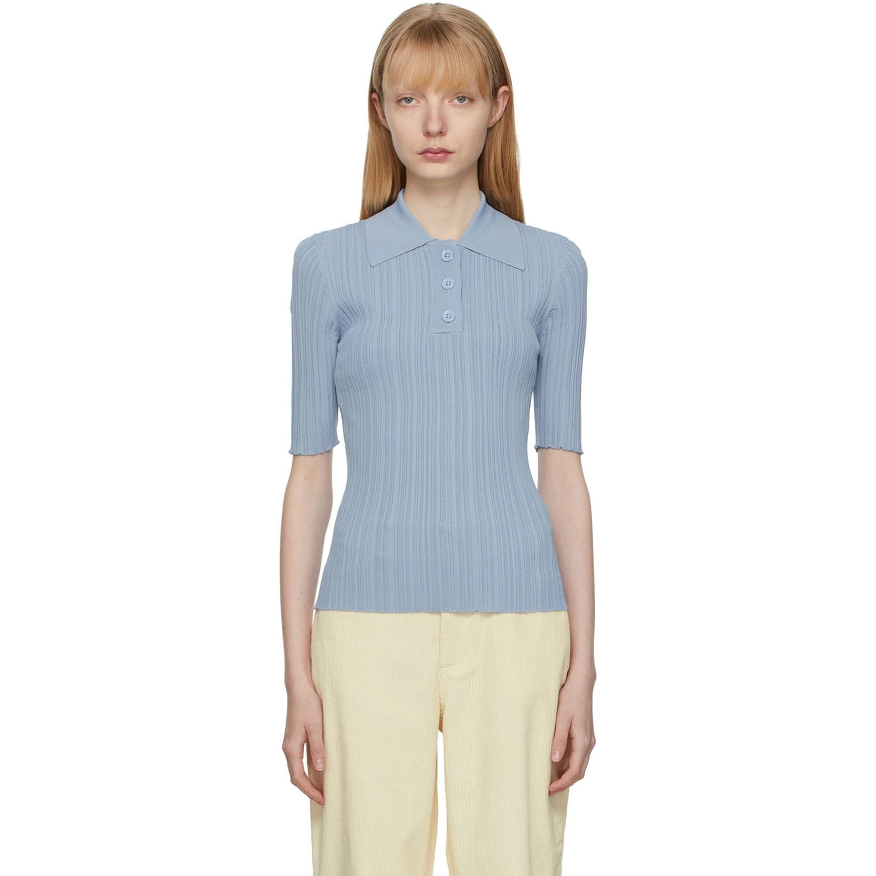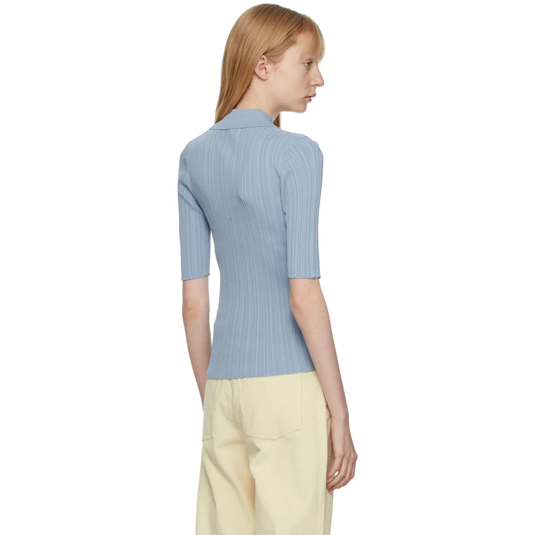 淡いブルーカラーと女性らしいベーシックなデザインが着回し力抜群のニットポロシャツは、オスロを拠点とするブランド「ホルツワイラー(HOLZWEILER)」のもの。薄めの素材かつ大きめの襟、そして袖口と裾のレスタエッジが女性らしいルックを叶えます。パンツにもスカートにも合わせやすい、シンプルかつ控えめなカラーとデザインがグッドです。